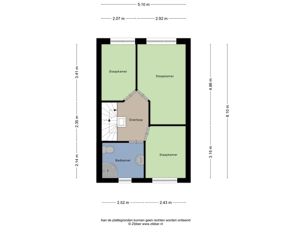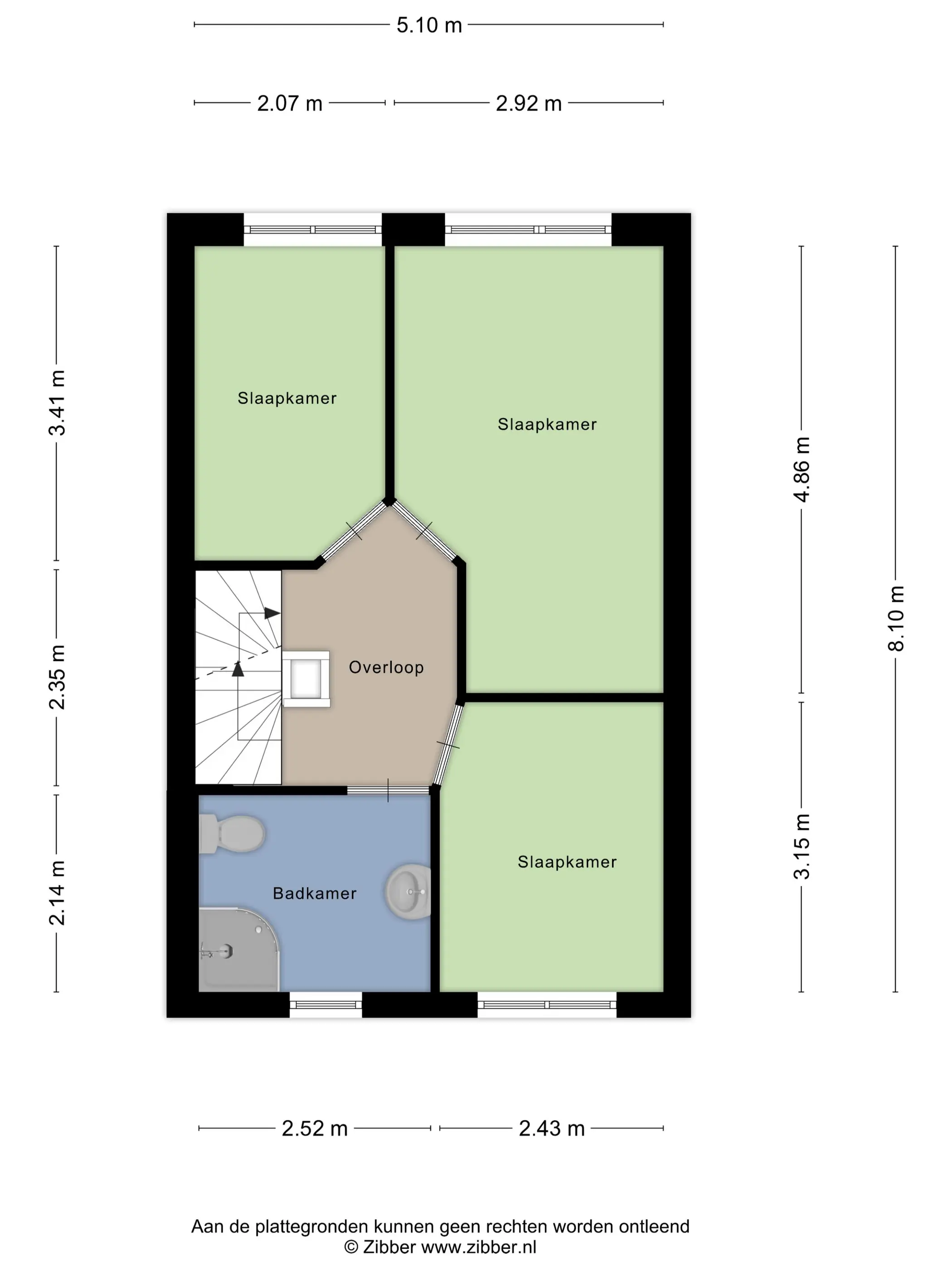 Vanuit de hal lopen we via de trap naar de eerste verdieping, waar drie slaapkamers te vinden zijn van respectievelijk 13, 7 en 7 m² groot. Allemaal fijne, lichte kamers. Aan de voorzijde bevindt zich de badkamer, voorzien van een douchecabine, wastafel met mengkraan, planchet en spiegel. Hier bevindt zich ook het tweede toilet.