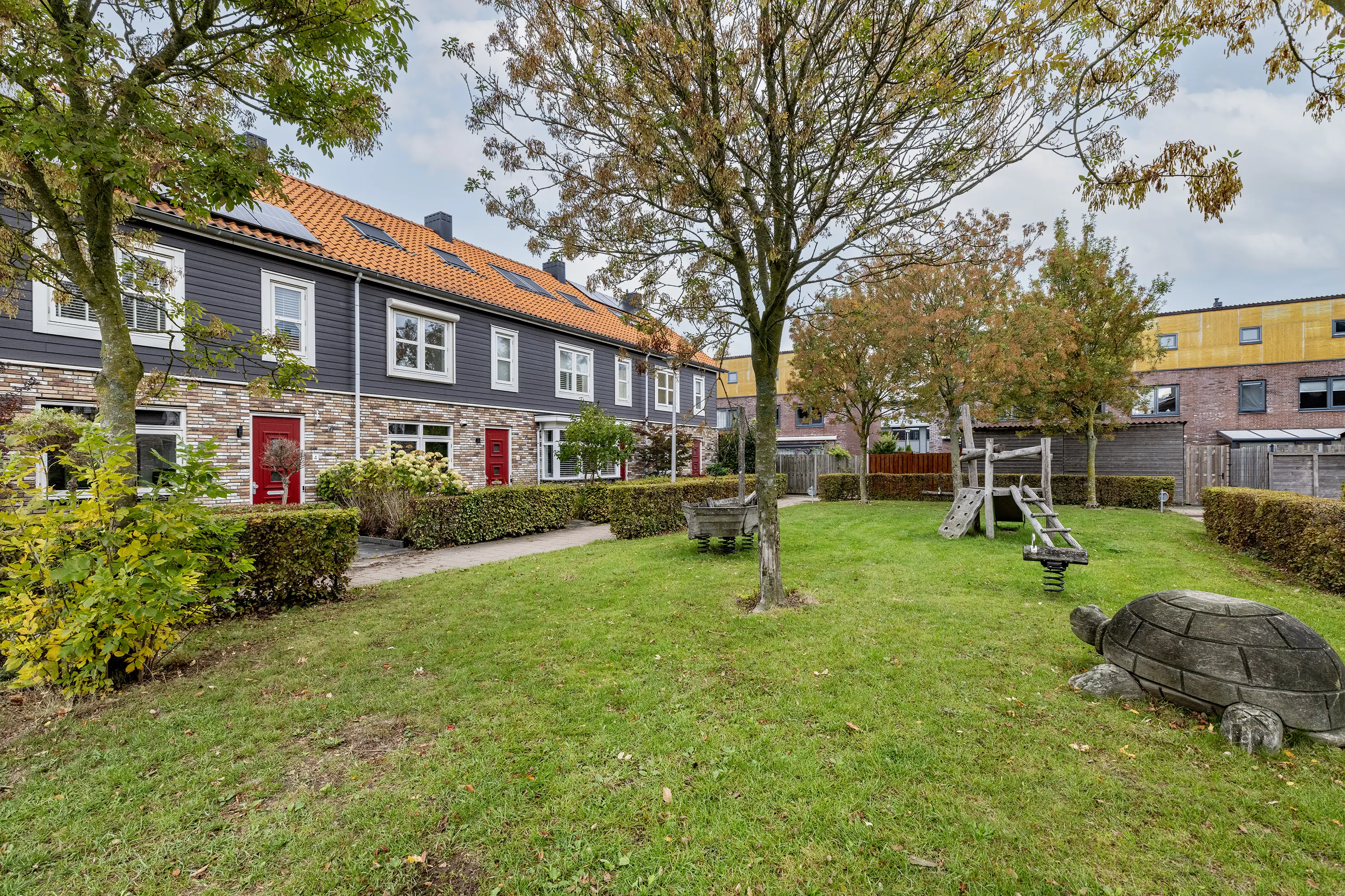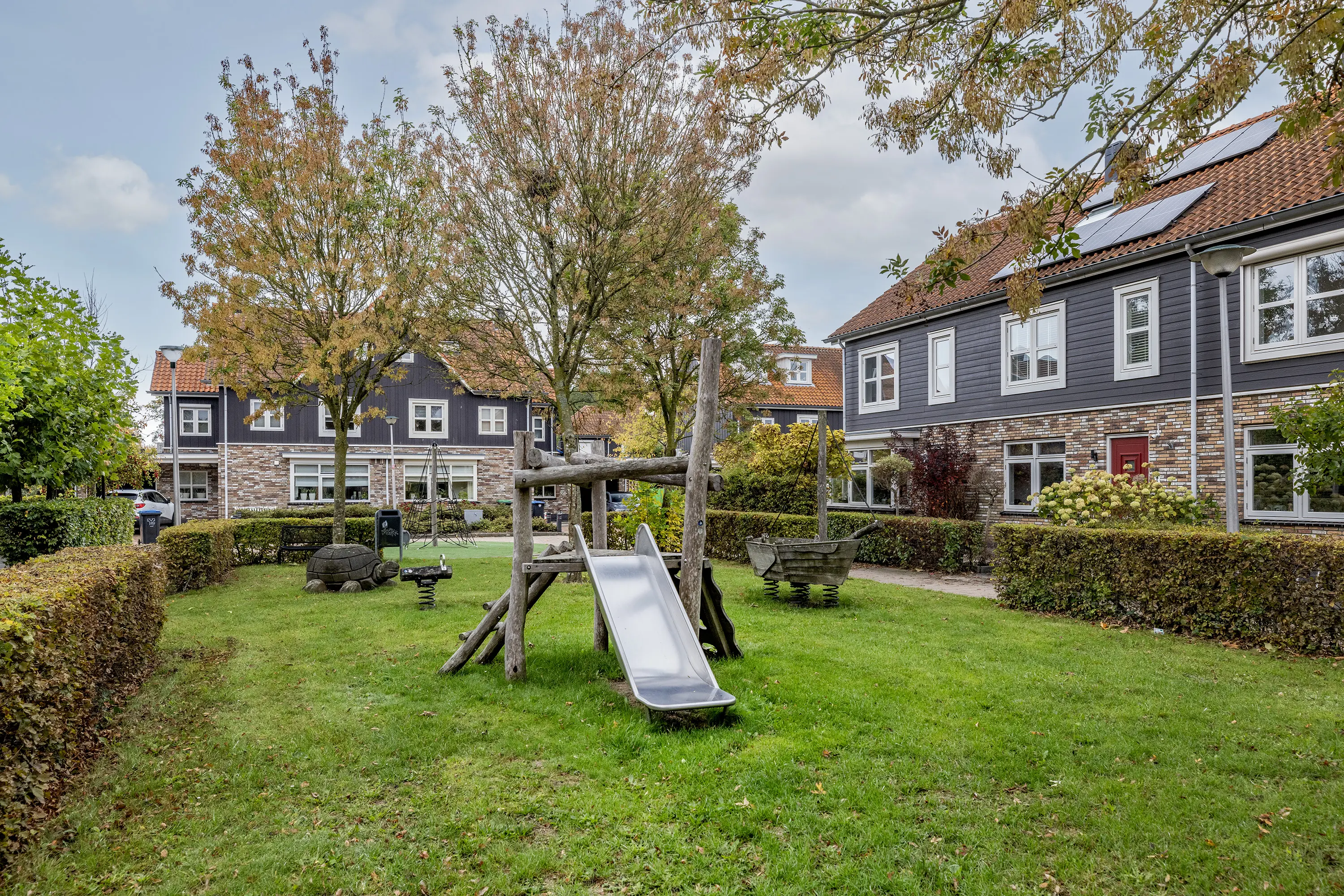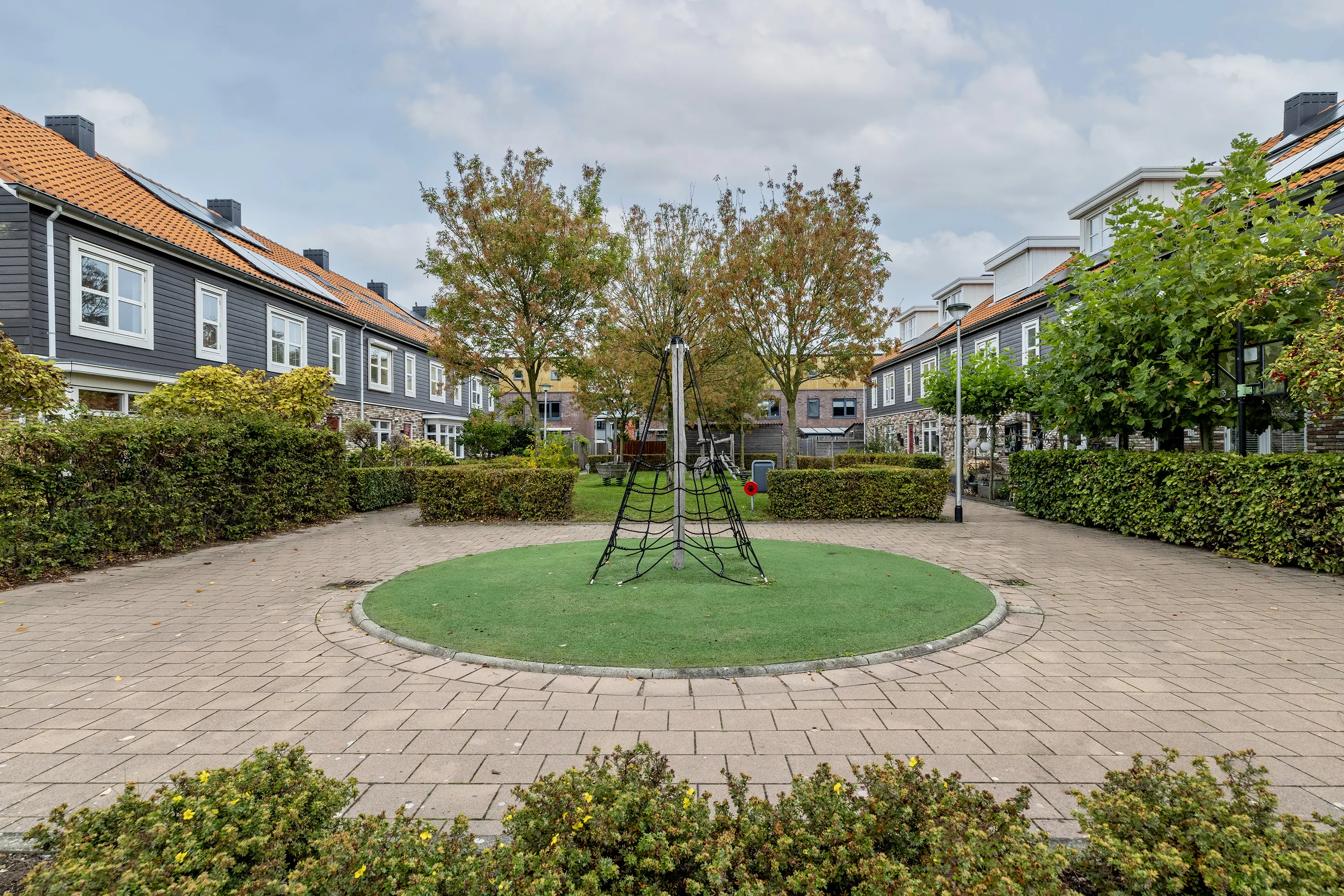 Aan de voorzijde grenst de woning aan een rustig speelveldje, waar kinderen uit de buurt veilig en met plezier kunnen spelen. De achtertuin is een oase van rust en groen, een heerlijke plek om te ontspannen, met prachtige beplanting en sfeervolle verlichting.