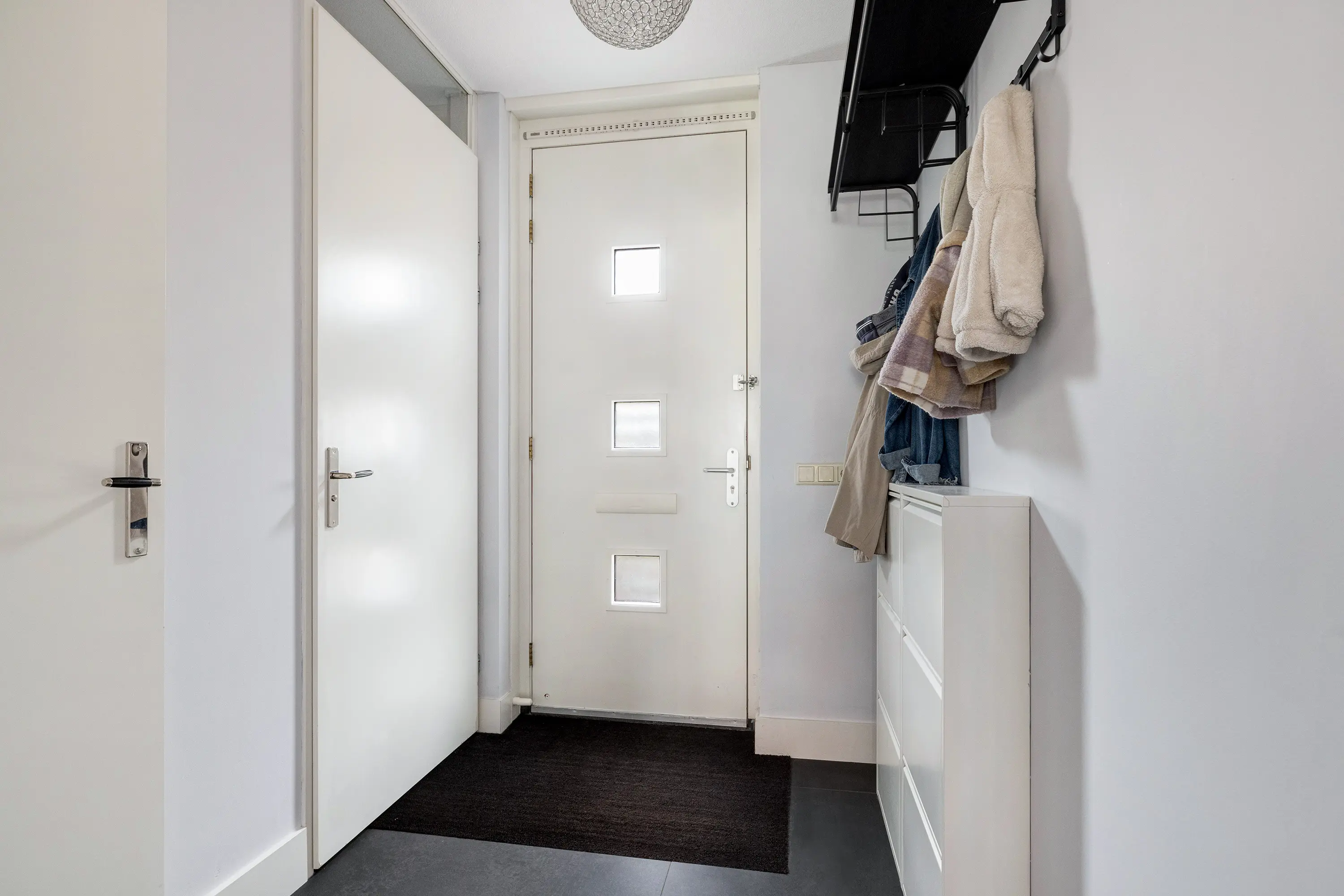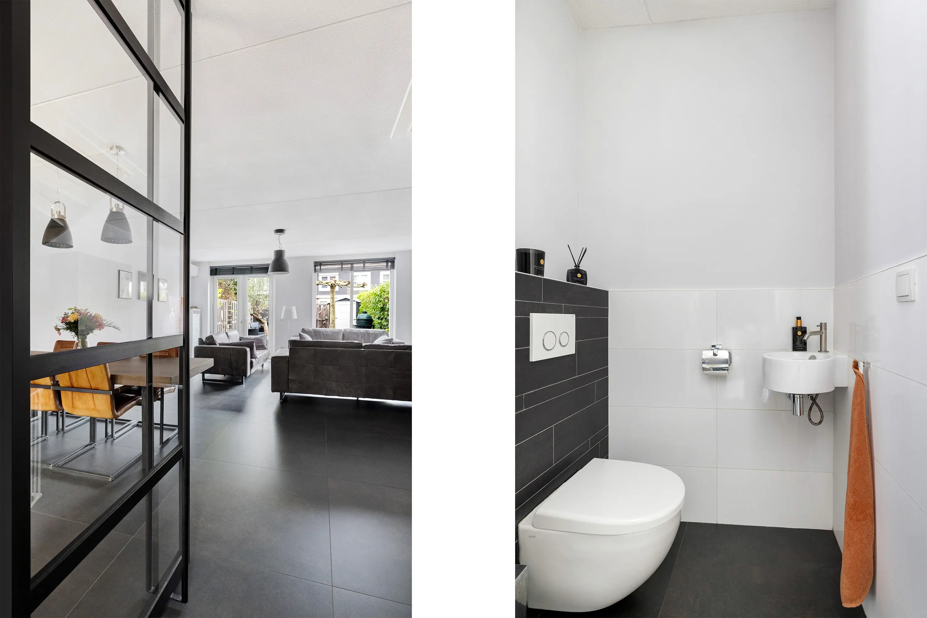 Via de verzorgde voortuin betreedt u de woning. In de hal valt direct de moderne zwarte stalen taatsdeur op, een echte eyecatcher die perfect past bij de hoogwaardige afwerking van de woning. Hier bevinden zich tevens een ruime garderobekast, de meterkast en een modern toilet met hangend closet en fonteintje, uitgevoerd in een stijlvolle wit-grijze kleurstelling.