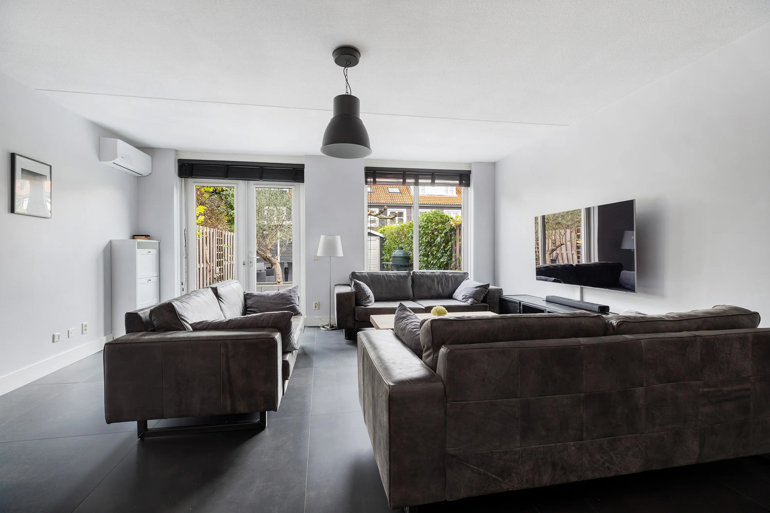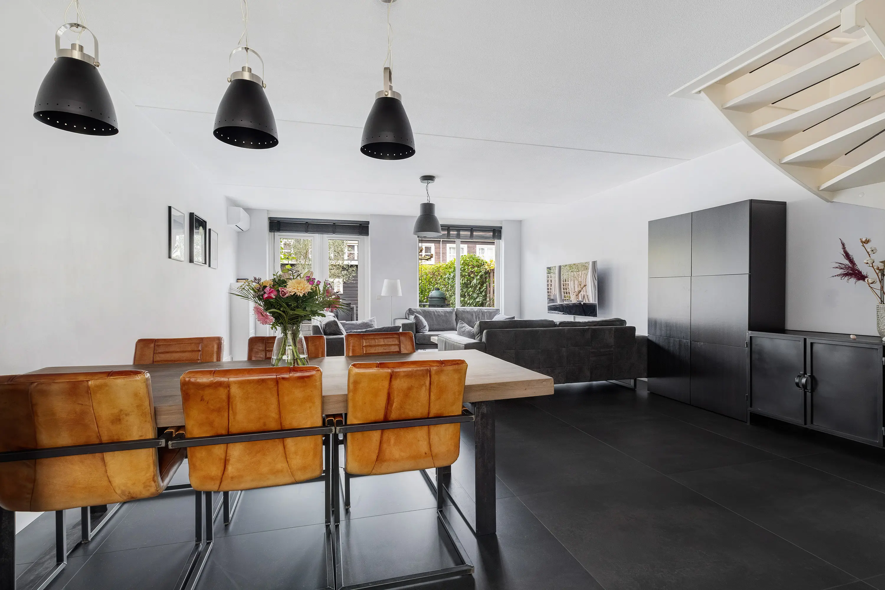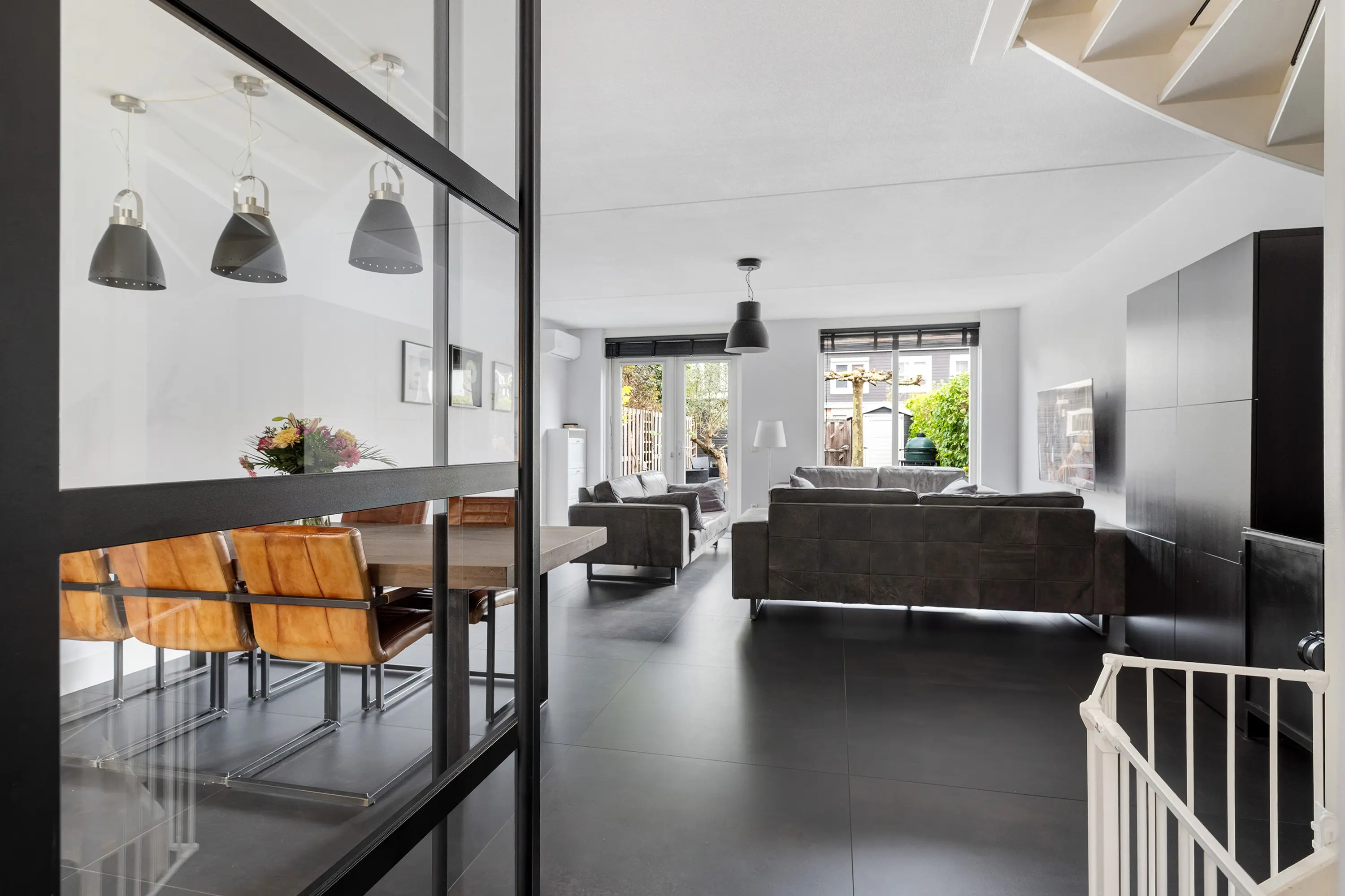 De fraaie taatsdeur geeft toegang tot de lichte, tuingerichte woonkamer (ca. 43 m²). Dankzij de openslaande deuren naar de achtertuin en de grote raampartijen geniet u hier van veel natuurlijk licht. De woonkamer is ruim van opzet, met voldoende plek voor een royale zithoek én een grote eettafel.