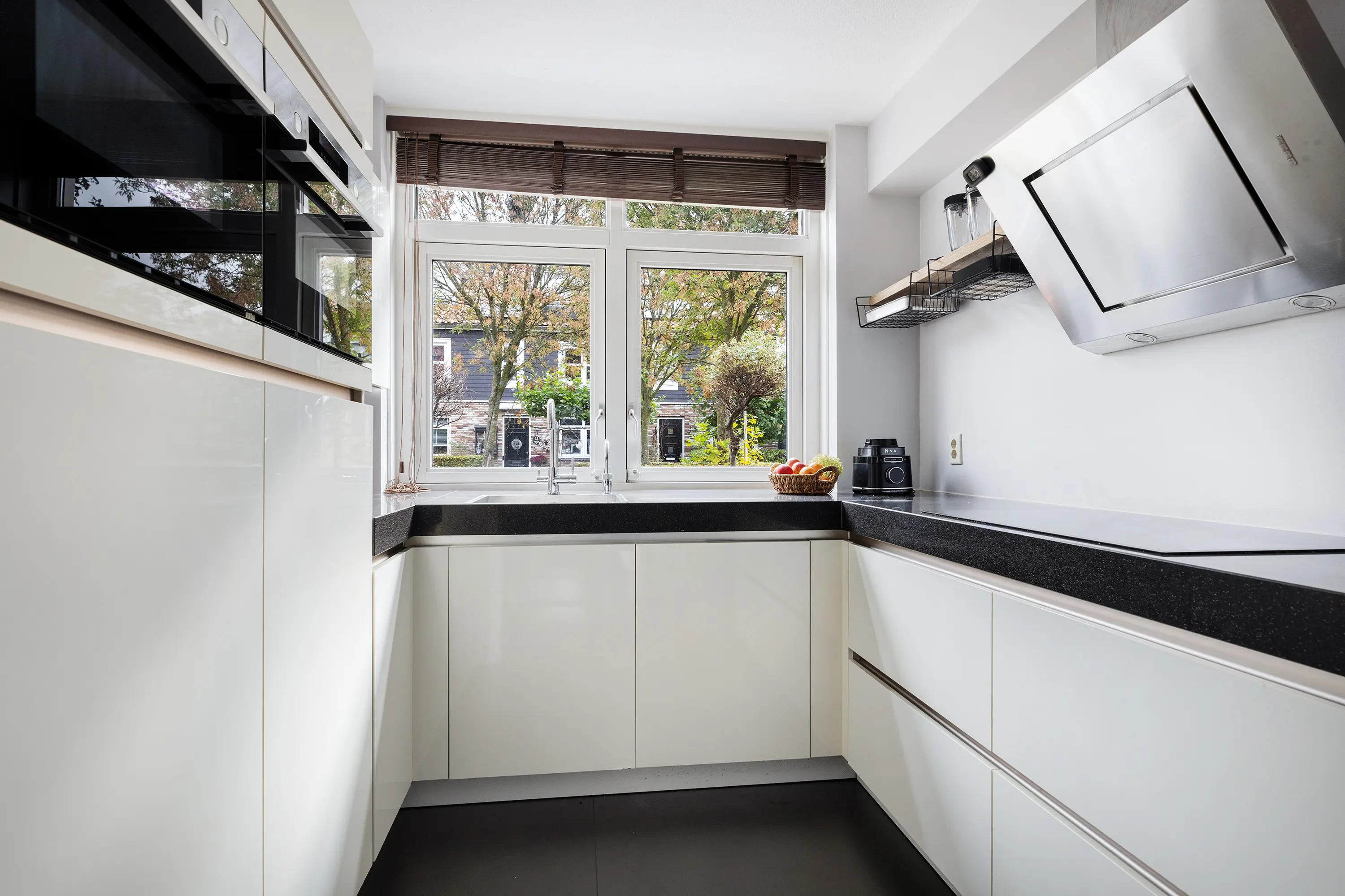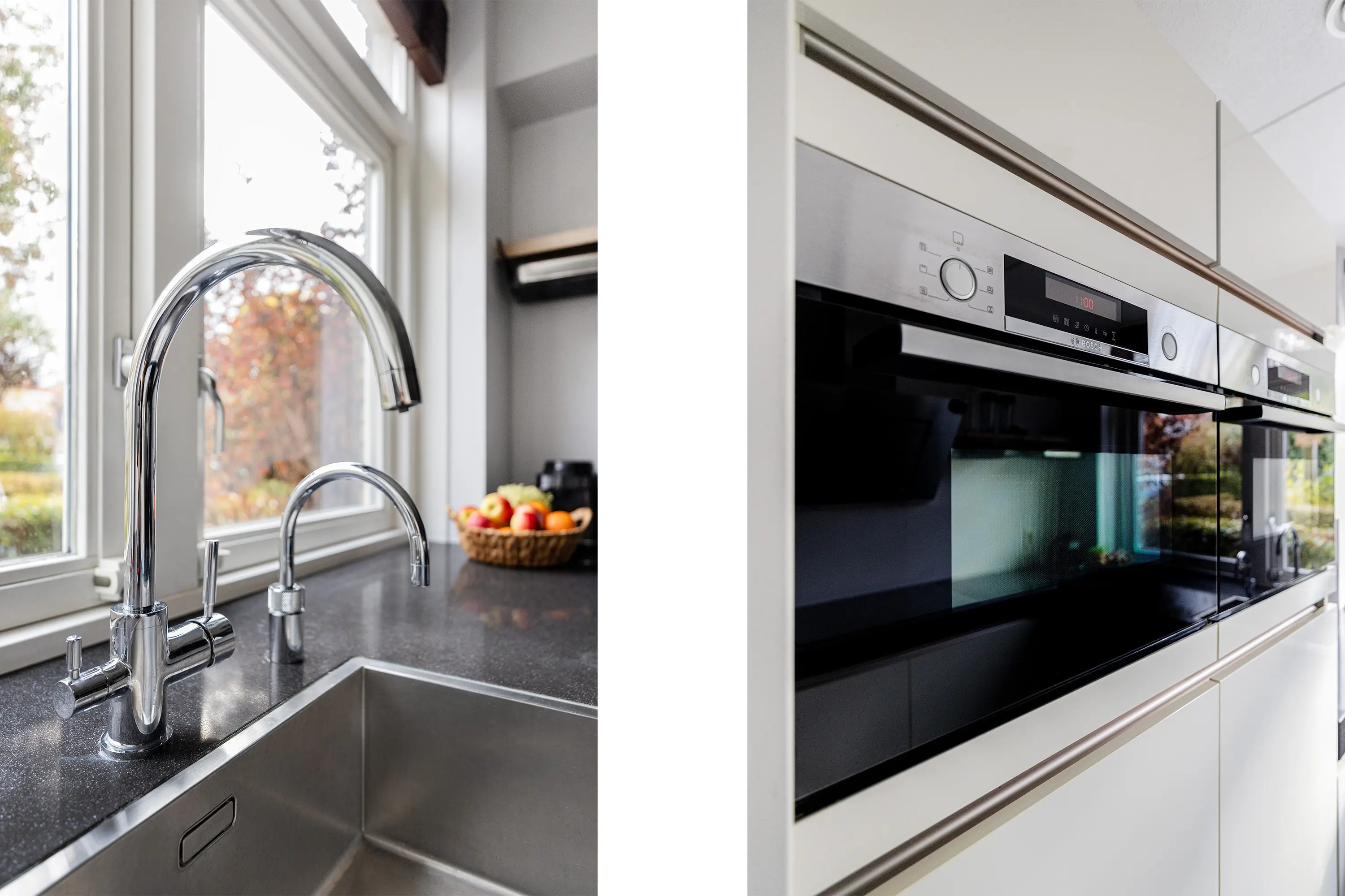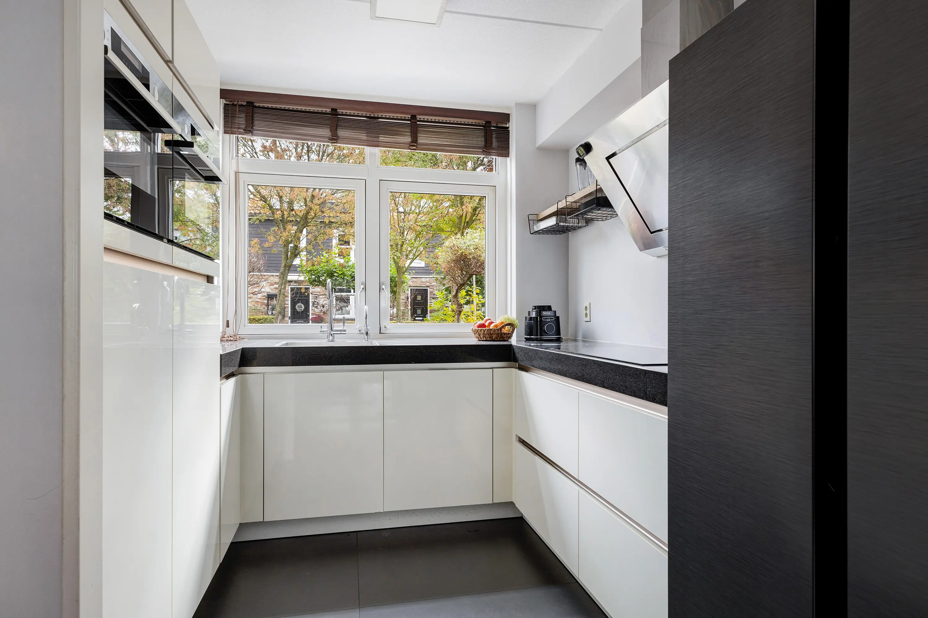 Aan de voorzijde bevindt zich de moderne keuken (ca. 6 m²), opgesteld in een praktische U-vorm en voorzien van alle denkbare inbouwapparatuur: twee combimagnetrons, Quooker, vaatwasser, koelkast, vriezer, 4-pits inductiekookplaat en een RVS afzuigkap. De wit hoogglans fronten en het zwarte composiet aanrechtblad geven de keuken een luxe uitstraling.