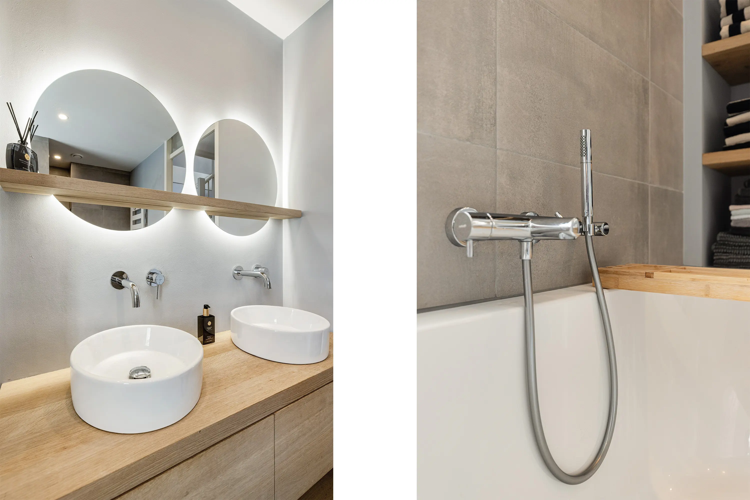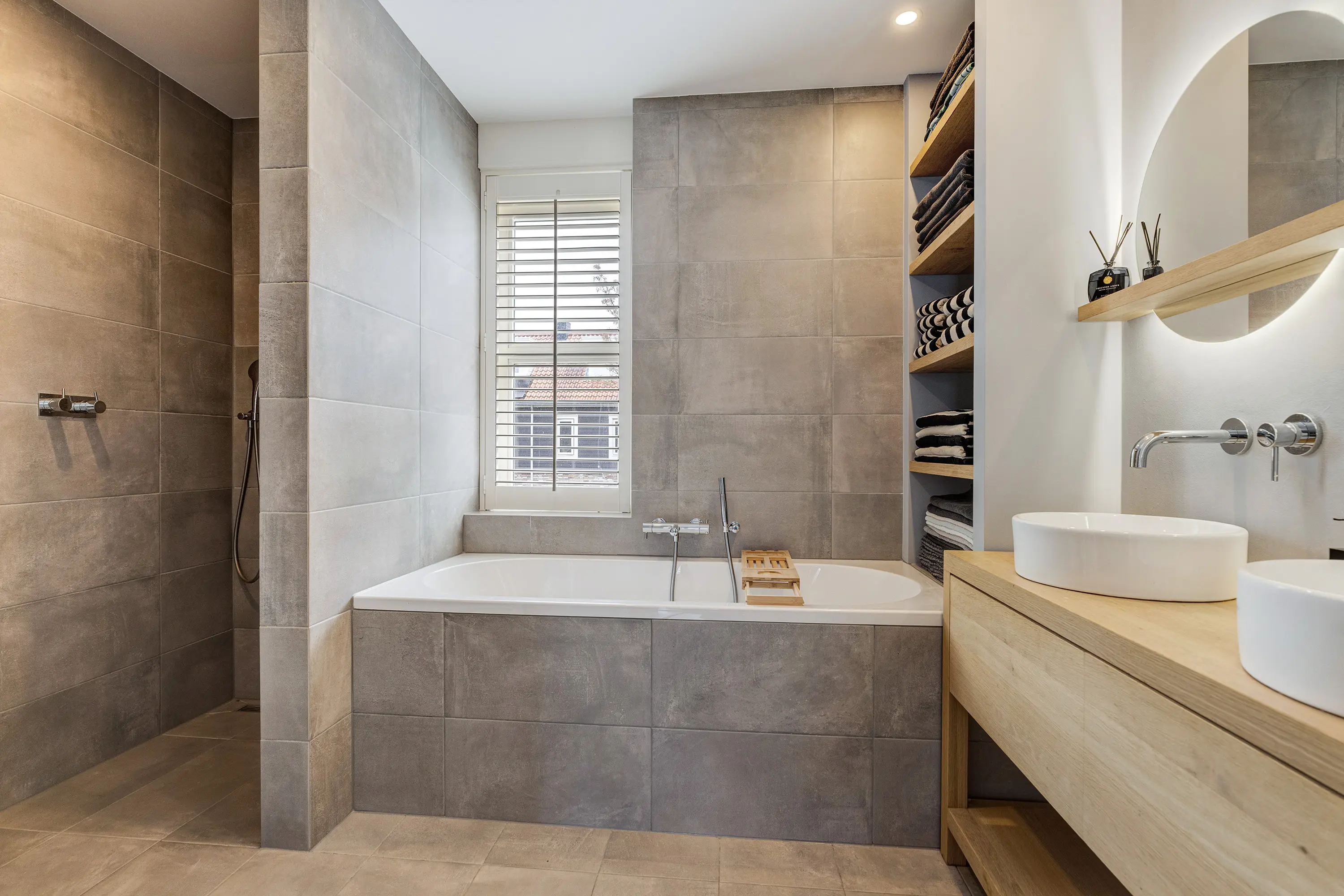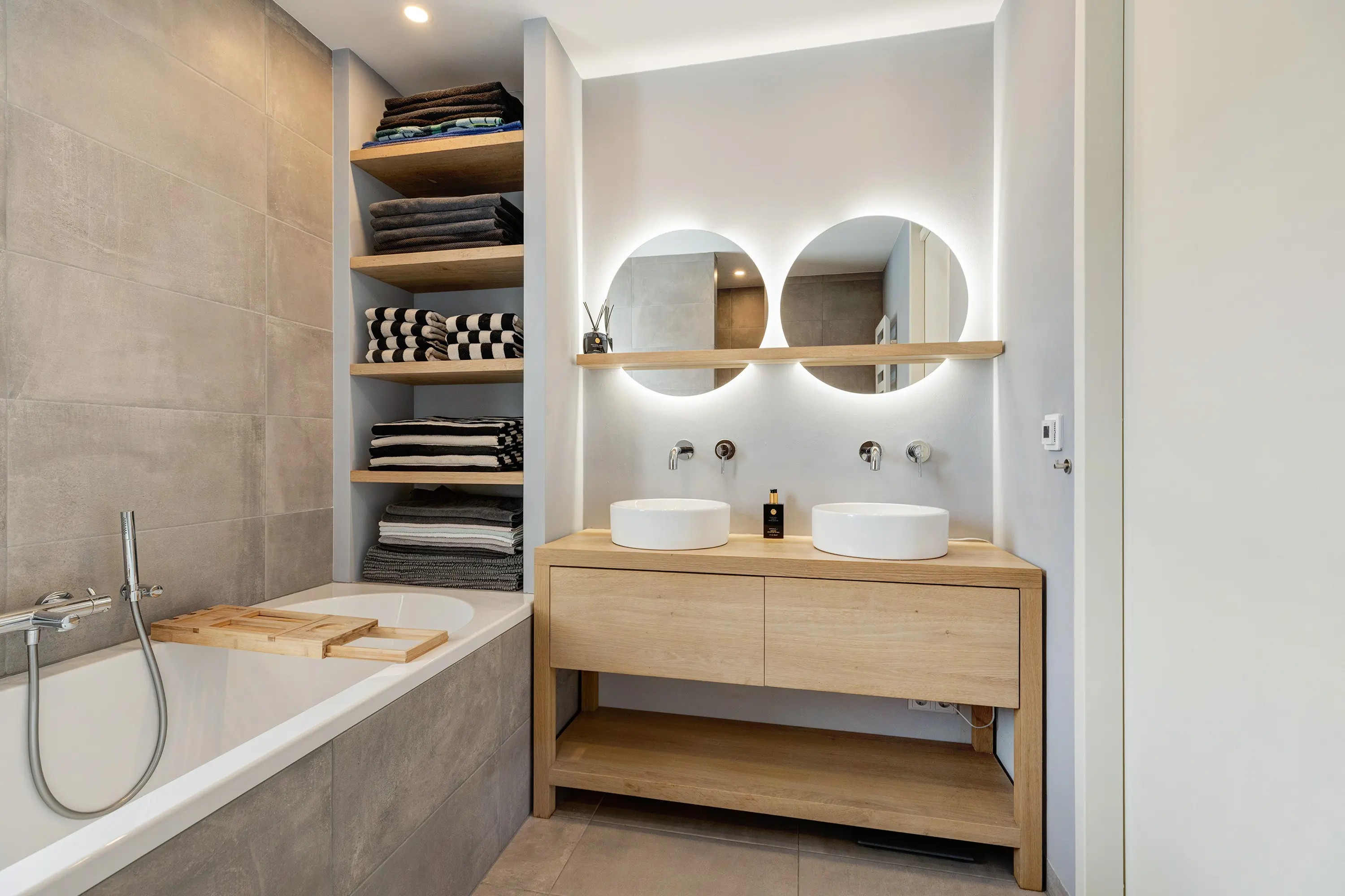 De luxe badkamer (ca. 7 m², vernieuwd in 2019) is een waar wellness-verblijf. Met een ligbad, inloopdouche met regendouche en handdouche, een dubbel houten wastafelmeubel met twee waskommen, hangend toilet en vloerverwarming. De afwerking in wit, grijs en houttinten creëert een moderne, warme uitstraling.