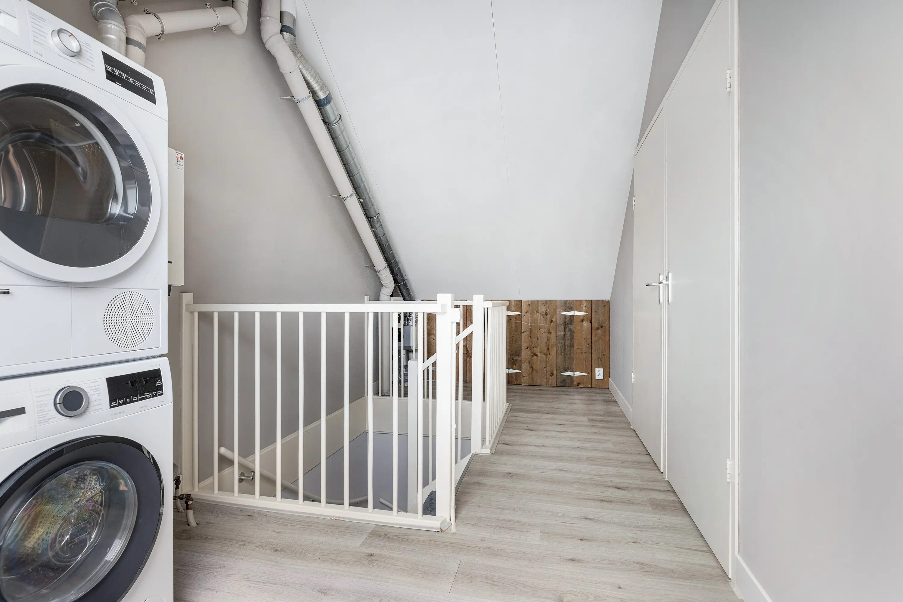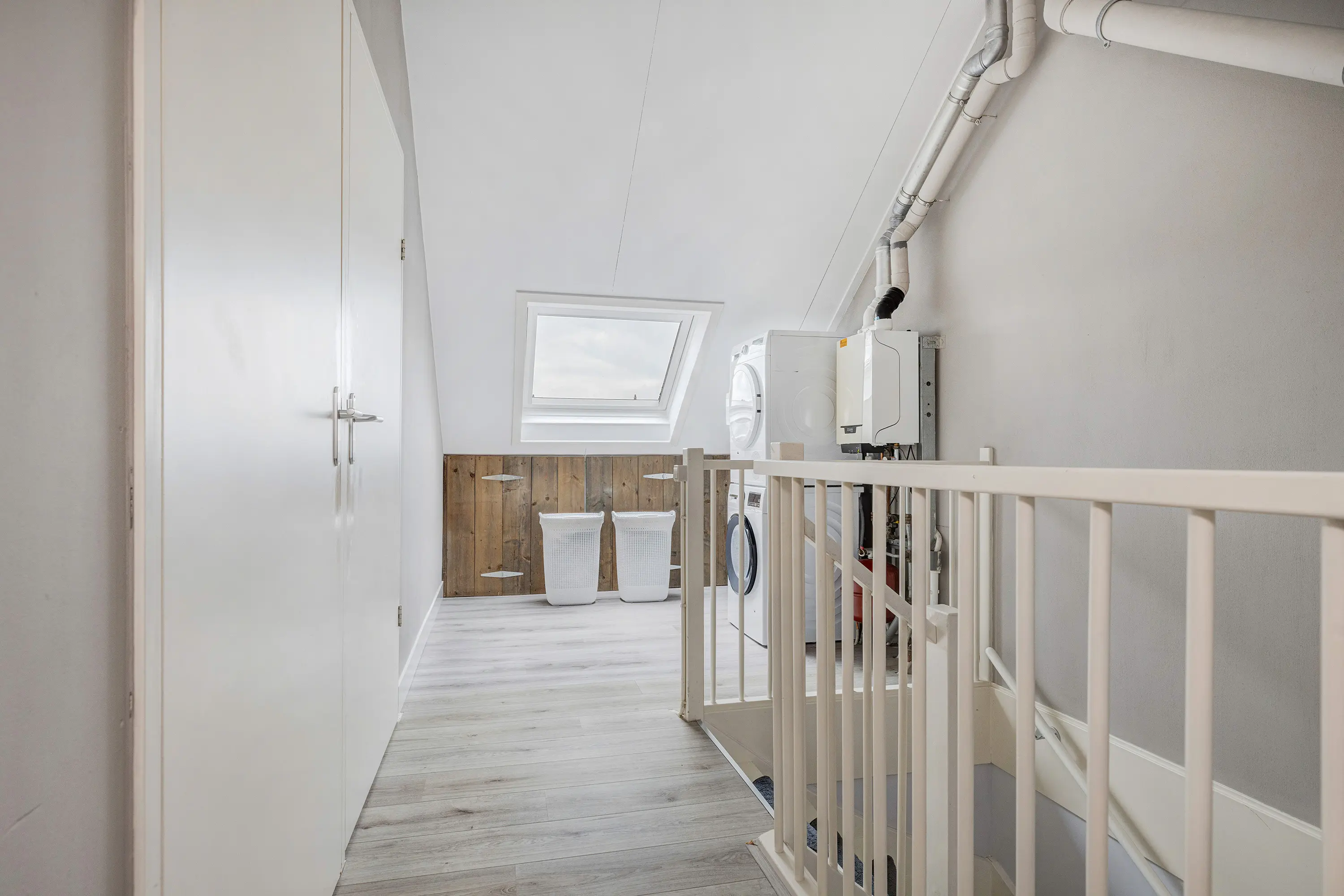 De voorzolder biedt plaats aan de C.V.-ketel (2016), mechanische ventilatie, aansluitingen voor wasmachine en droger, én handige bergruimte achter de knieschotten.