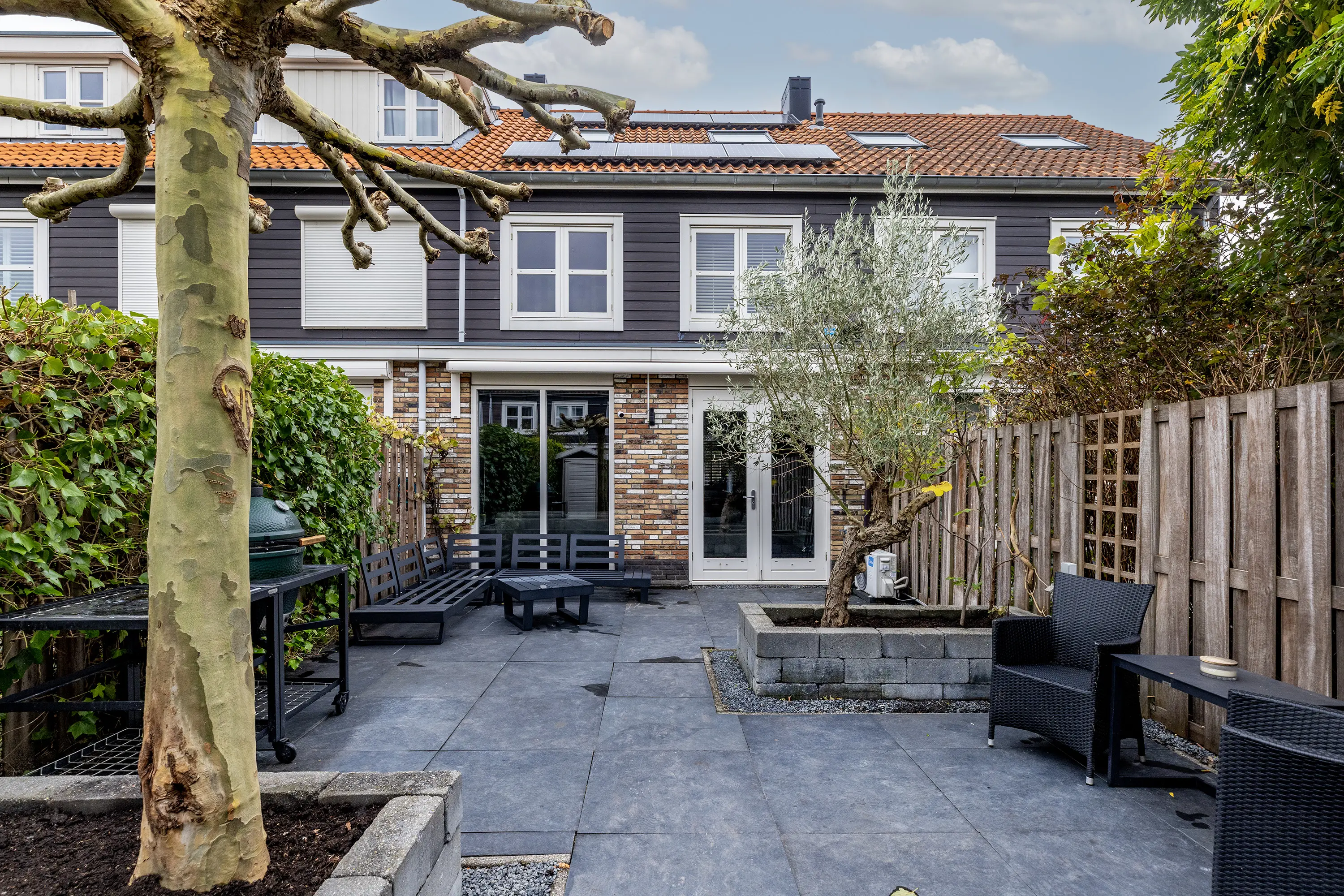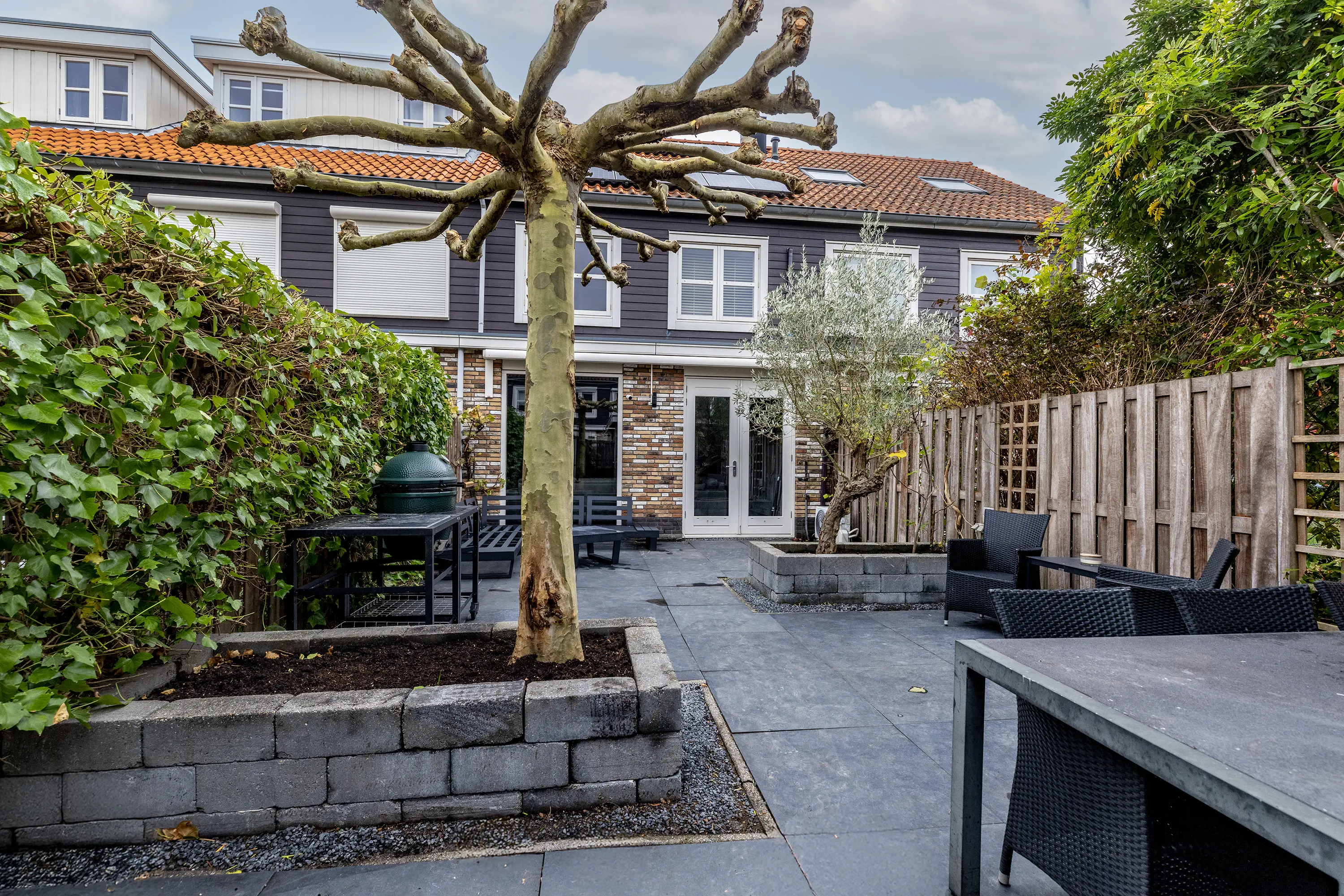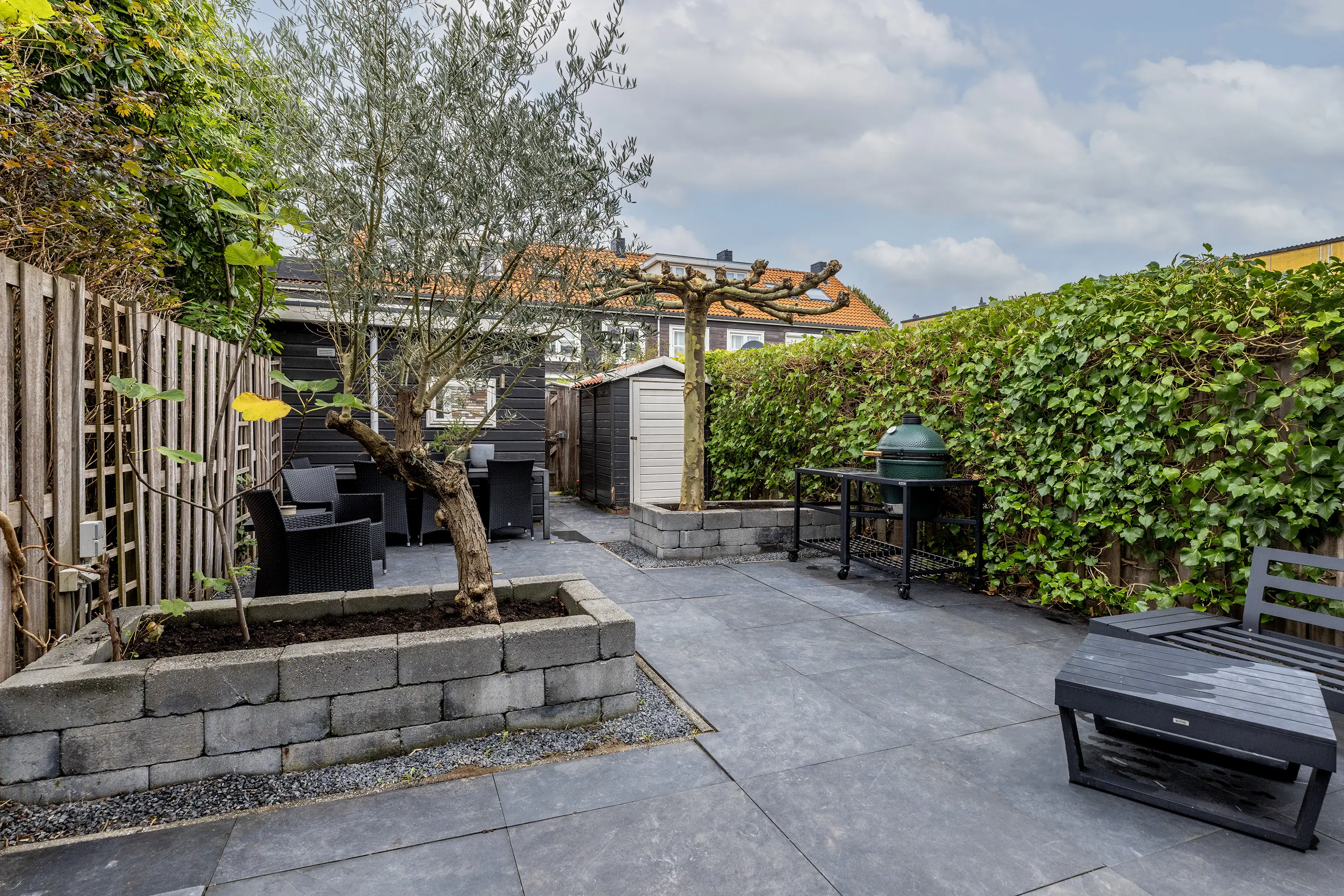 Via de openslaande deuren bereikt u de sfeervol aangelegde achtertuin, een waar verlengstuk van de woonkamer. De fraaie dakplataan biedt in de zomer heerlijke schaduw, terwijl de olijfboom en sfeervolle verlichting voor een mediterrane ambiance zorgen. Achterin bevinden zich een vaste houten berging, een extra berging én een achterom.