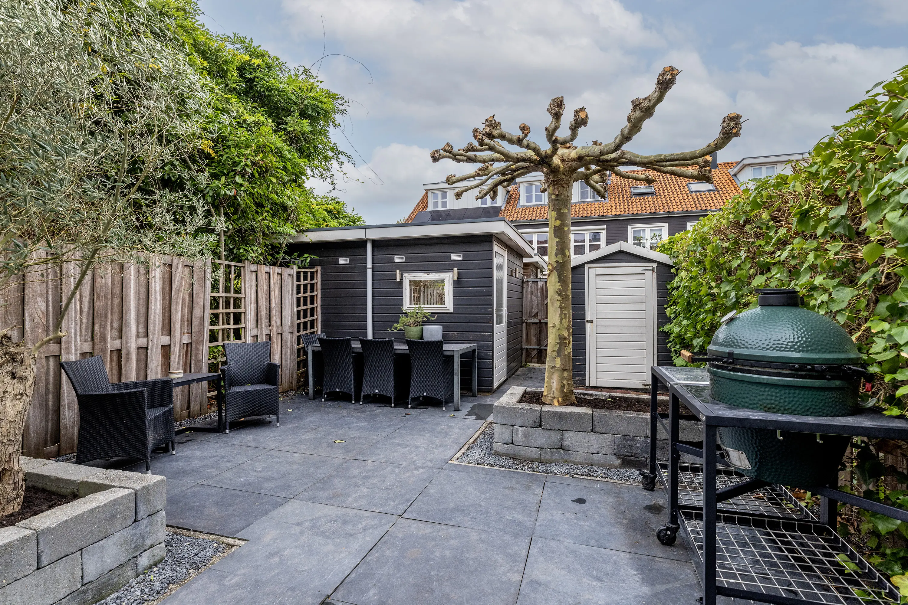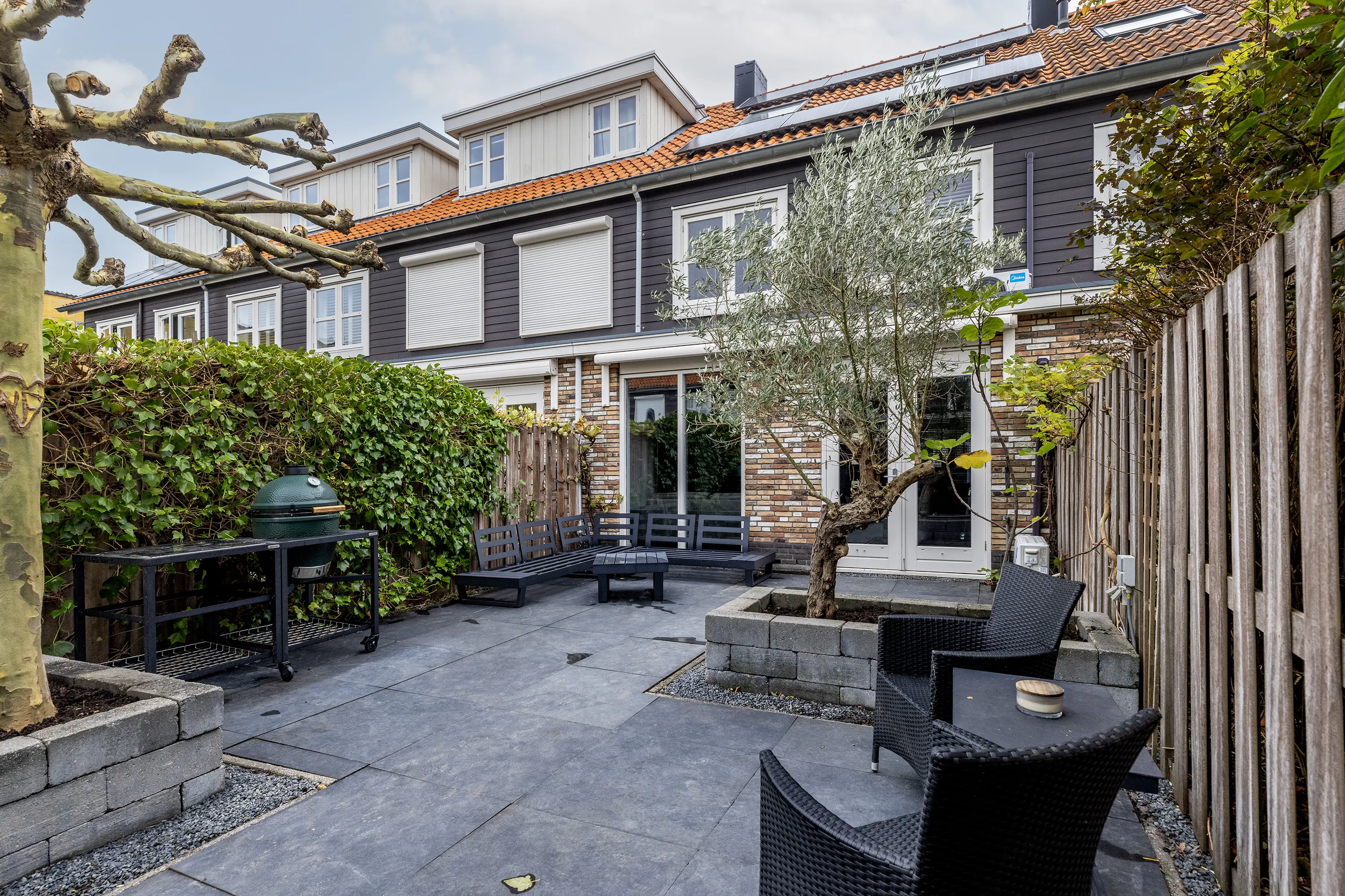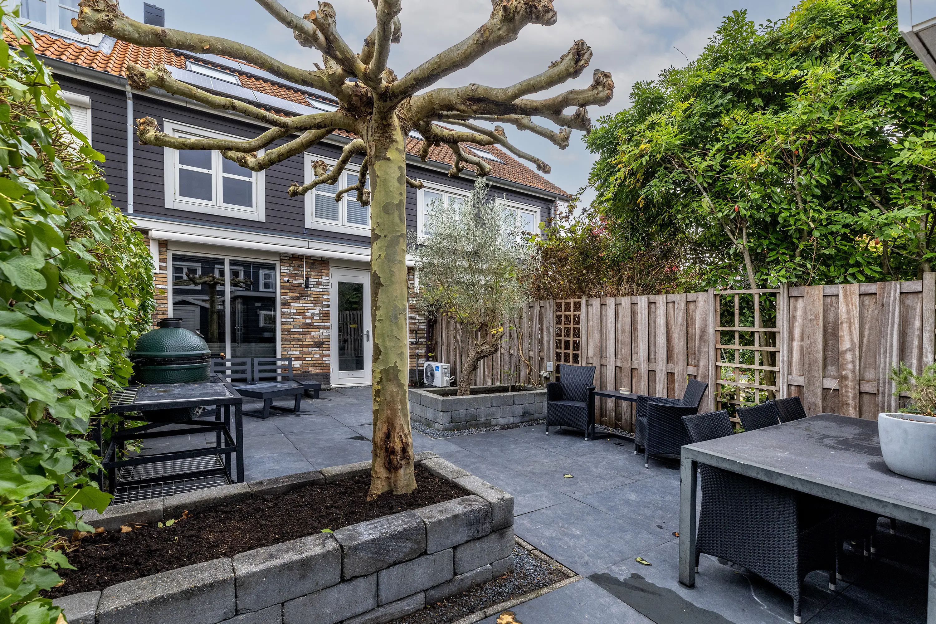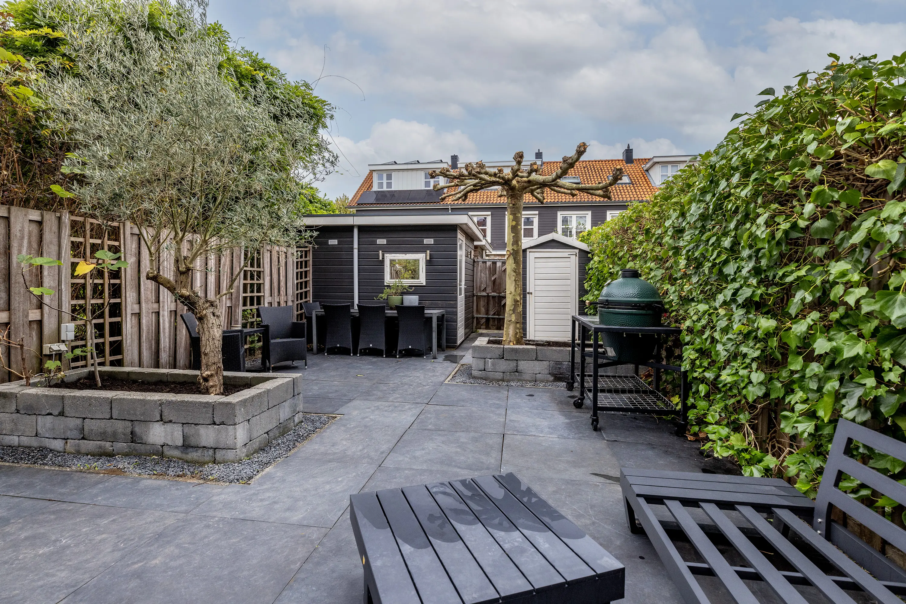 Via de openslaande deuren bereikt u de sfeervol aangelegde achtertuin, een waar verlengstuk van de woonkamer. De fraaie dakplataan biedt in de zomer heerlijke schaduw, terwijl de olijfboom en sfeervolle verlichting voor een mediterrane ambiance zorgen. Achterin bevinden zich een vaste houten berging, een extra berging én een achterom.