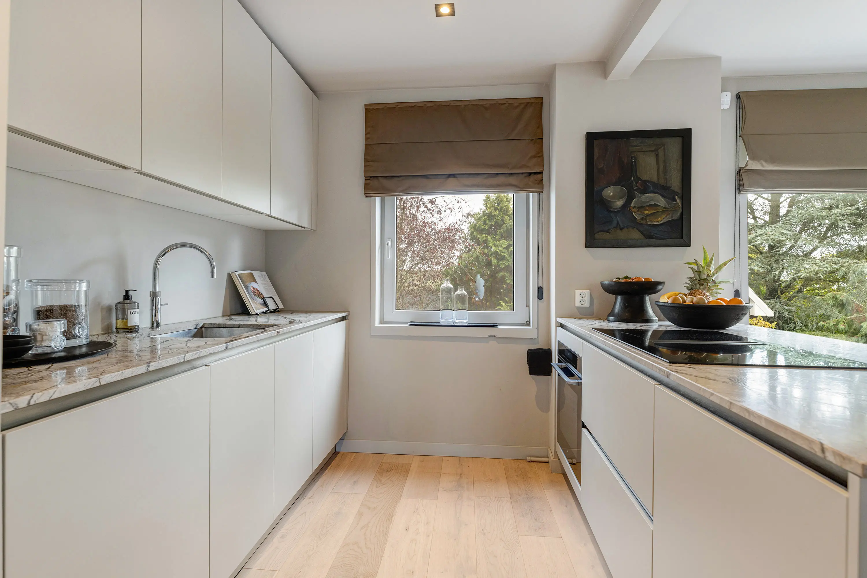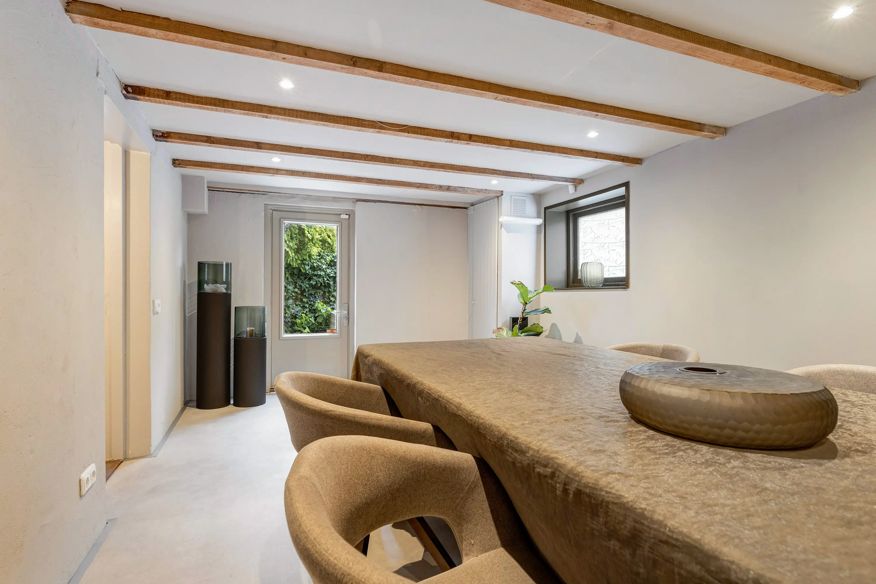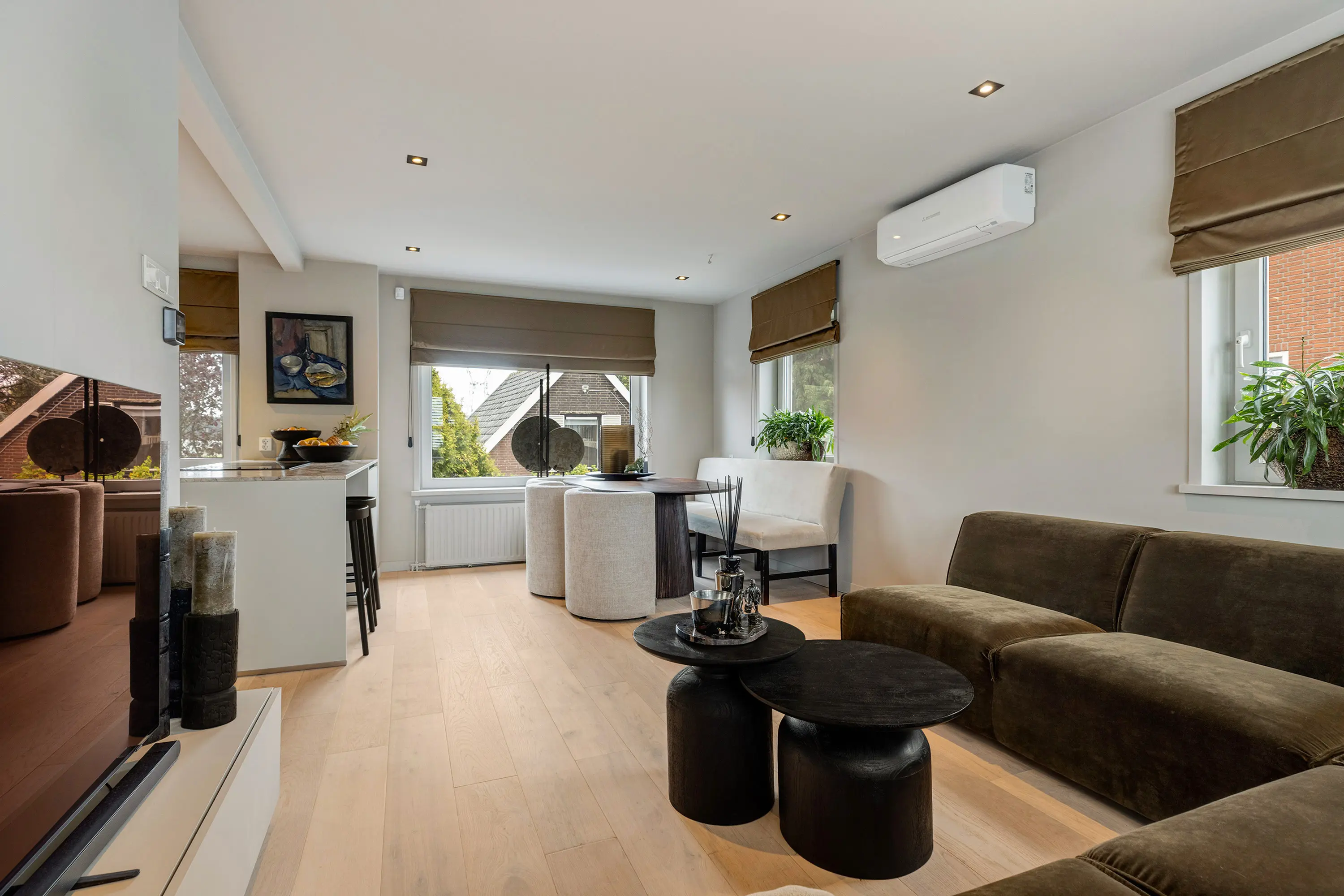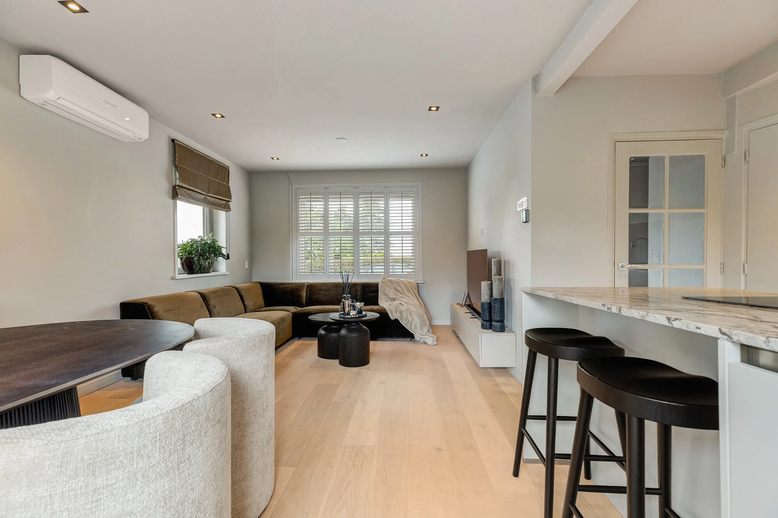 Op de bel-etage valt meteen het lichte, royale karakter van de woonkamer op. Ingebouwde spotverlichting en airconditioning zorgen voor een luxe en comfortabele sfeer, terwijl de shutters het geheel stijlvol afronden. De nieuwe open keuken is een absolute eyecatcher: een inductiekookplaat met geïntegreerde afzuiging, marmeren aanrechtblad, Quooker, vaatwasser, koelkast en combi-oven maken koken een waar plezier. De woonkamer en keuken zijn naadloos verbonden, waardoor een open, uitnodigende leefruimte ontstaat. De vloer is uitgevlakt en afgewerkt met warme eikenhouten vloerdelen. De vernieuwde en uitgebreide meterkast biedt optimale functionaliteit.