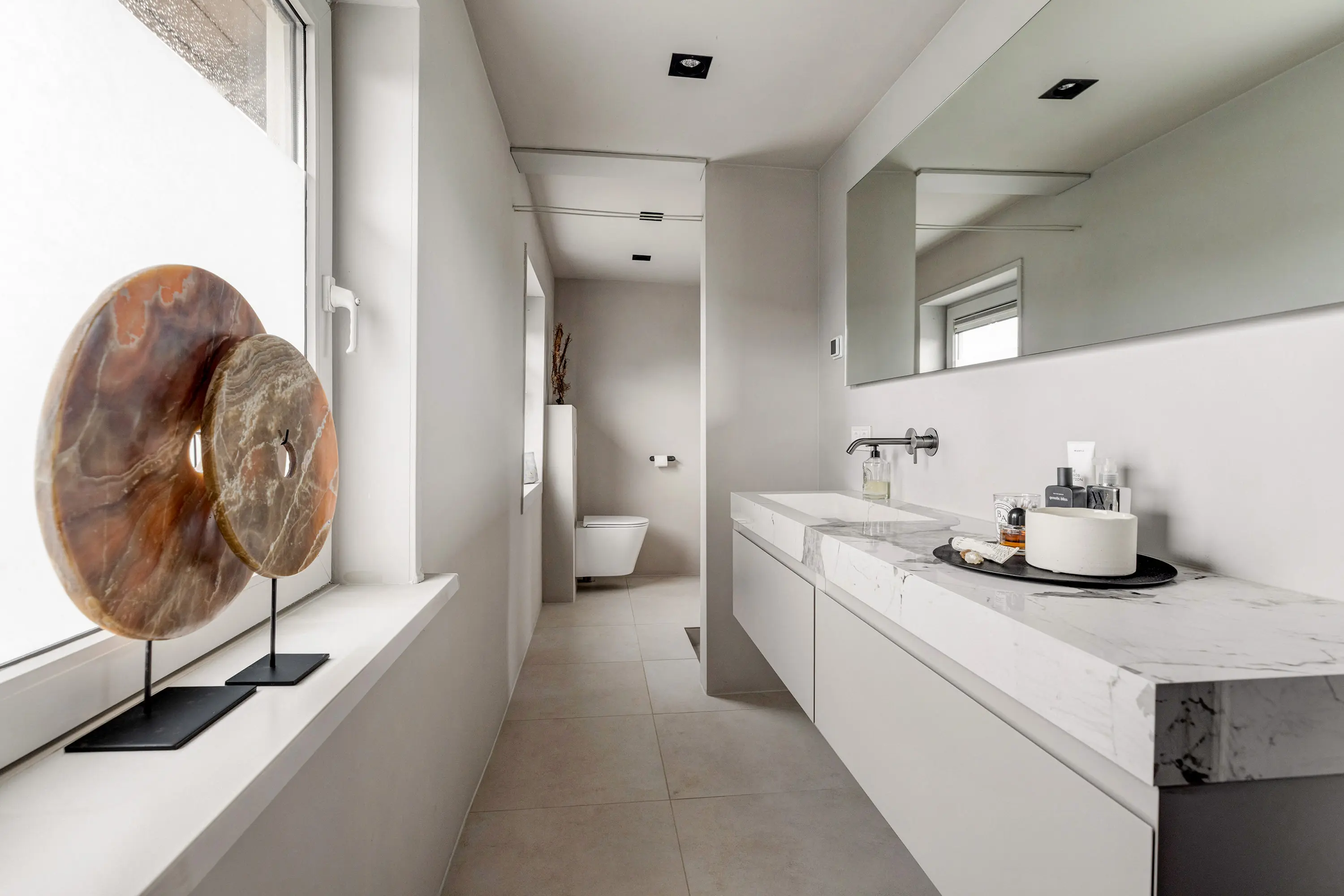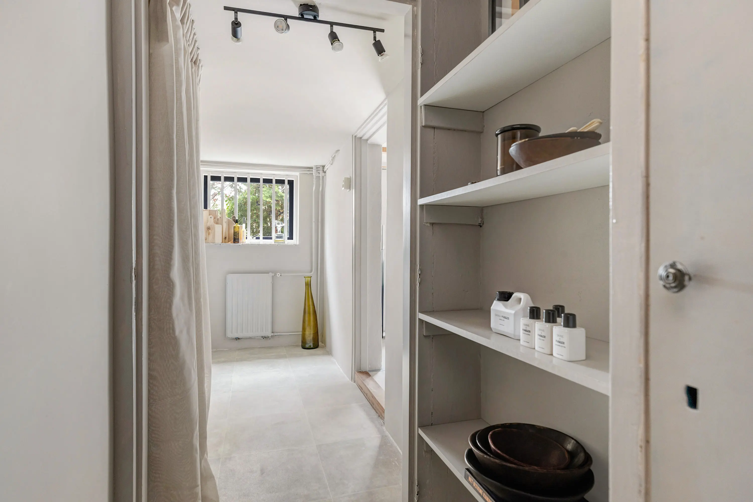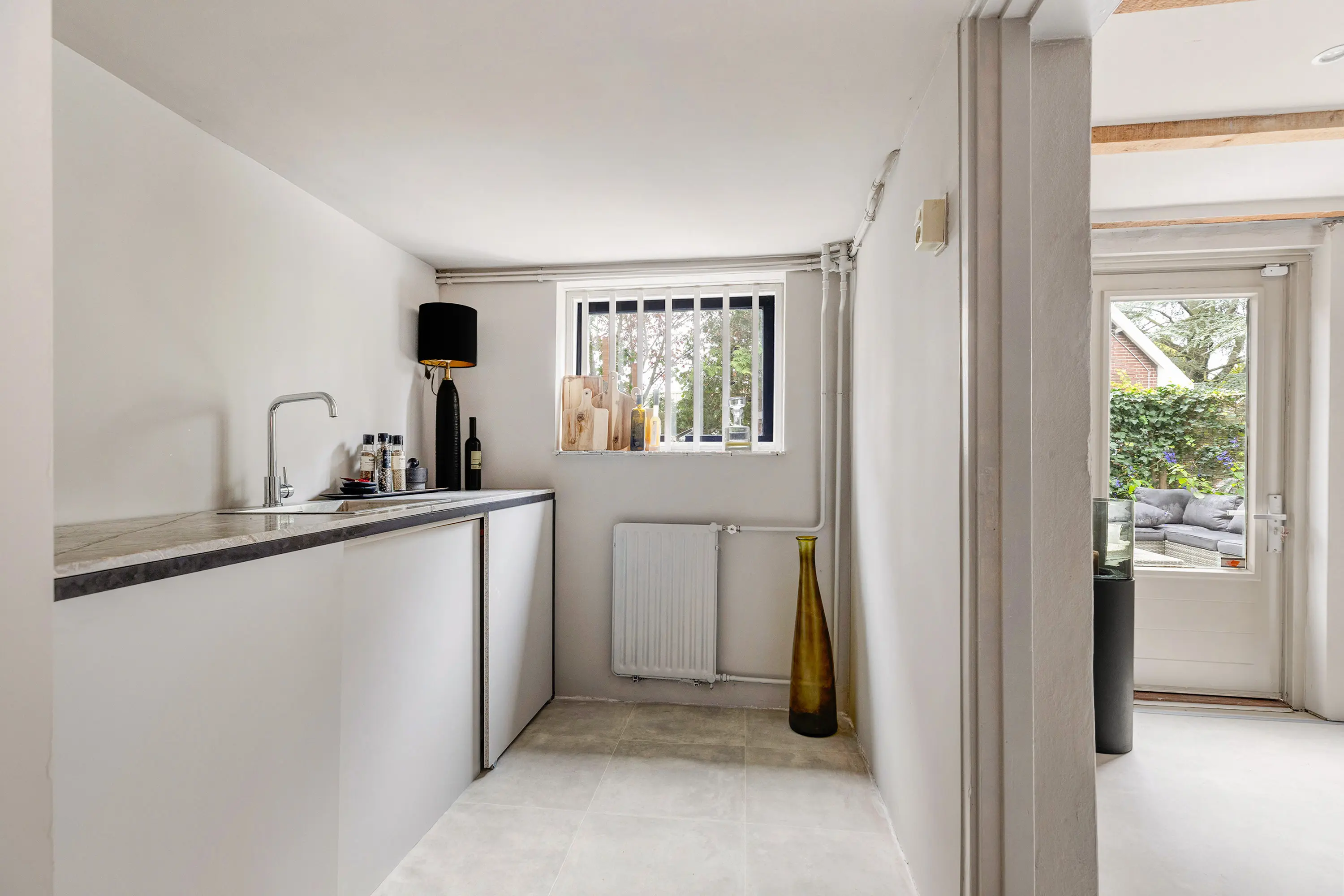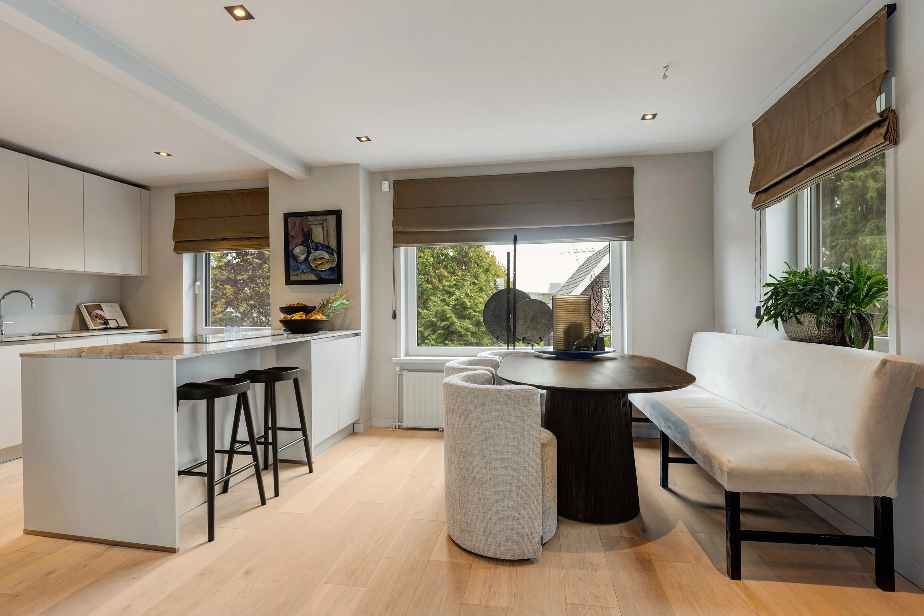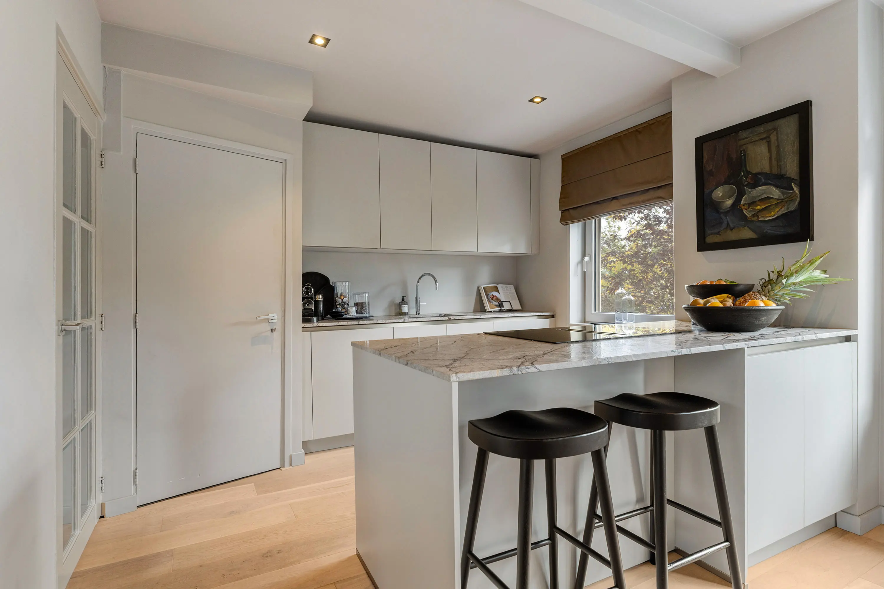 Op de bel-etage valt meteen het lichte, royale karakter van de woonkamer op. Ingebouwde spotverlichting en airconditioning zorgen voor een luxe en comfortabele sfeer, terwijl de shutters het geheel stijlvol afronden. De nieuwe open keuken is een absolute eyecatcher: een inductiekookplaat met geïntegreerde afzuiging, marmeren aanrechtblad, Quooker, vaatwasser, koelkast en combi-oven maken koken een waar plezier. De woonkamer en keuken zijn naadloos verbonden, waardoor een open, uitnodigende leefruimte ontstaat. De vloer is uitgevlakt en afgewerkt met warme eikenhouten vloerdelen. De vernieuwde en uitgebreide meterkast biedt optimale functionaliteit.