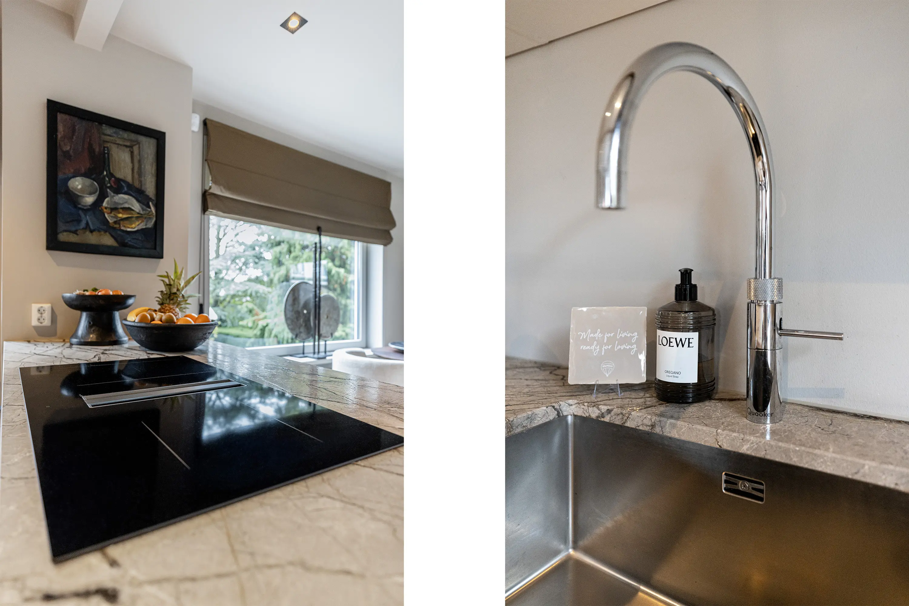 Luxe open keuken met marmeren aanrecht, inductiekookplaat met geïntegreerde afzuiging, Quooker, vaatwasser, koelkast en combi-oven