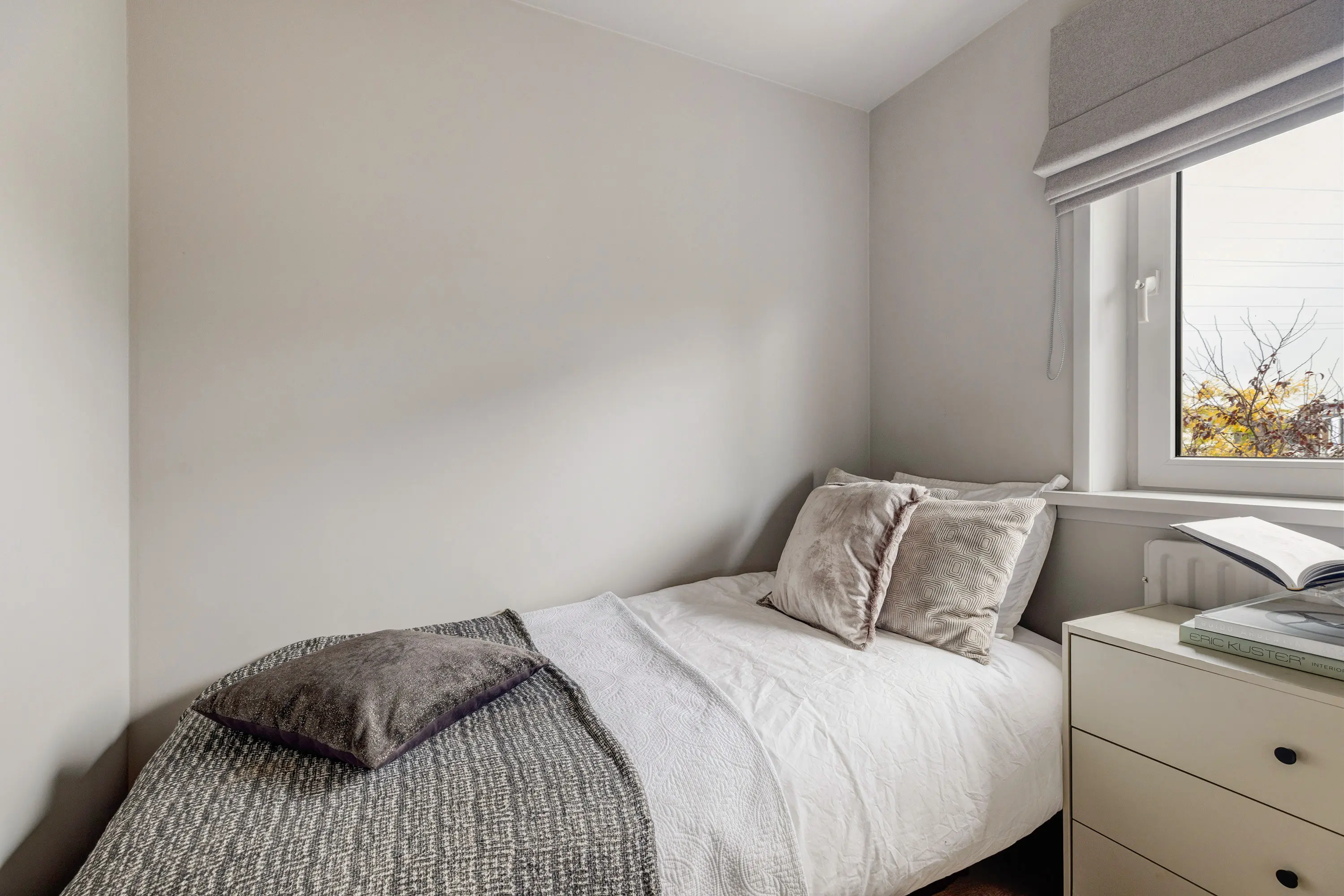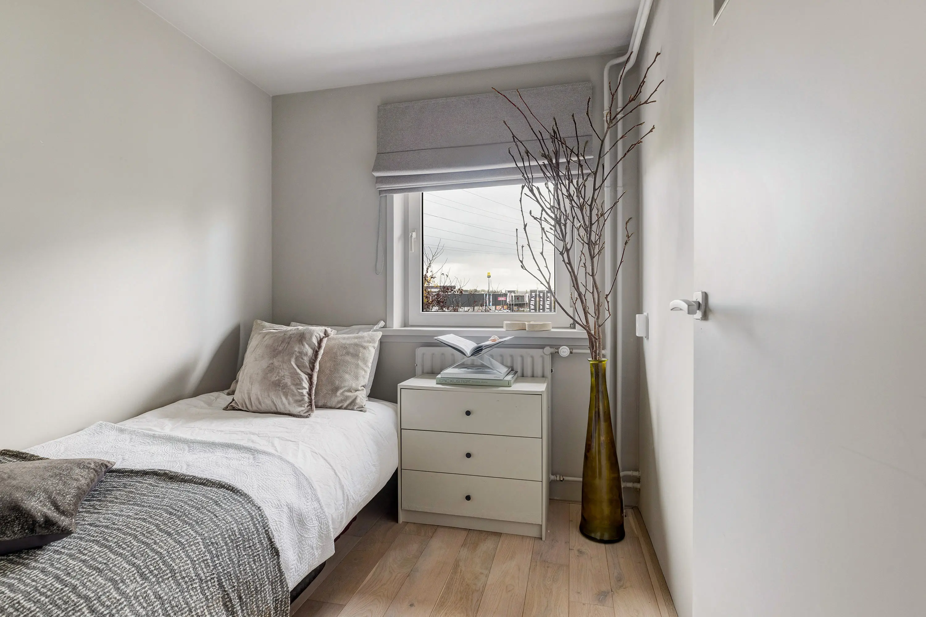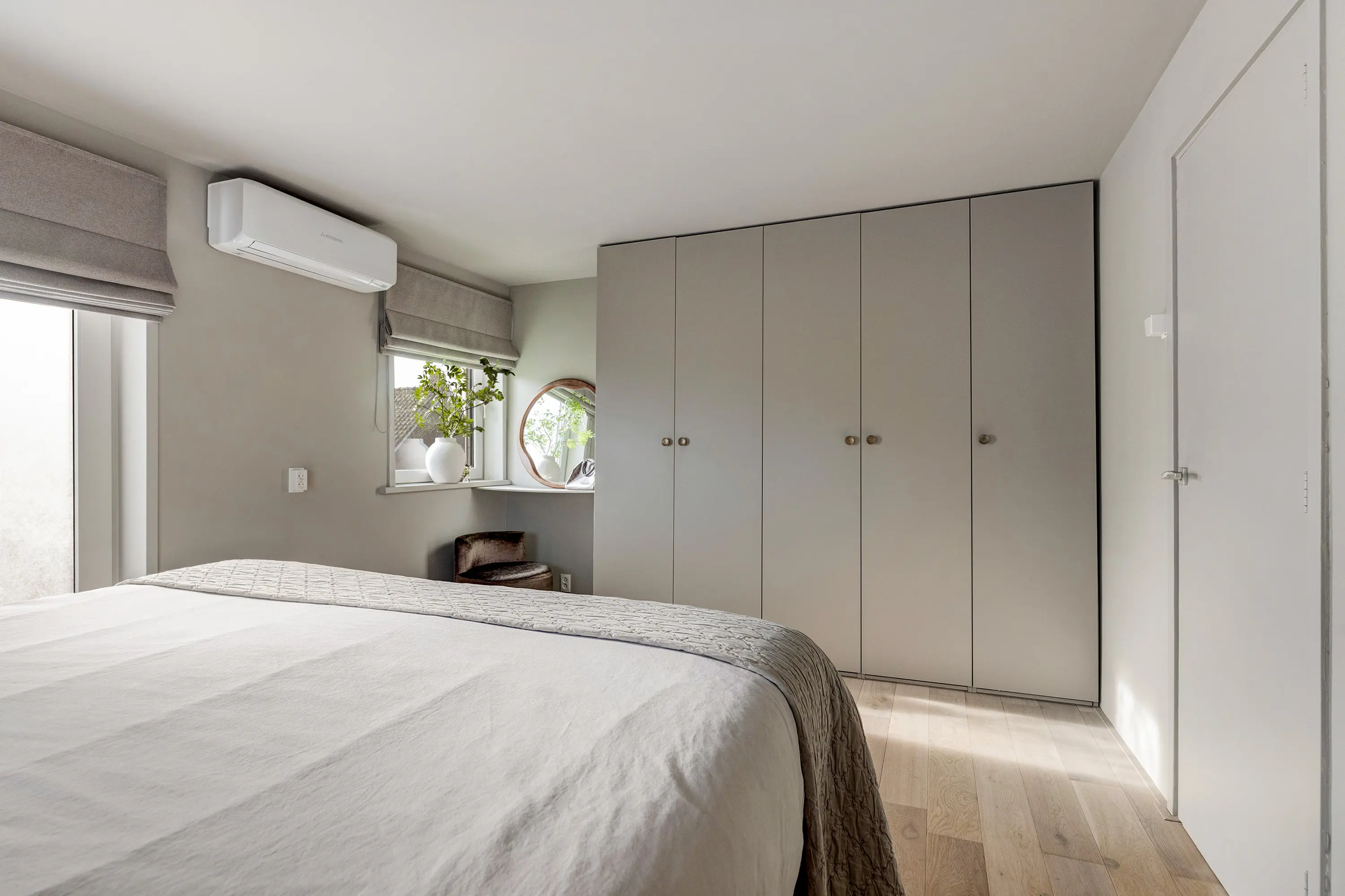 De zolder is een ruime, lichte slaapkamer met grote dakkapel en houten vloer, perfect als extra slaapkamer, werk- of chillruimte. Slimme bergruimte houdt alles netjes en overzichtelijk.