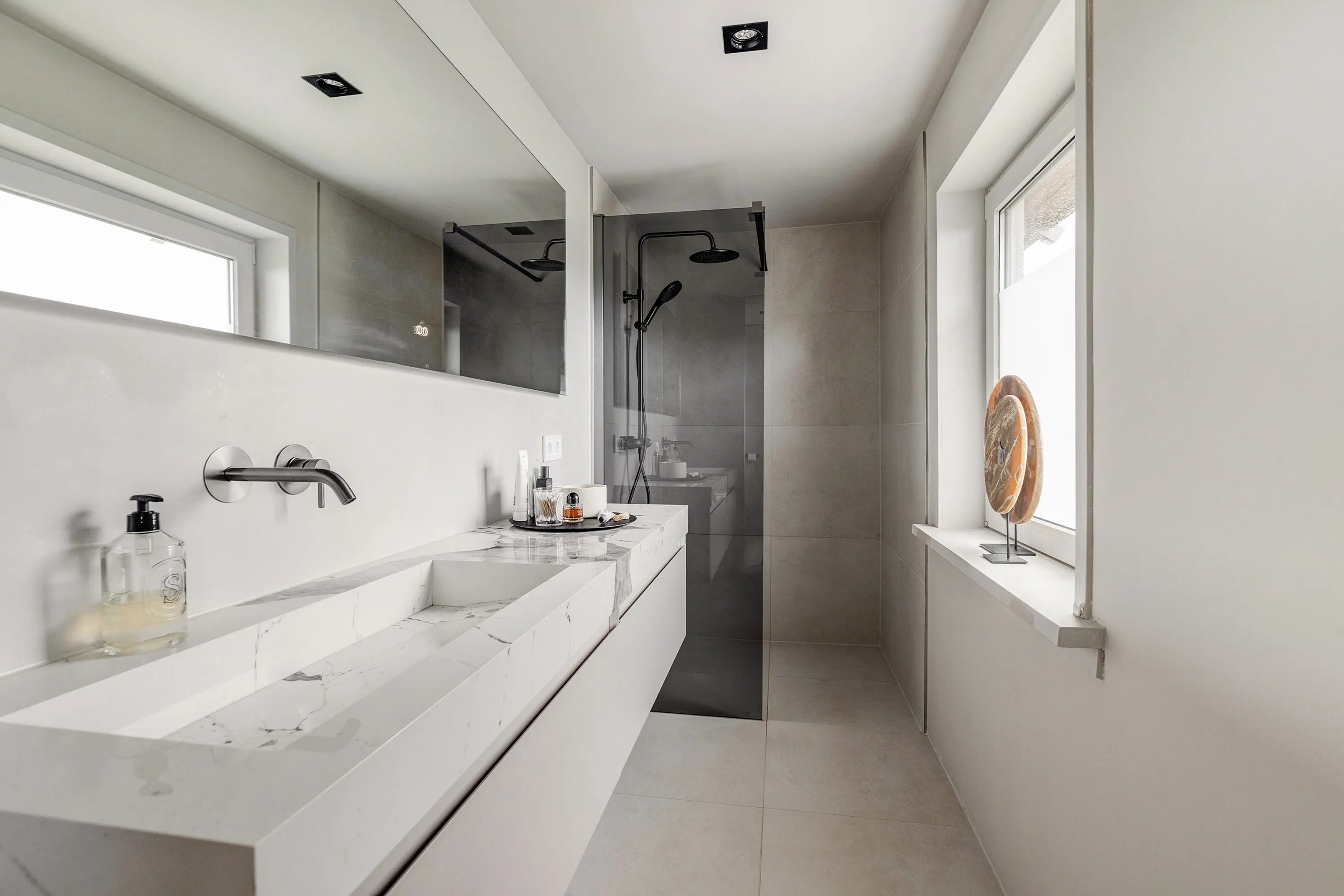 Op de eerste verdieping bevinden zich twee slaapkamers, beide voorzien van eikenhouten vloeren en airconditioning in de ouderslaapkamer. De luxe badkamer is volledig vernieuwd, voorzien van elektrische vloerverwarming, een grote inloopdouche, toilet en marmerlook wastafel met meubel en spiegel – stijlvol én comfortabel.