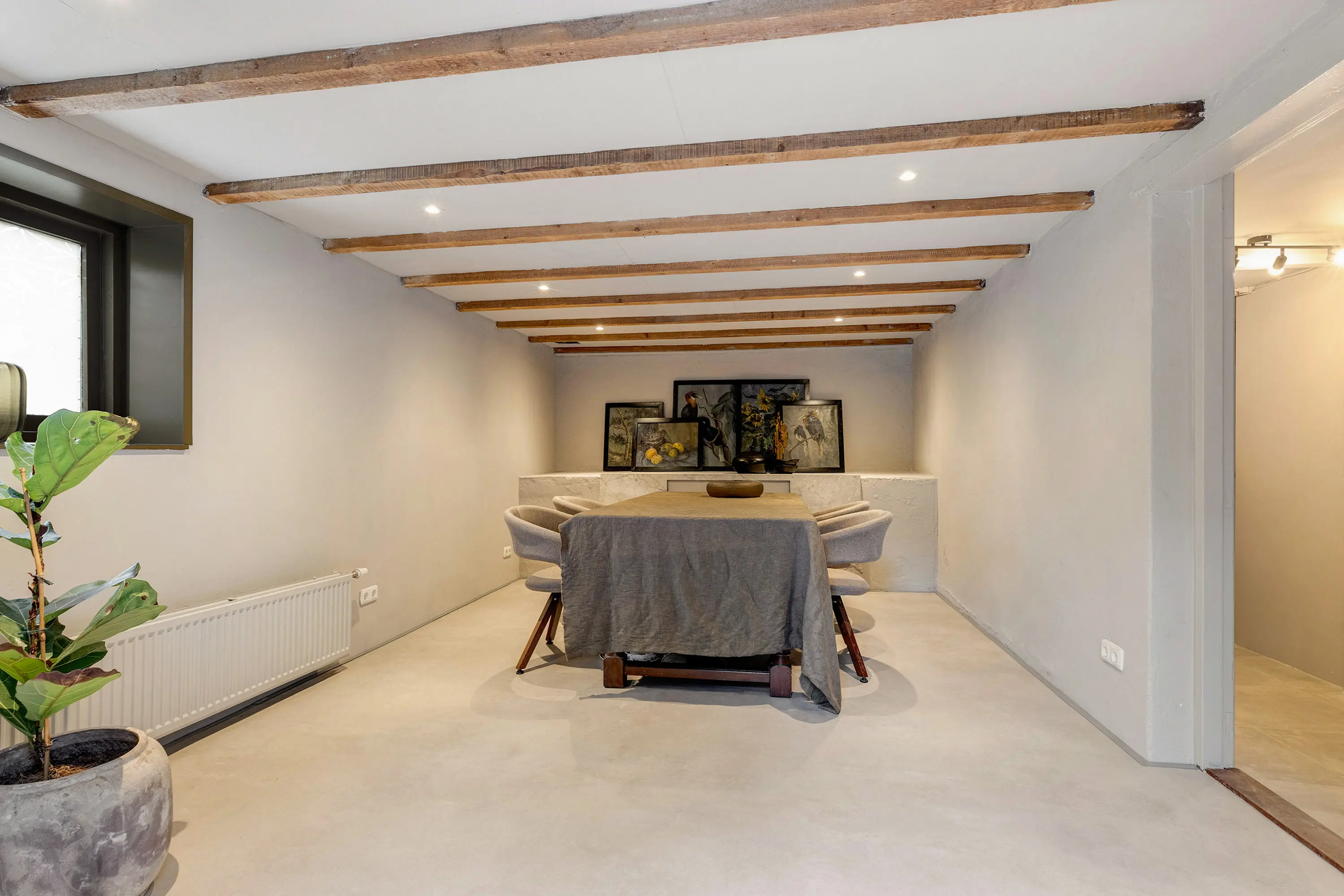 Het onderhuis is praktisch en stijlvol ingericht met een nieuwe keuken voorzien van hetzelfde marmeren aanrechtblad als op de woonverdieping. Er is een handige kast voor wasmachine en droger plus extra bergkast. Deze ruimte is ideaal als hobbyruimte, werkplek of tweede leefruimte.