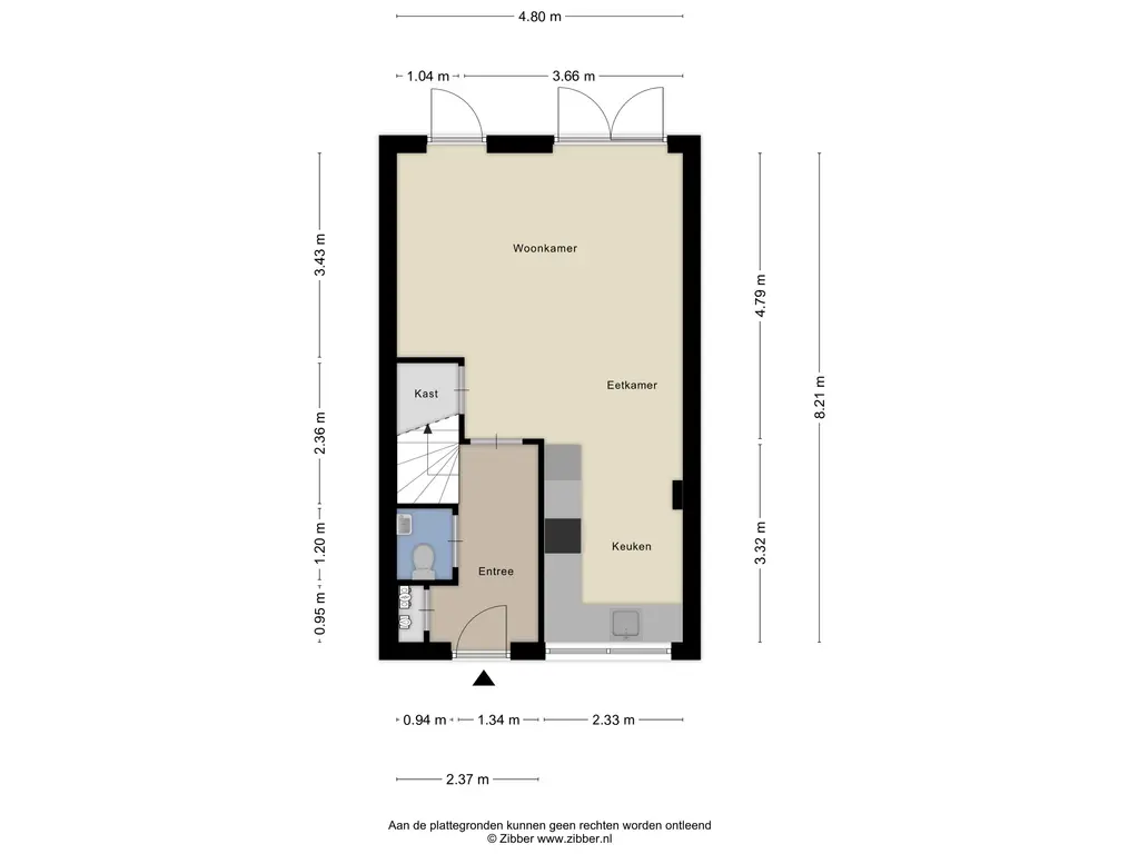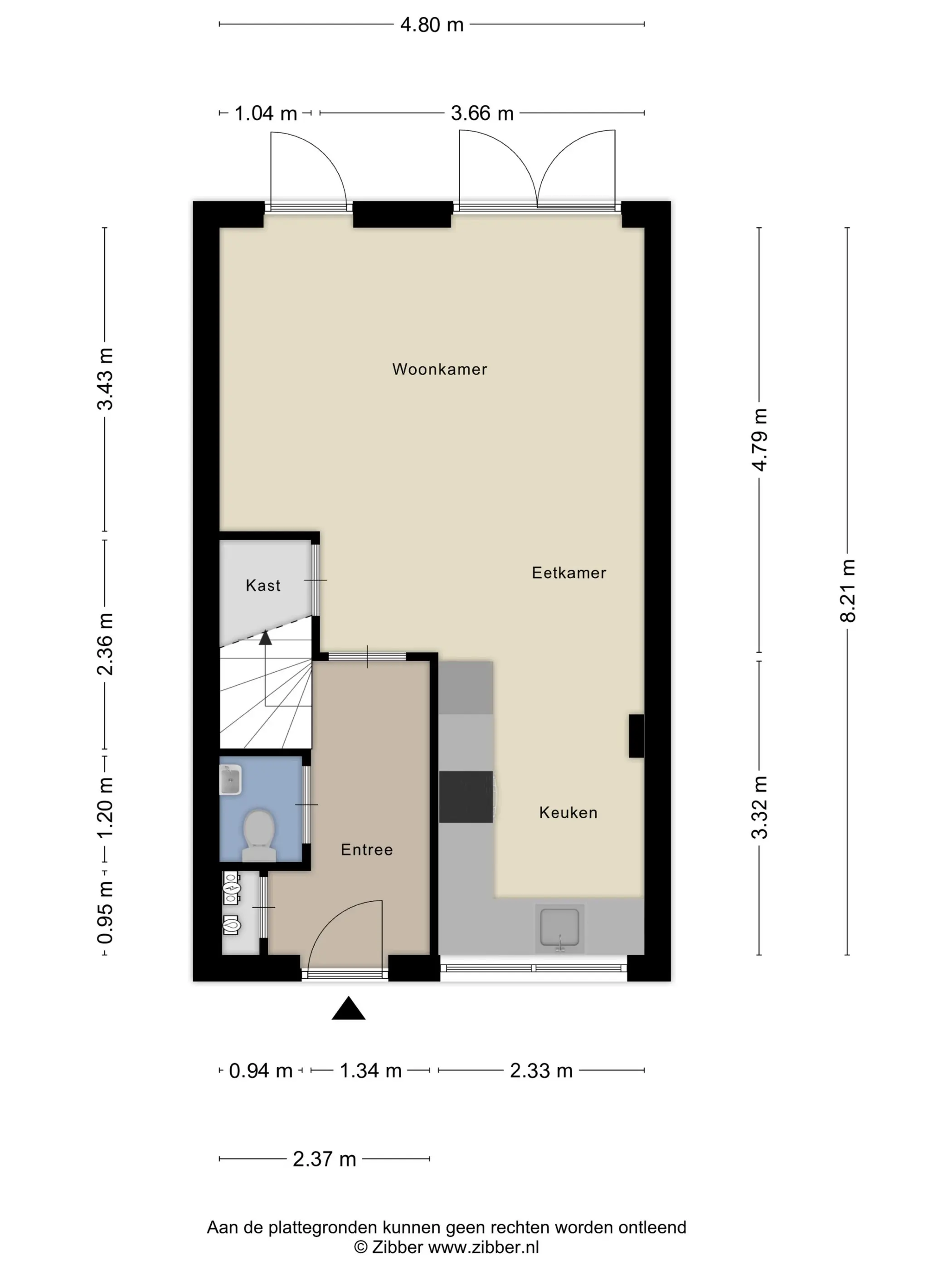 Entree, hal met meterkast, trap naar de 1e verdieping, toiletruimte voorzien van een duoblok en fonteintje. De toiletruimte is gedeeltelijk betegeld in een lichte kleurstelling. De hal is afgewerkt met tegelvloer. Via een glazen deur heeft u toegang tot de woonkamer.