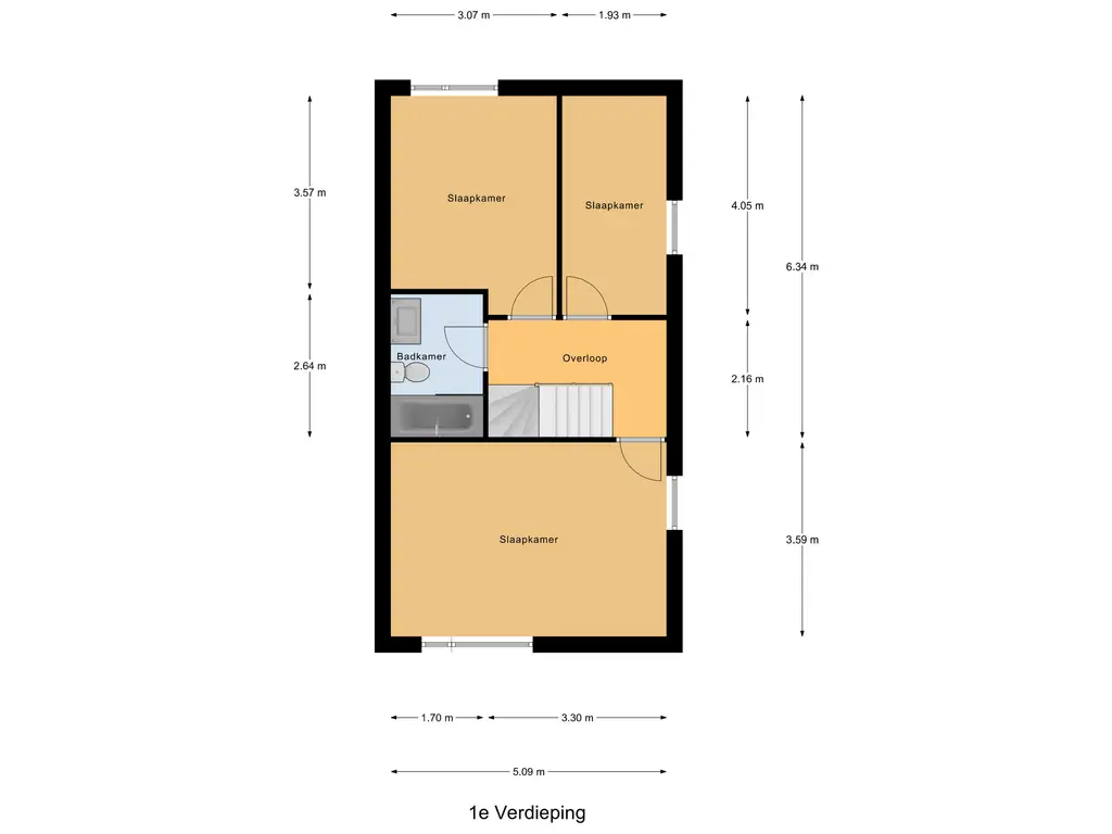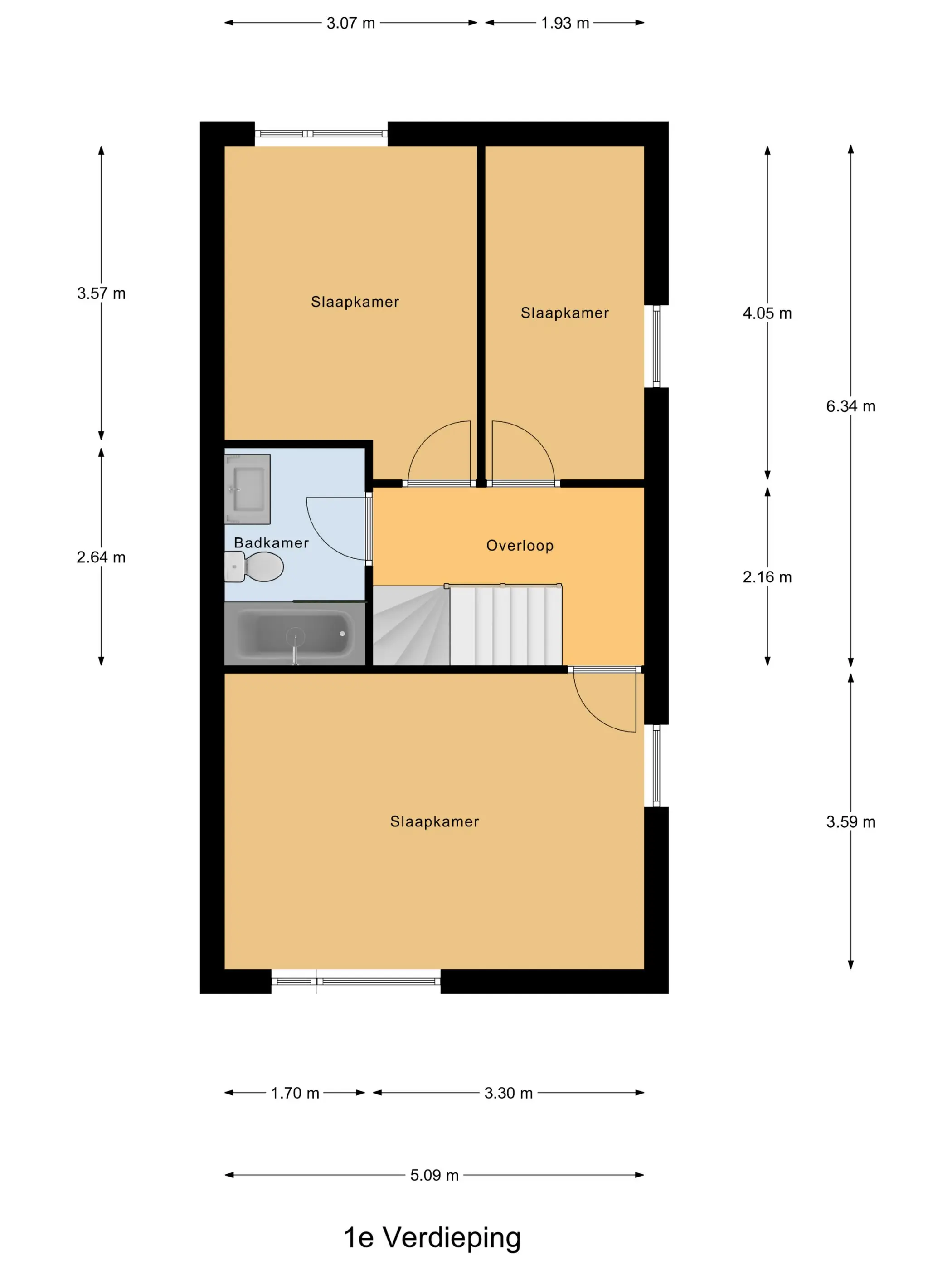 Op de eerste verdieping zijn drie ruime slaapkamers aanwezig, elk met veel lichtinval en goed indeelbaar.
