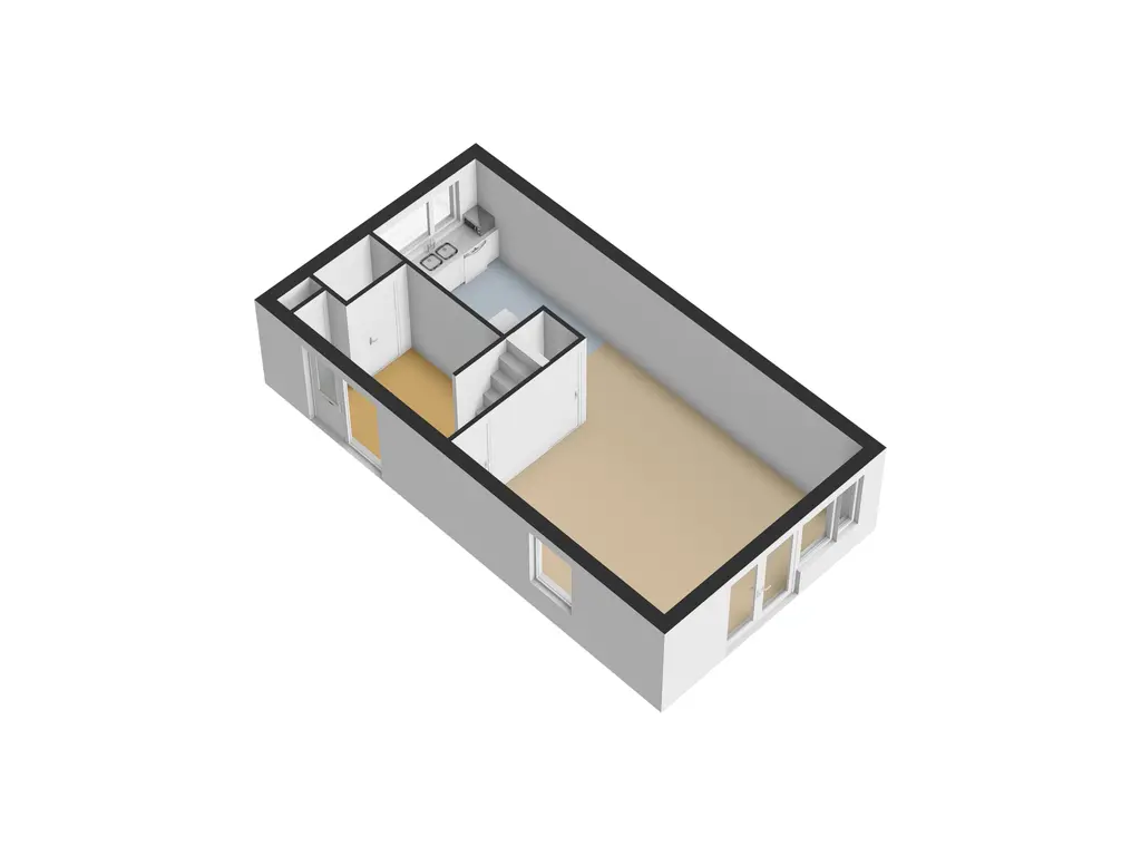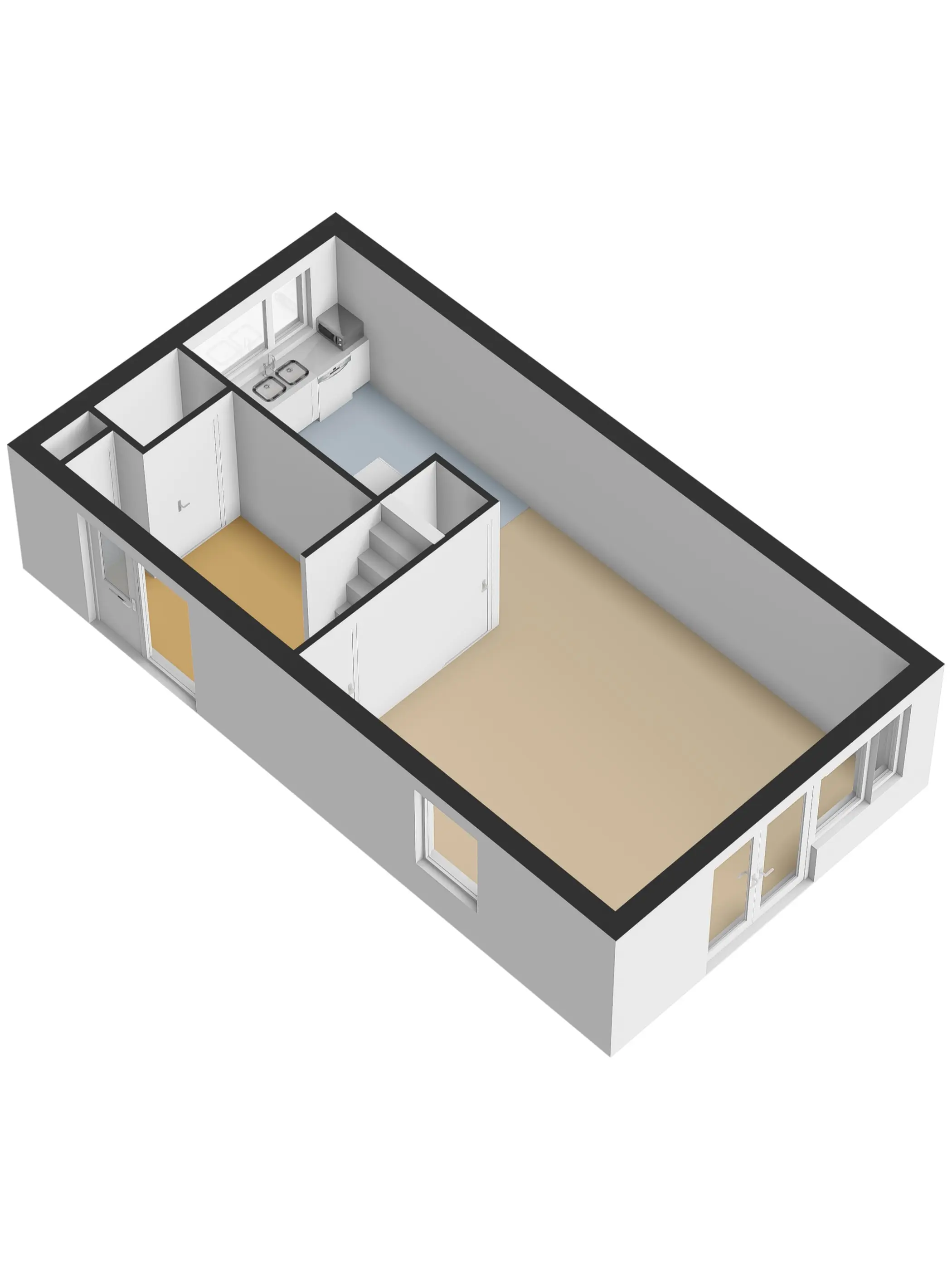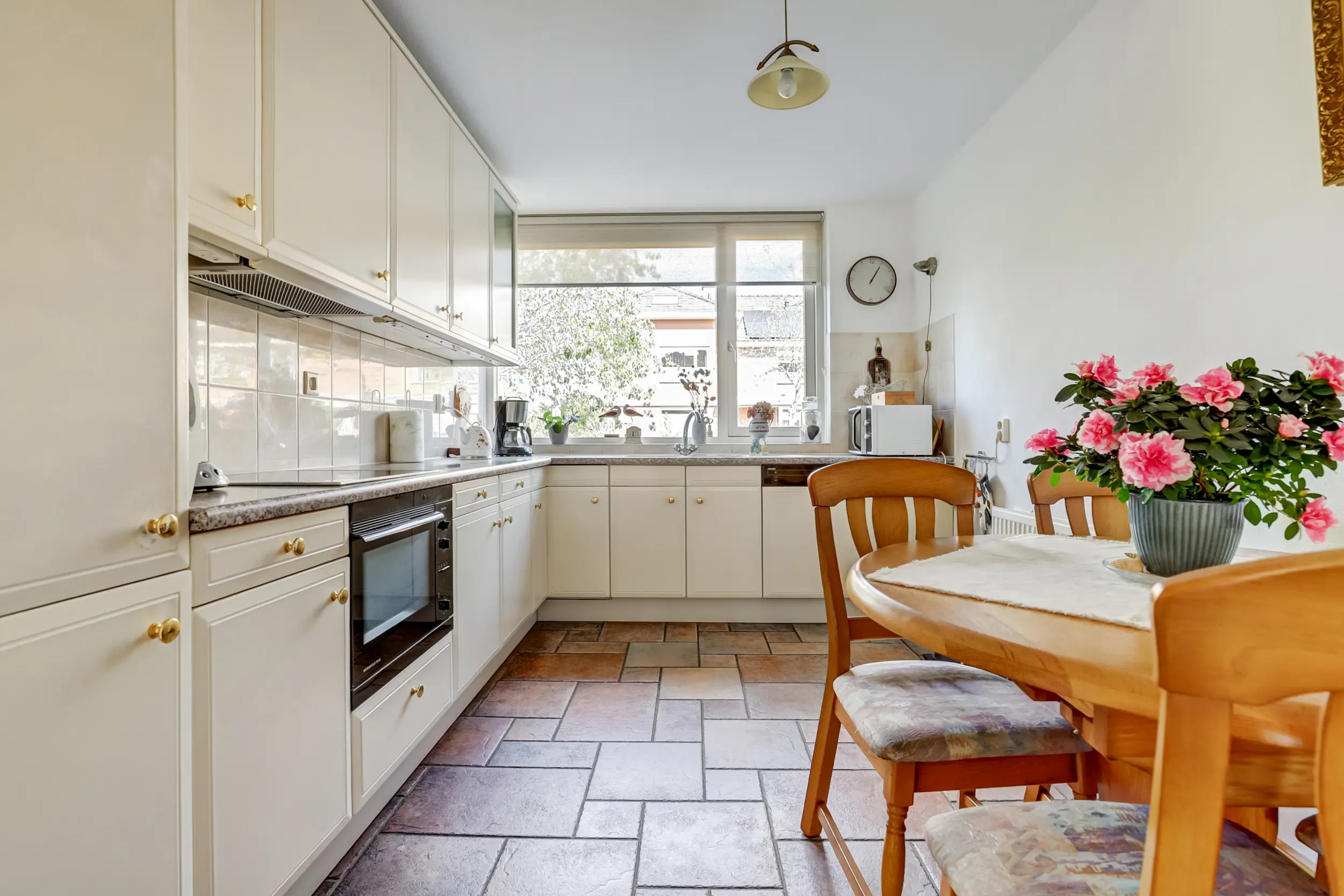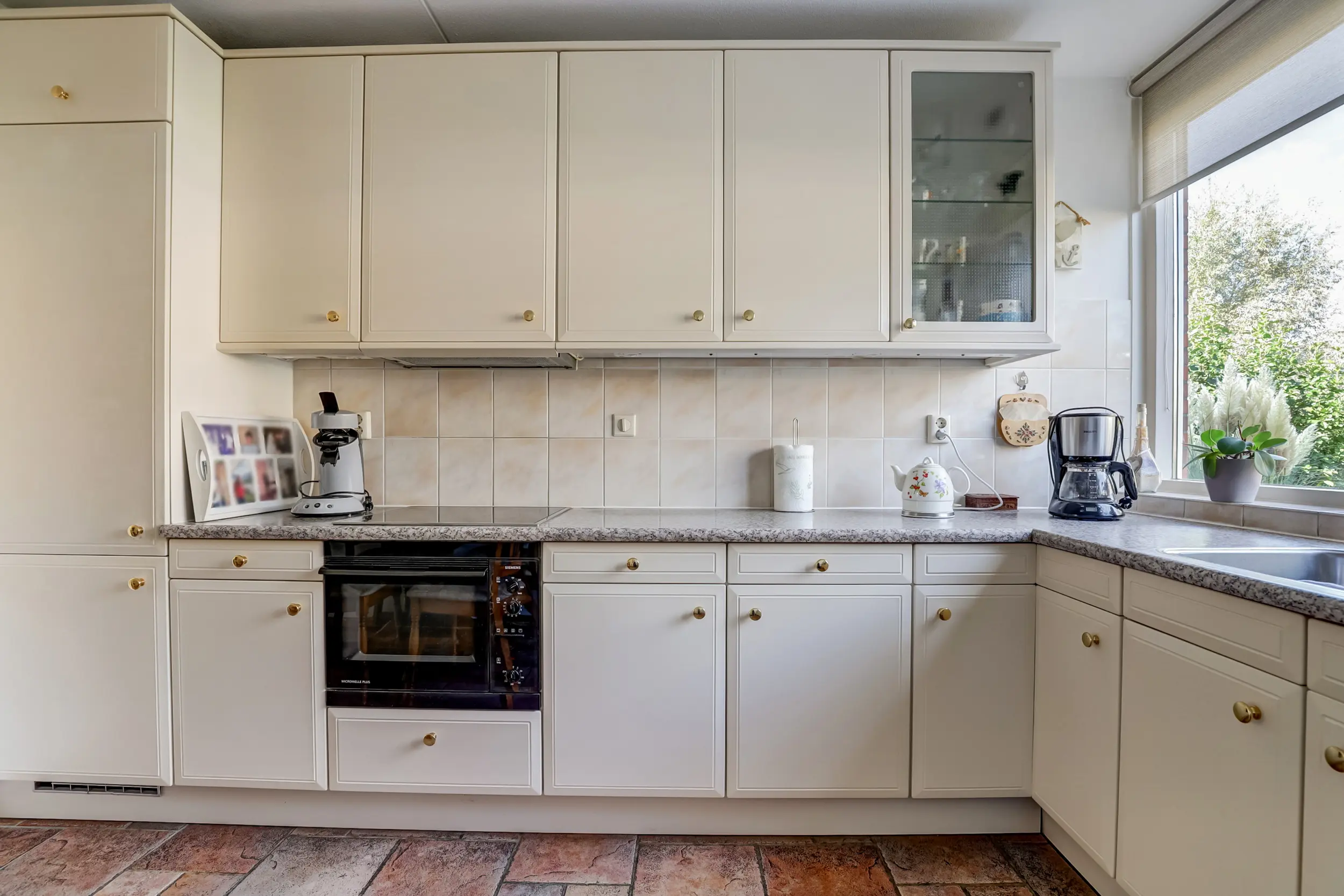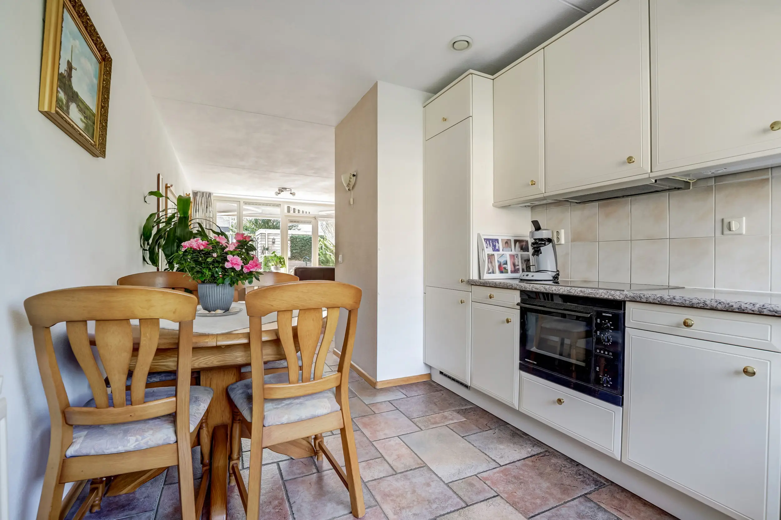 De keuken (ca. 10 m²) bevindt zich aan de voorzijde van de woning en is ruim van opzet. Deze is voorzien van diverse inbouwapparatuur, waaronder een oven, 4 persoons keramische kookplaat, geïntegreerde afzuigkap in het bovenkastje, koel-vriescombinatie en vaatwasser. Ook is er voldoende ruimte voor een eettafel, waardoor koken en gezellig tafelen hier hand in hand gaan. Het raam aan de voorzijde is voorzien van een handmatig bedienbare screen.