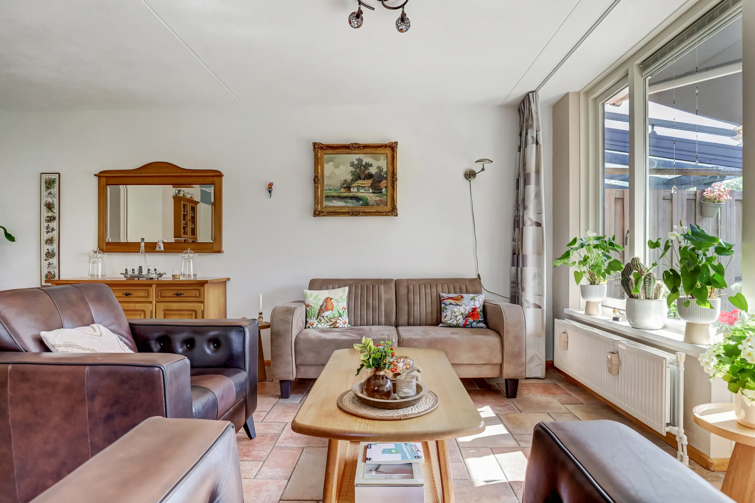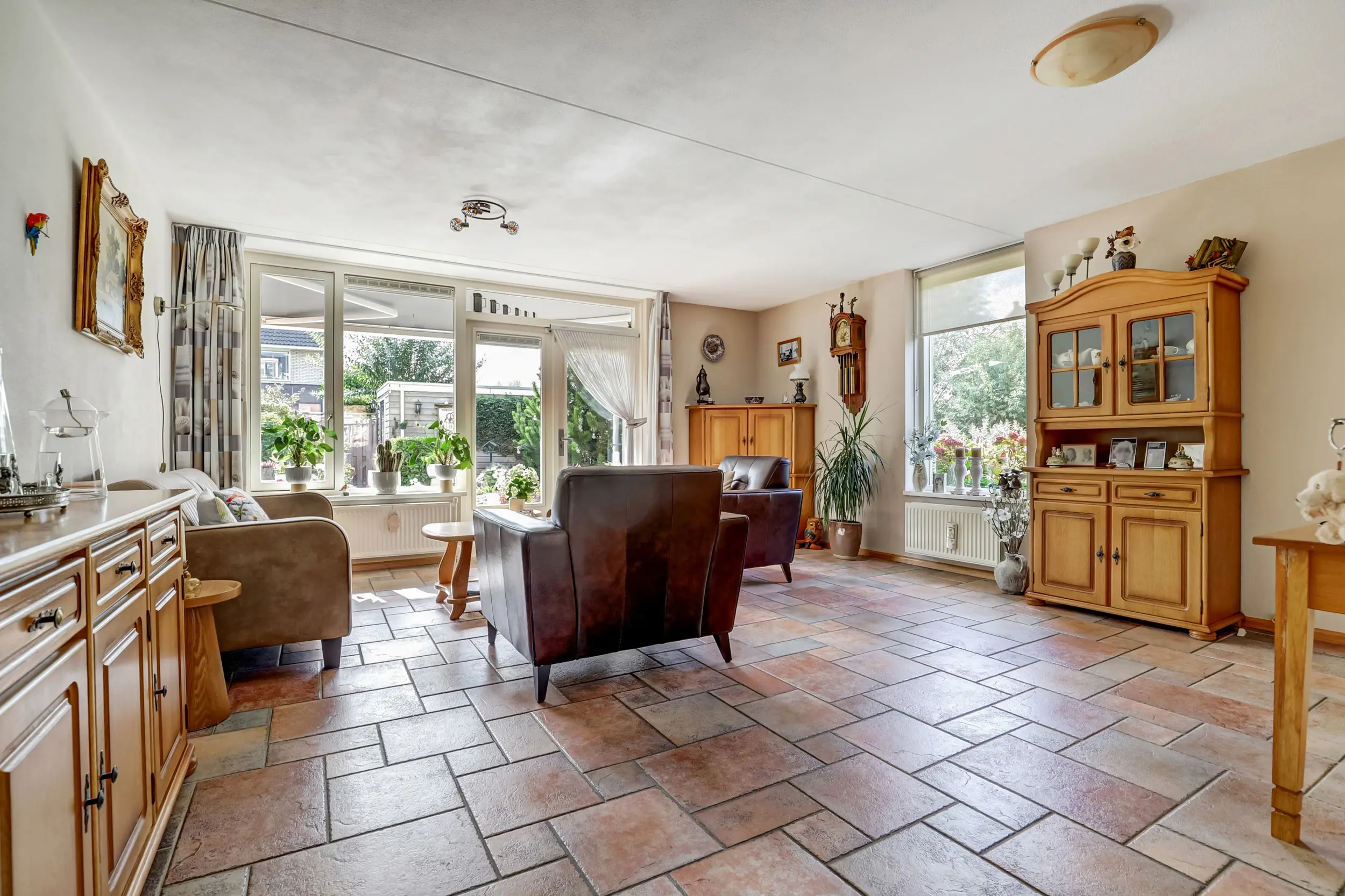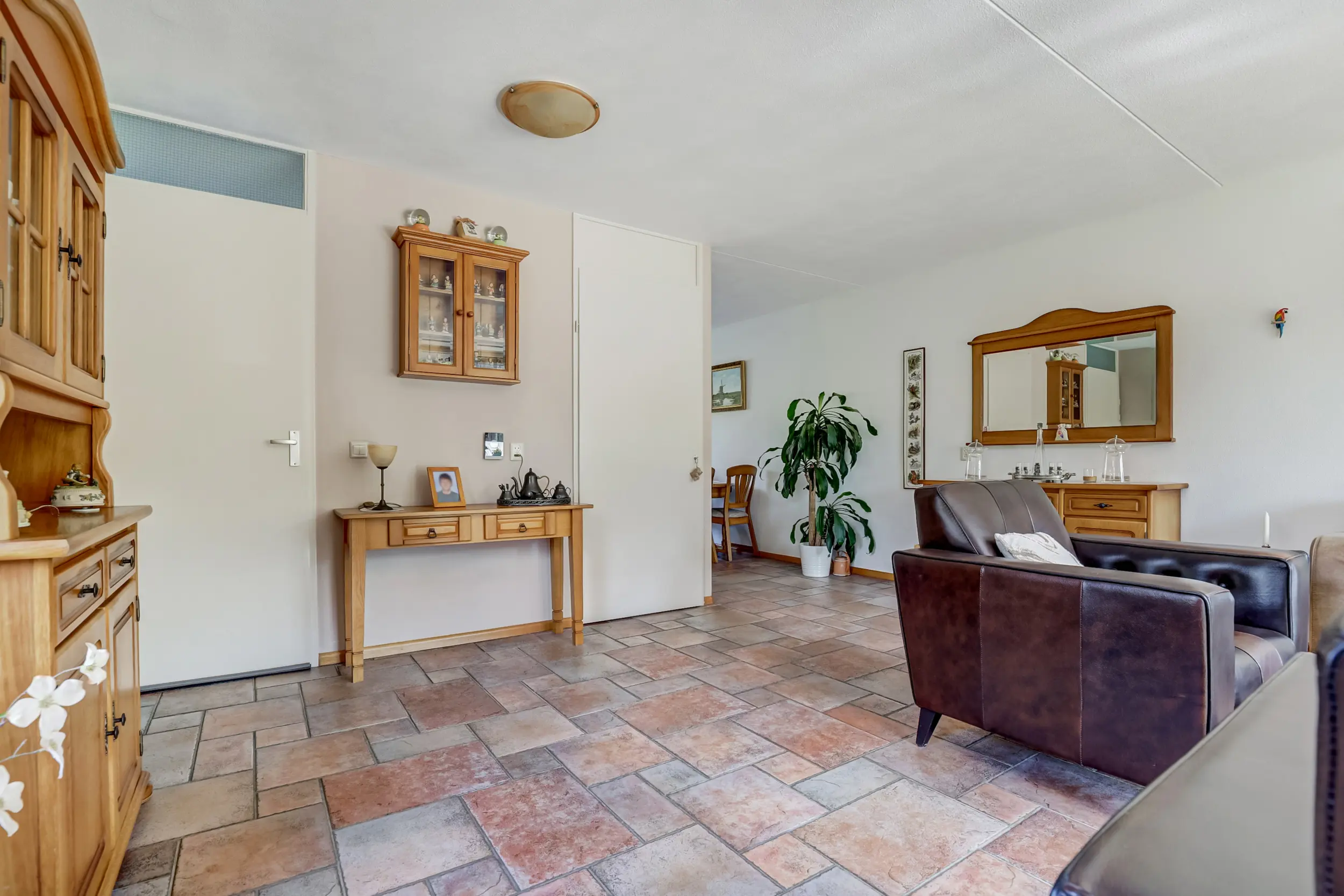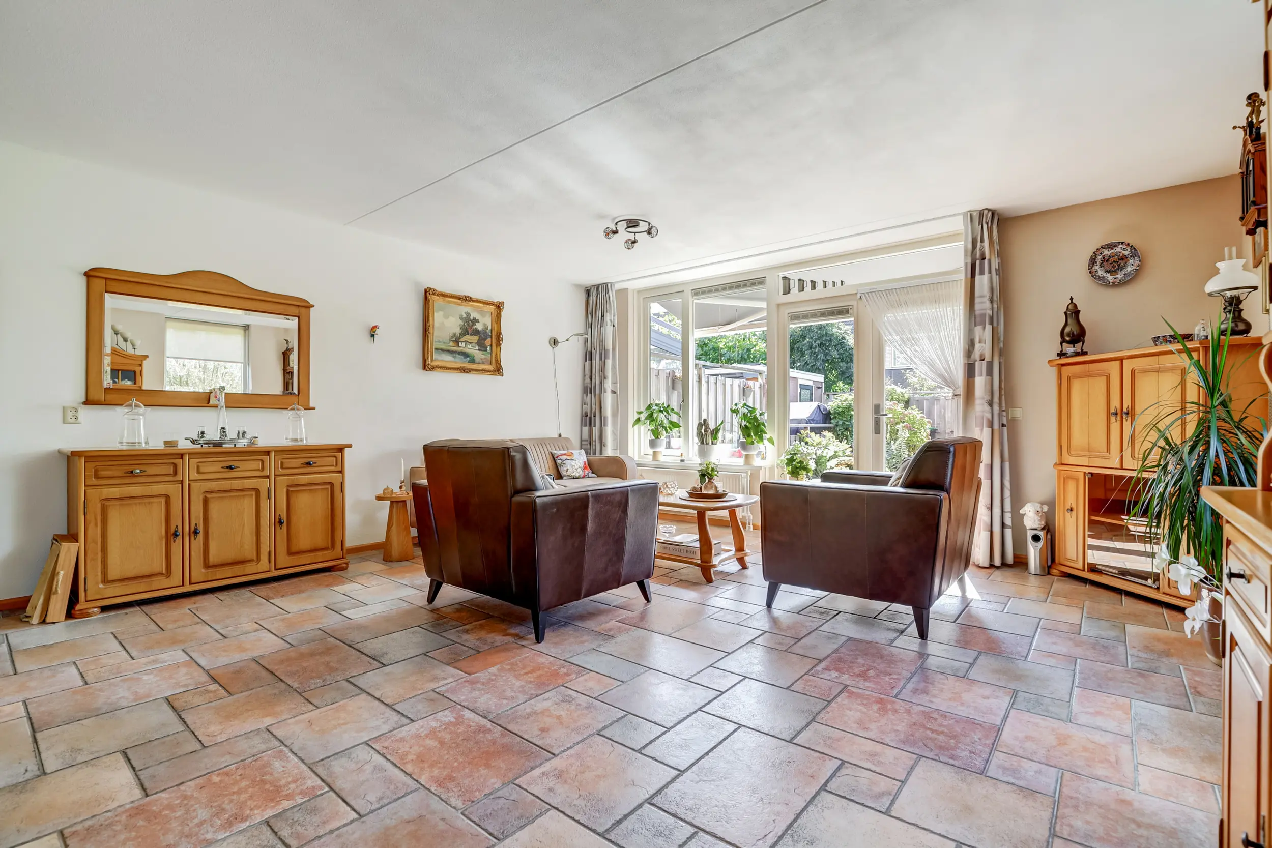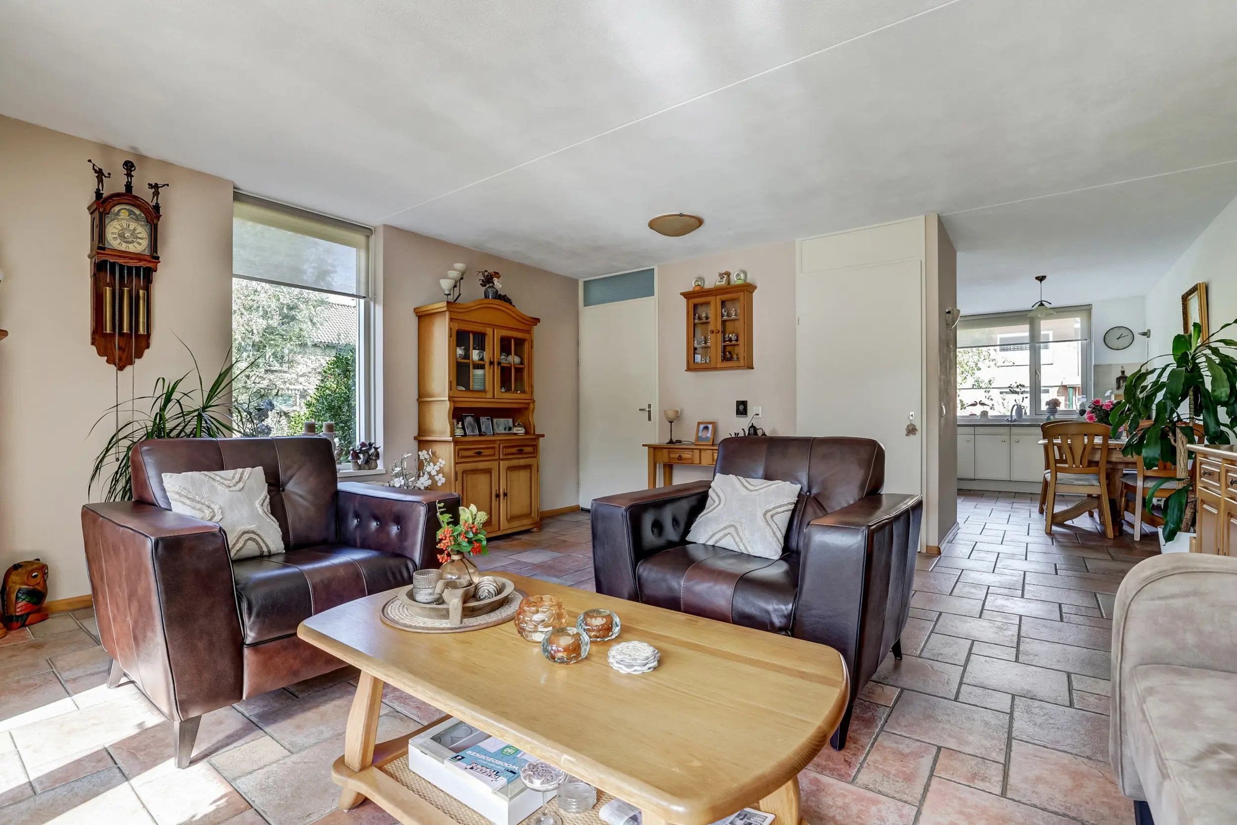 Via de entree kom je in de hal met toilet, meterkast en trapopgang. Vervolgens stap je de lichte en royale woonkamer (ca. 28 m²) binnen. Grote ramen en openslaande deuren naar de tuin zorgen voor veel daglicht en een prettige sfeer. De plavuizenvloer met vloerverwarming geeft de ruimte een warme uitstraling.