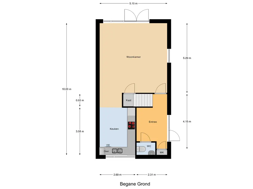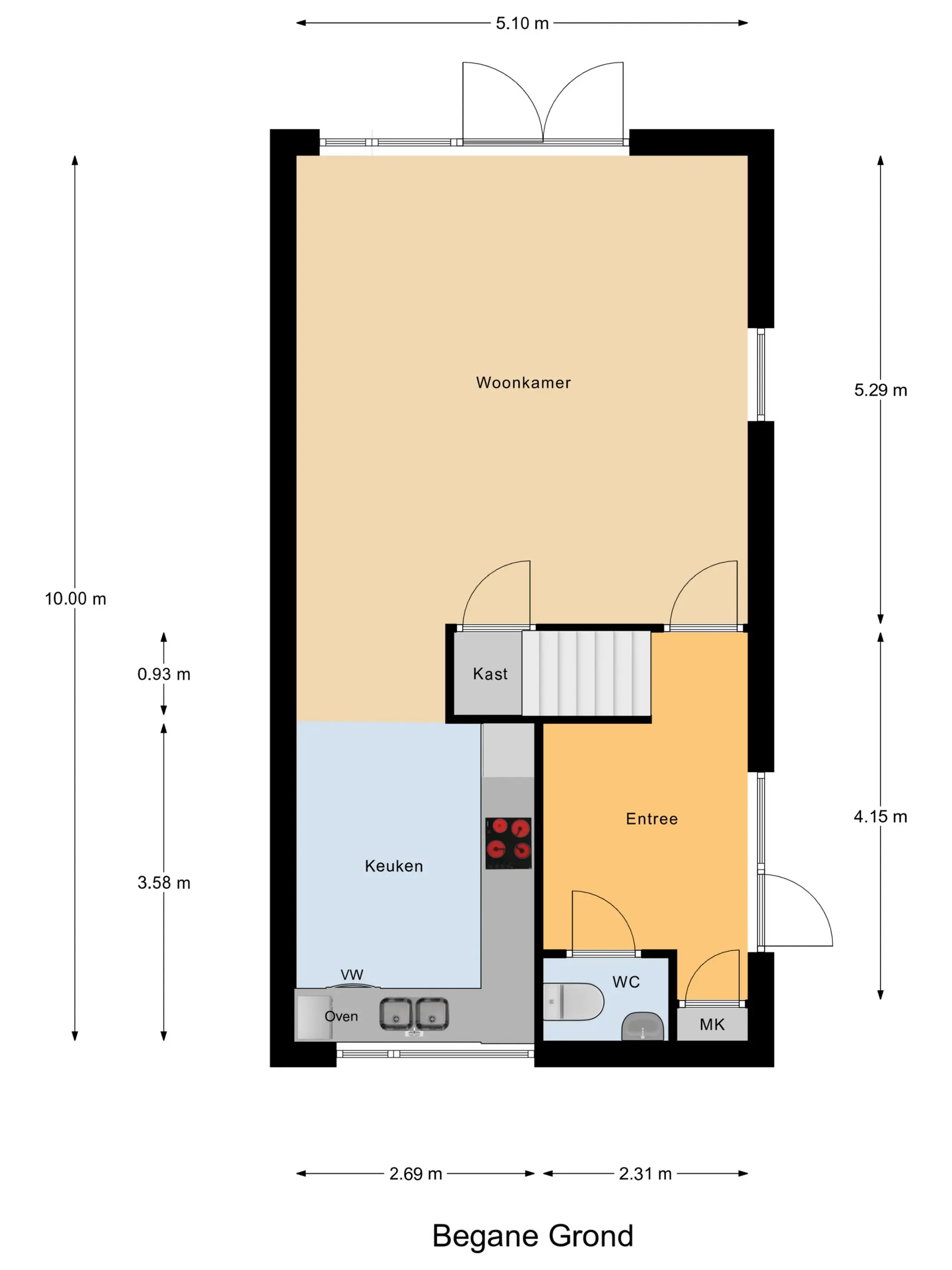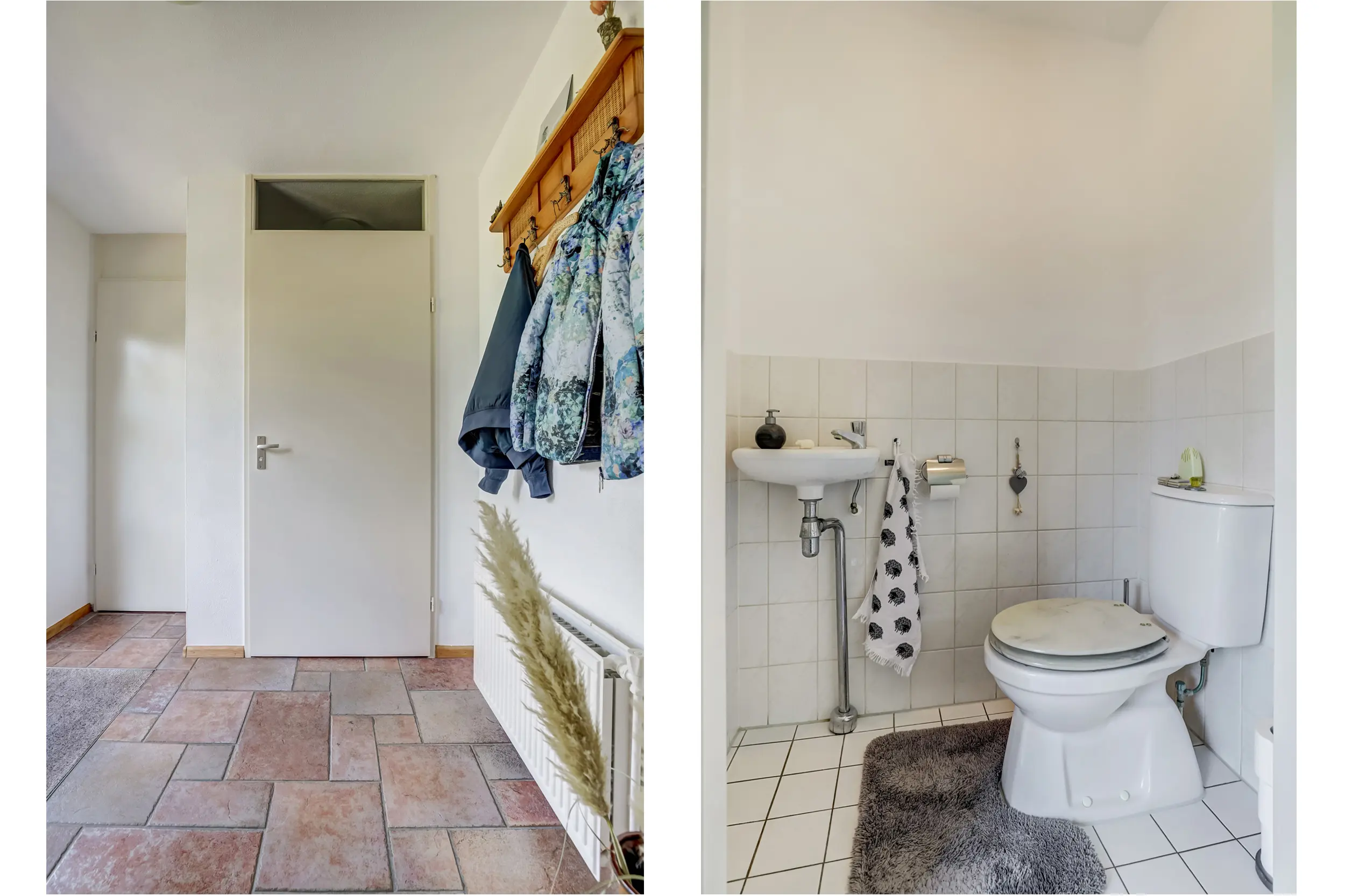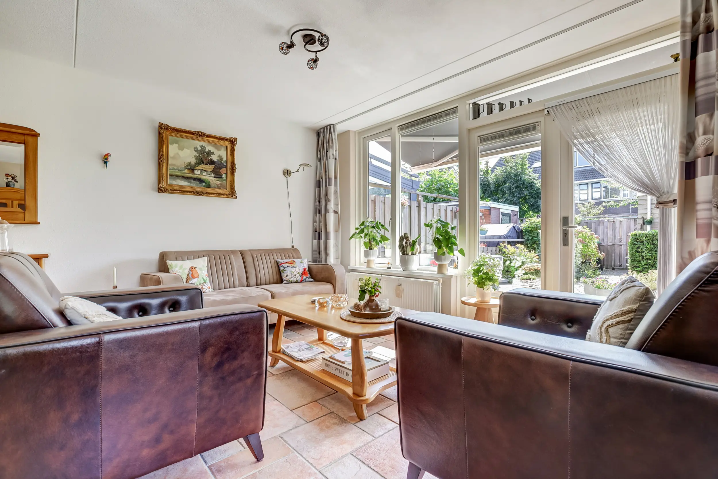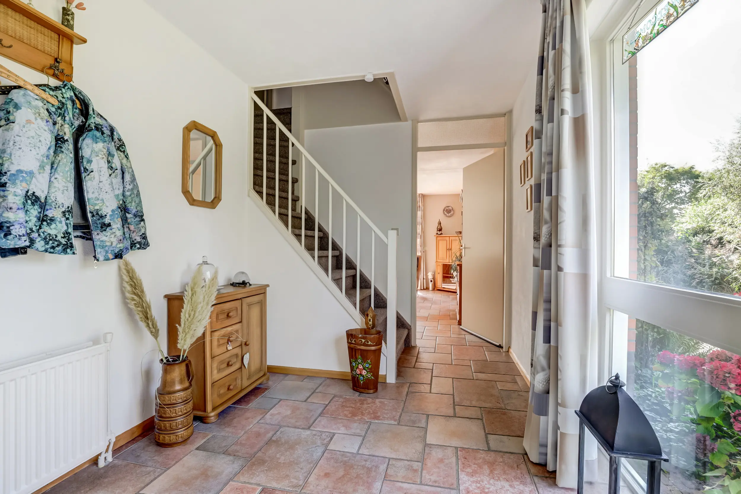 Via de entree kom je in de hal met toilet, meterkast en trapopgang. Vervolgens stap je de lichte en royale woonkamer (ca. 28 m²) binnen. Grote ramen en openslaande deuren naar de tuin zorgen voor veel daglicht en een prettige sfeer. De plavuizenvloer met vloerverwarming geeft de ruimte een warme uitstraling.
