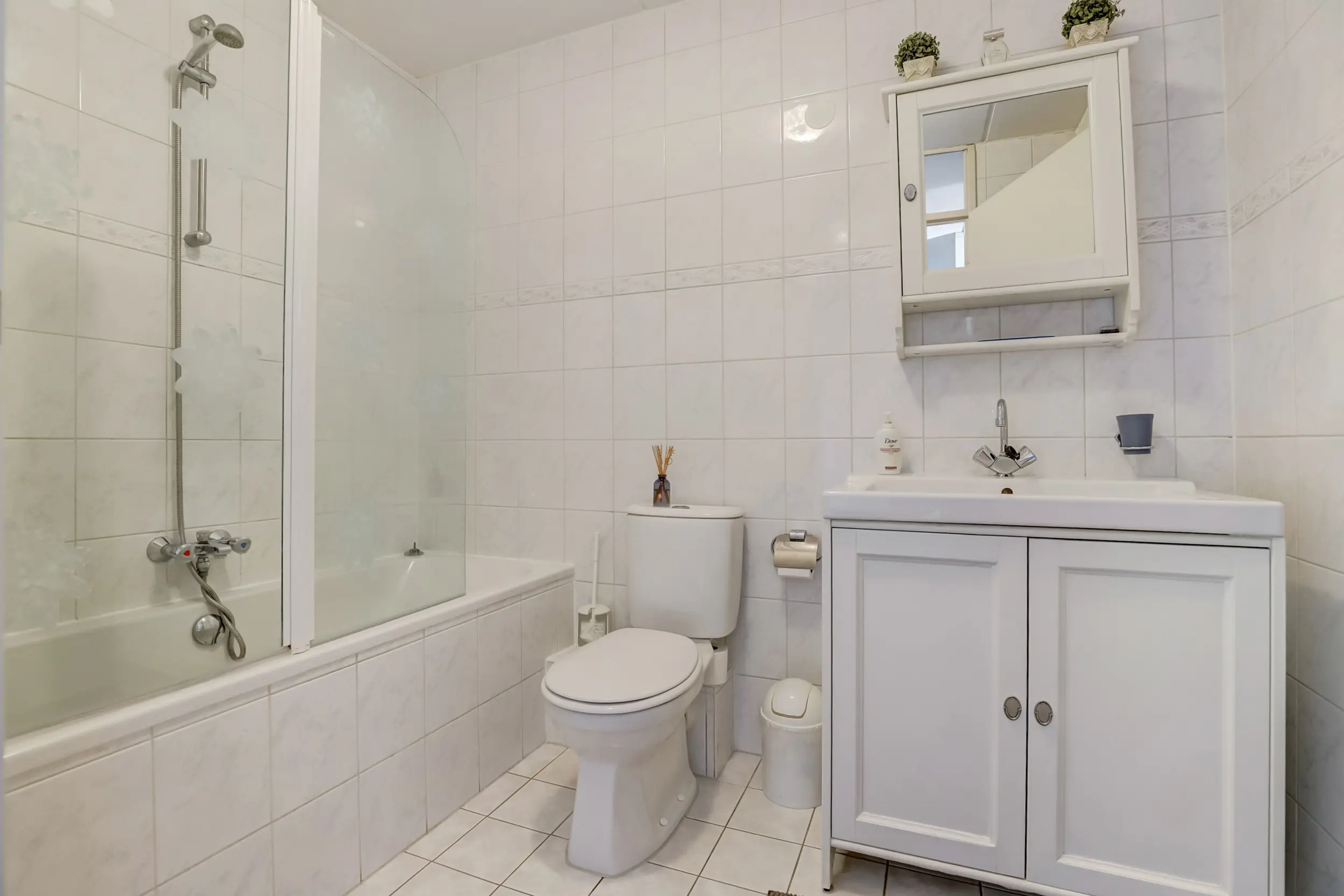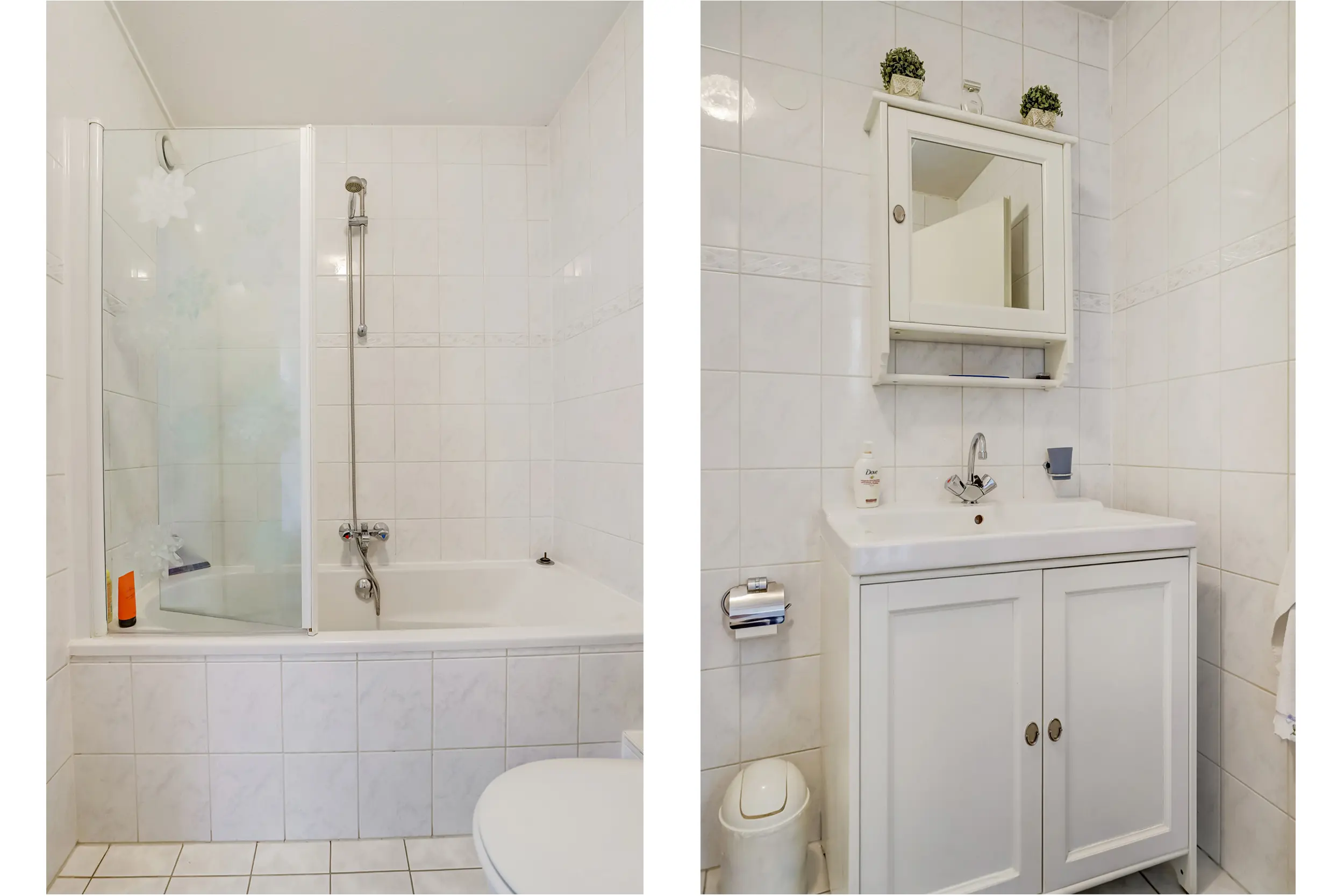 De badkamer (ca. 4 m²) is netjes betegeld en uitgerust met een ligbad met glazen douchewand, wastafelmeubel en duoblok toilet. Alles wat je nodig hebt voor dagelijks comfort vind je hier terug.