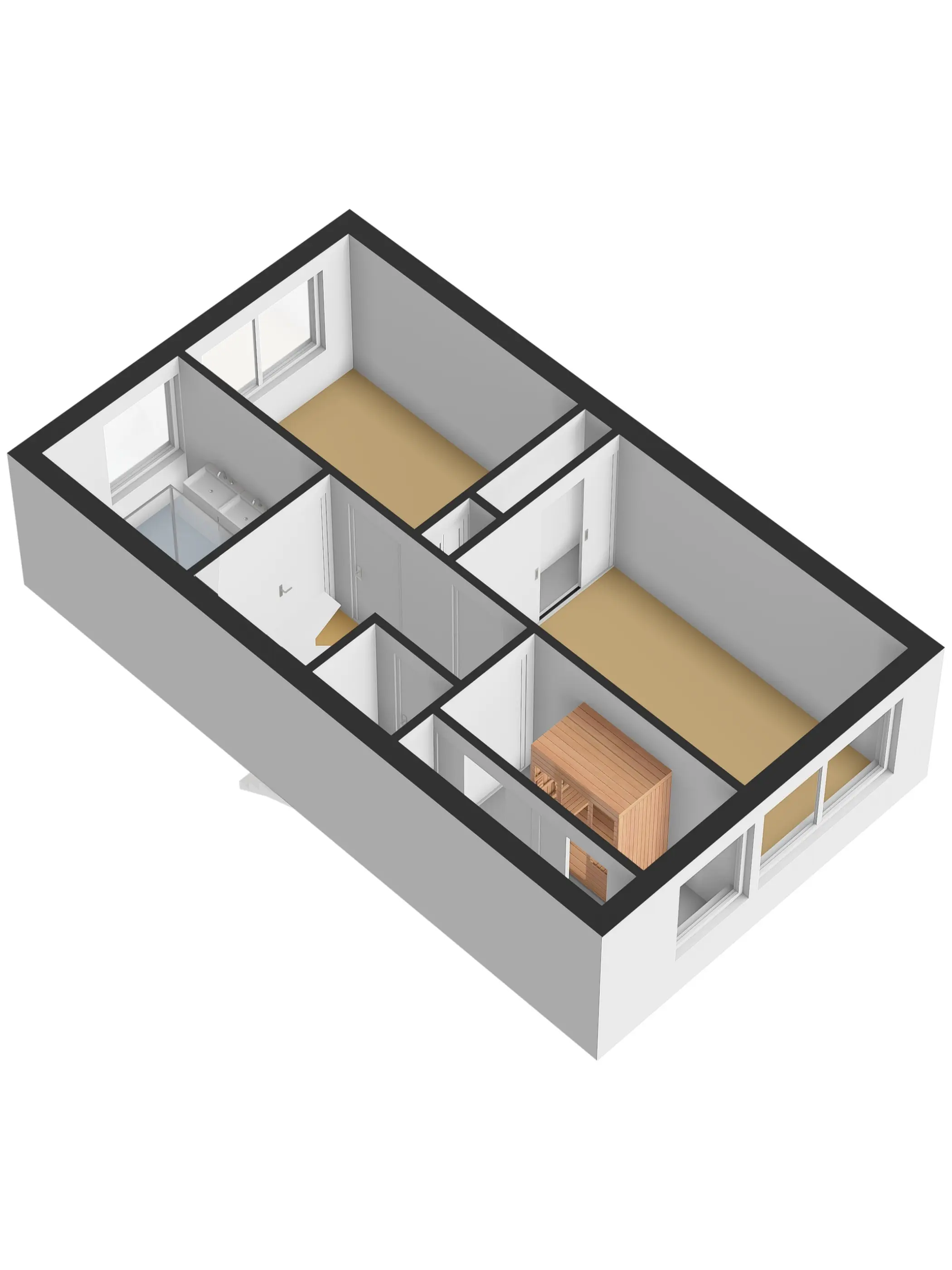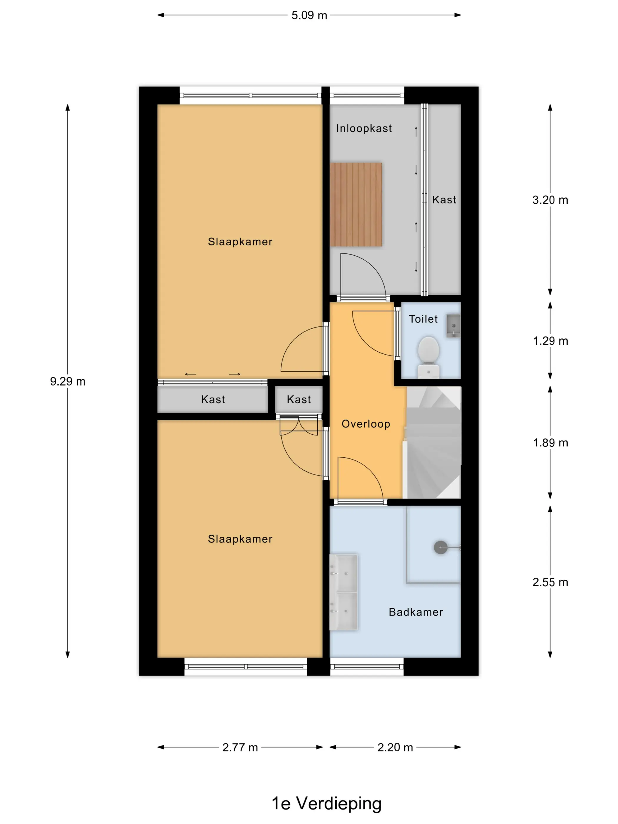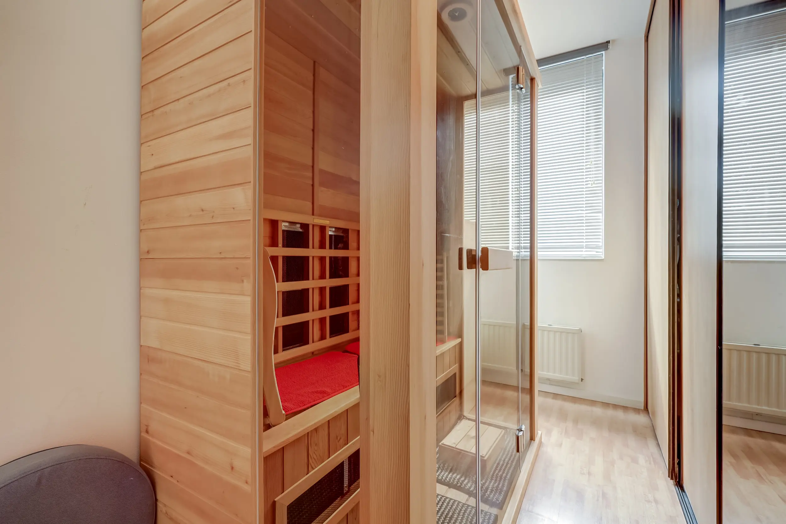 Op de eerste verdieping bevinden zich drie ruime slaapkamers en een badkamer. De slaapkamer (ca. 13 m²) aan de achterzijde beschikt over een vaste schuifkastenwand. De andere slaapkamer (ca. 7 m²) aan de achterzijde heeft een heerlijke sauna en extra vaste kastruimte. De slaapkamer (ca. 12 m²) aan de voorzijde is ook voorzien van een vaste inbouwkast. De slaapkamers op de eerste verdieping zijn afgewerkt met een laminaatvloer.
