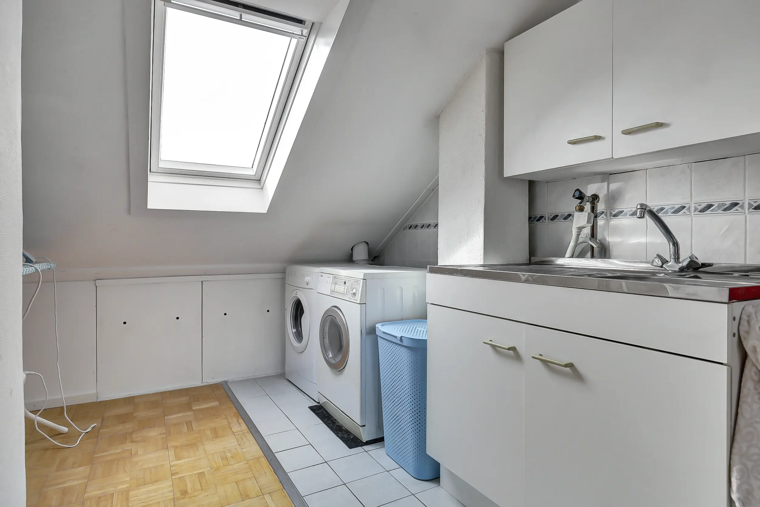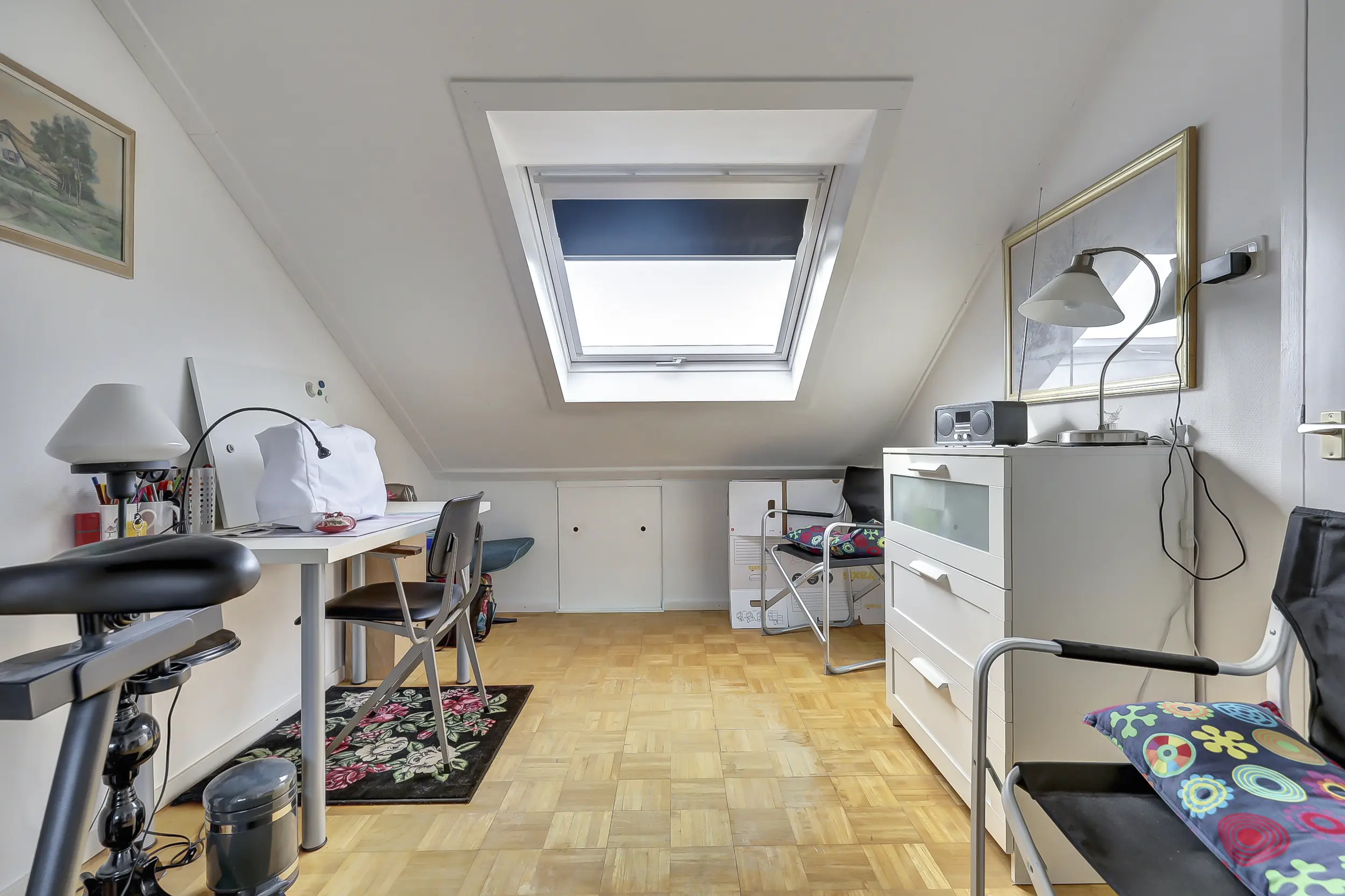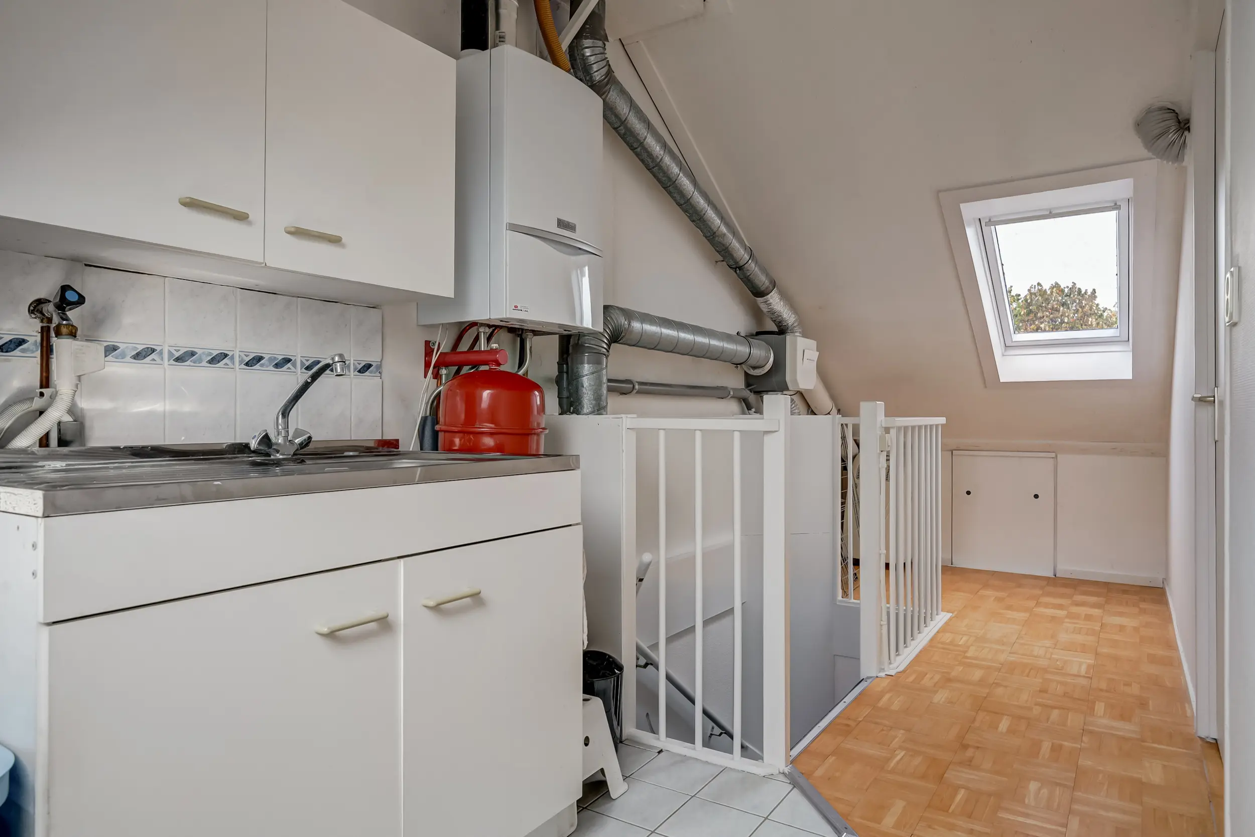 (ca. 20 m²) met dakkapel aan de voorzijde, wat zorgt voor extra licht en ruimte. Hier is eenvoudig een vijfde slaapkamer te realiseren. Daarnaast vind je hier de cv-installatie, aansluitingen voor wasmachine en droger, een klein keukenblokje met warm/koud stromend water en extra bergruimte. De aanwezige dakramen zorgen voor een prettige lichtinval. De tweede verdieping is afgewerkt met een parketvloer.