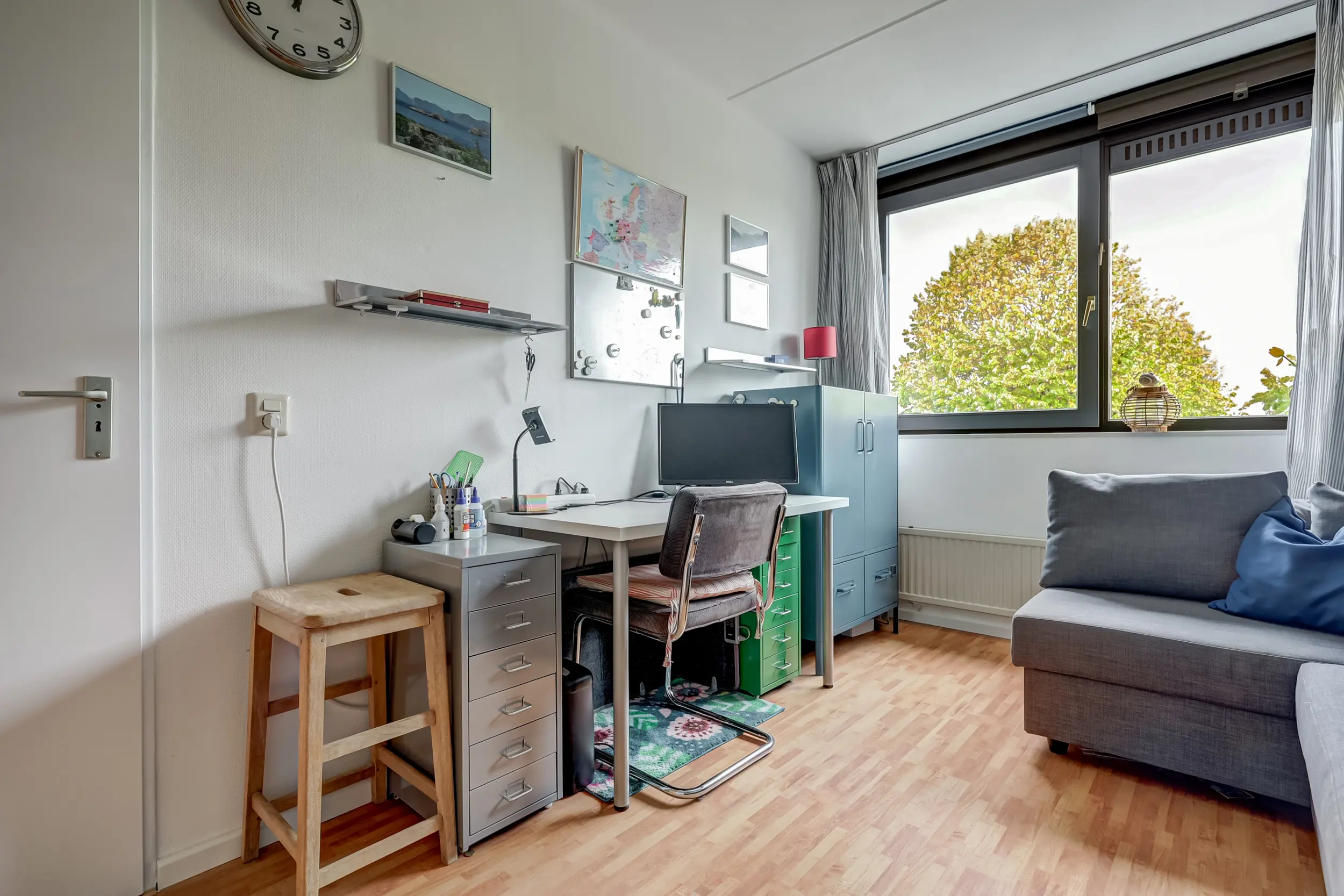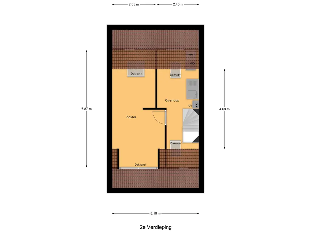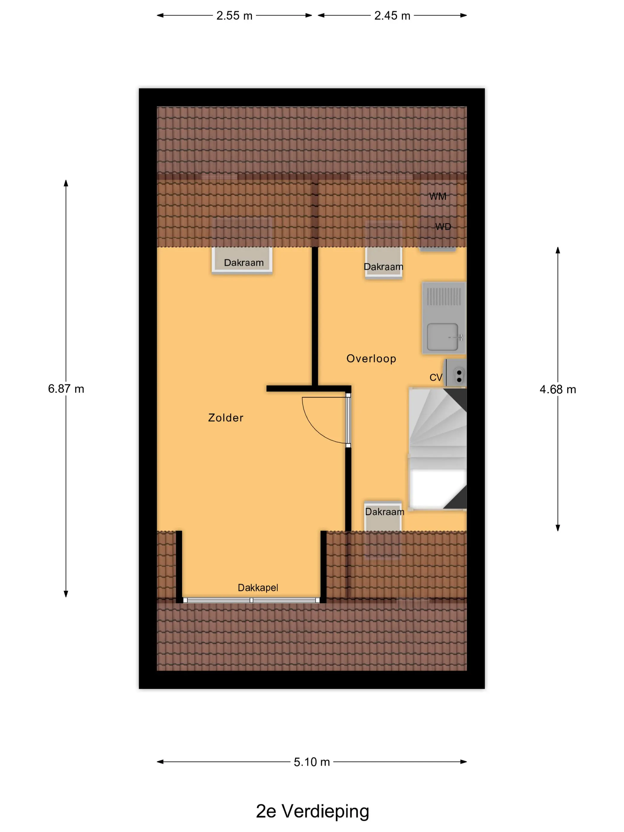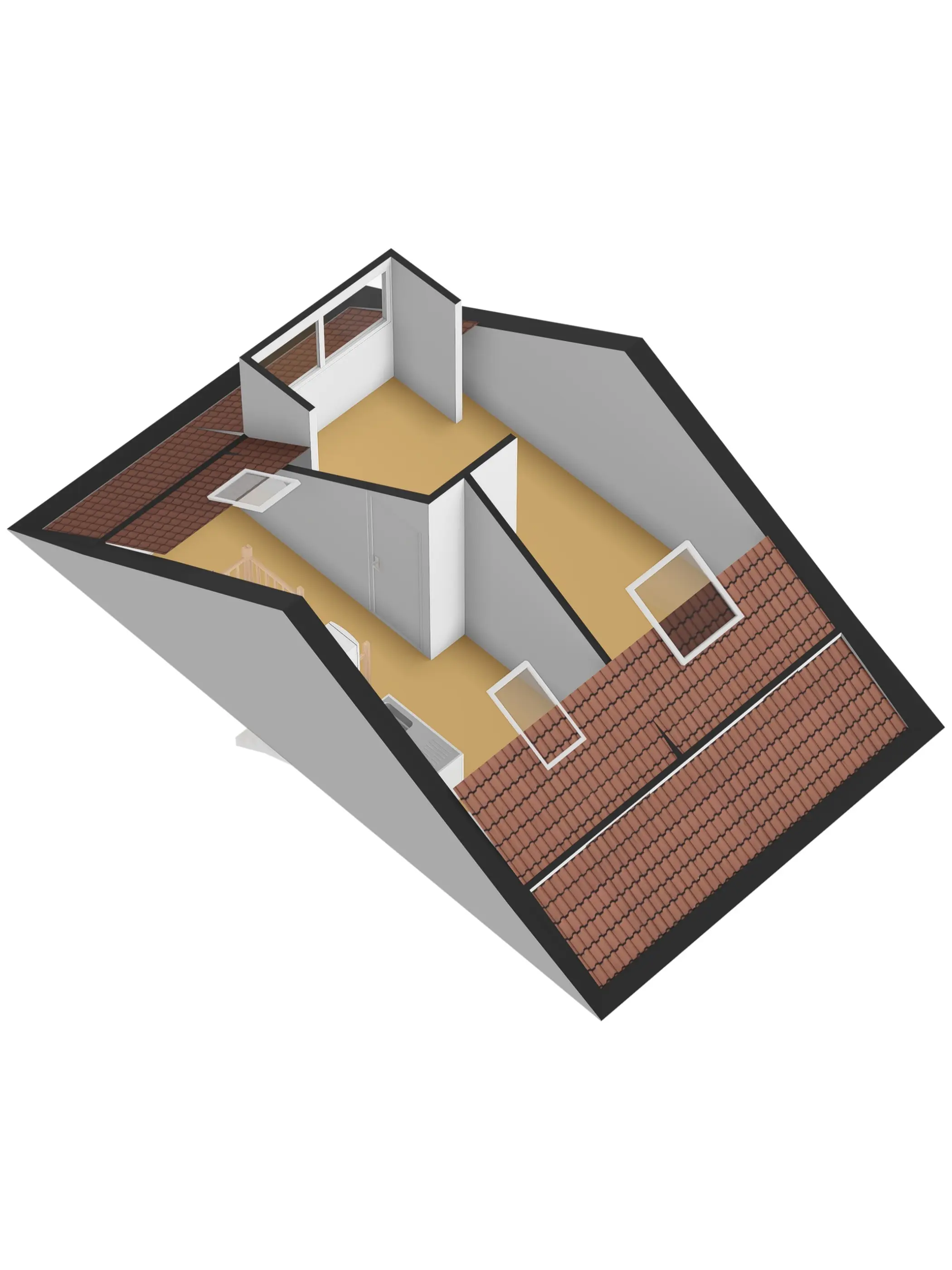 (ca. 20 m²) met dakkapel aan de voorzijde, wat zorgt voor extra licht en ruimte. Hier is eenvoudig een vijfde slaapkamer te realiseren. Daarnaast vind je hier de cv-installatie, aansluitingen voor wasmachine en droger, een klein keukenblokje met warm/koud stromend water en extra bergruimte. De aanwezige dakramen zorgen voor een prettige lichtinval. De tweede verdieping is afgewerkt met een parketvloer.