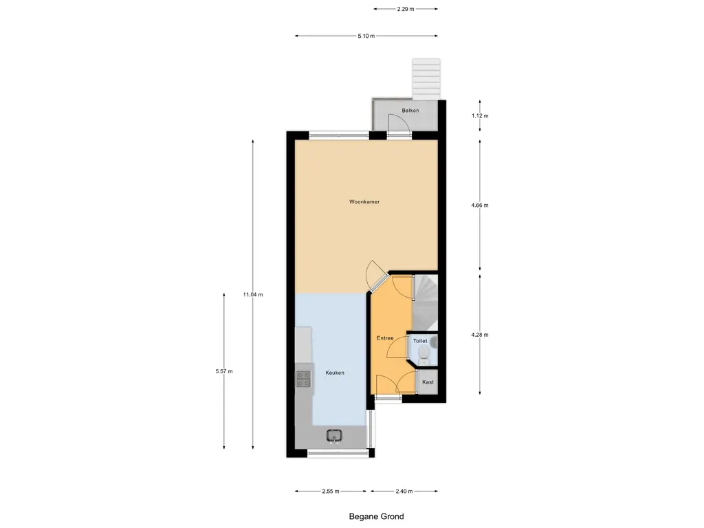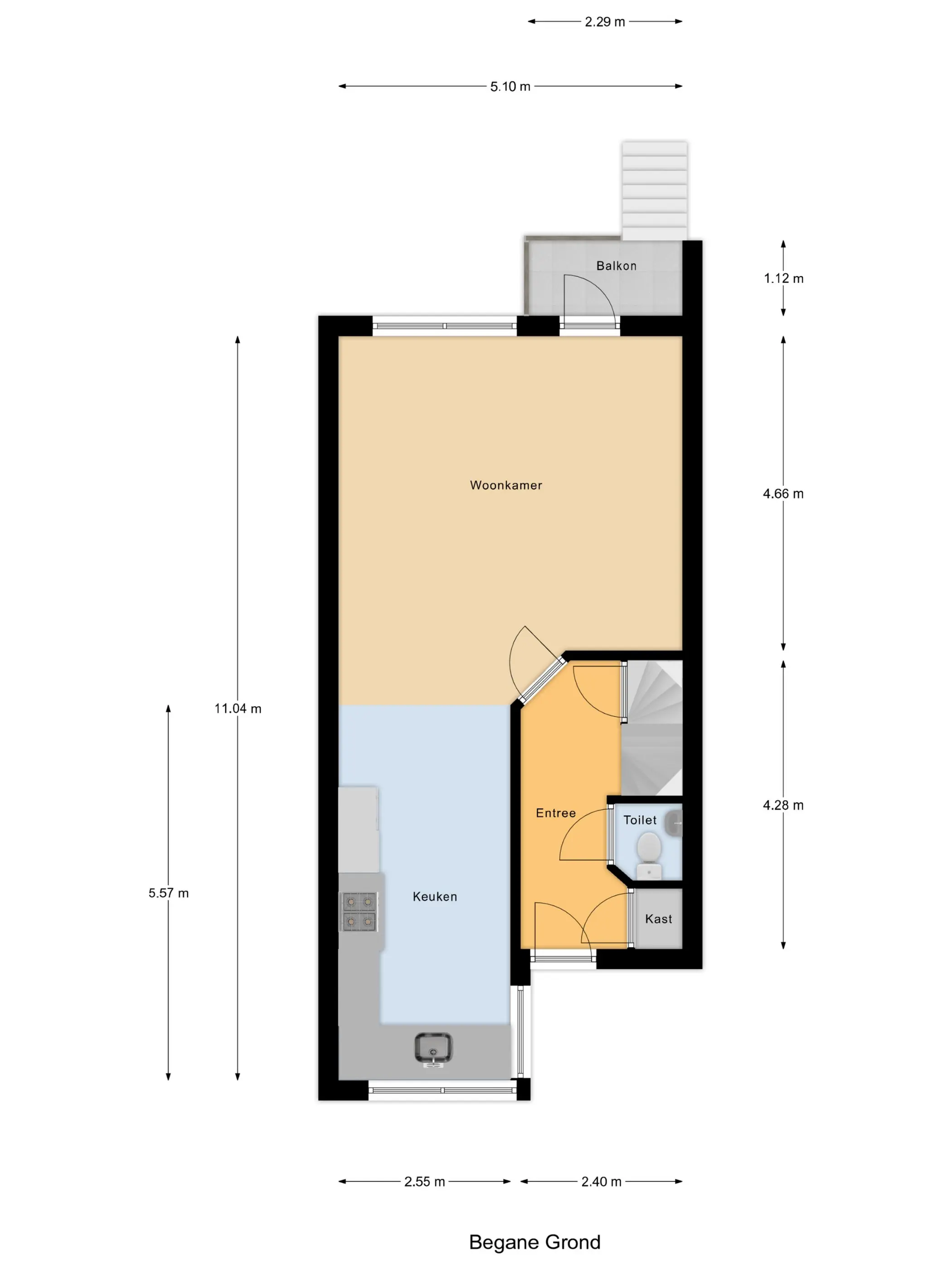Via de trap aan de voorzijde bereik je de entree op de verhoogde begane grond. De hal biedt toegang tot het toilet, de meterkast en de trap naar boven en naar het souterrain. Vanuit de hal stap je de ruime woonkamer (ca. 26 m²) binnen, die dankzij de grote ramen veel lichtinval heeft. De woonkamer heeft een sfeervolle openhaard met een fraaie kalkzandstenen schouw. Aan de achterzijde bevindt zich het balkon, met de trap naar de achtertuin
