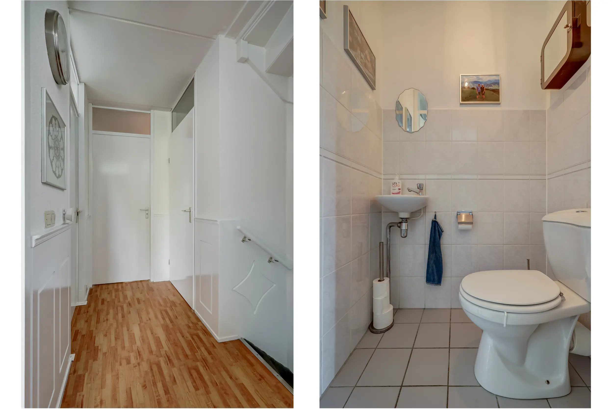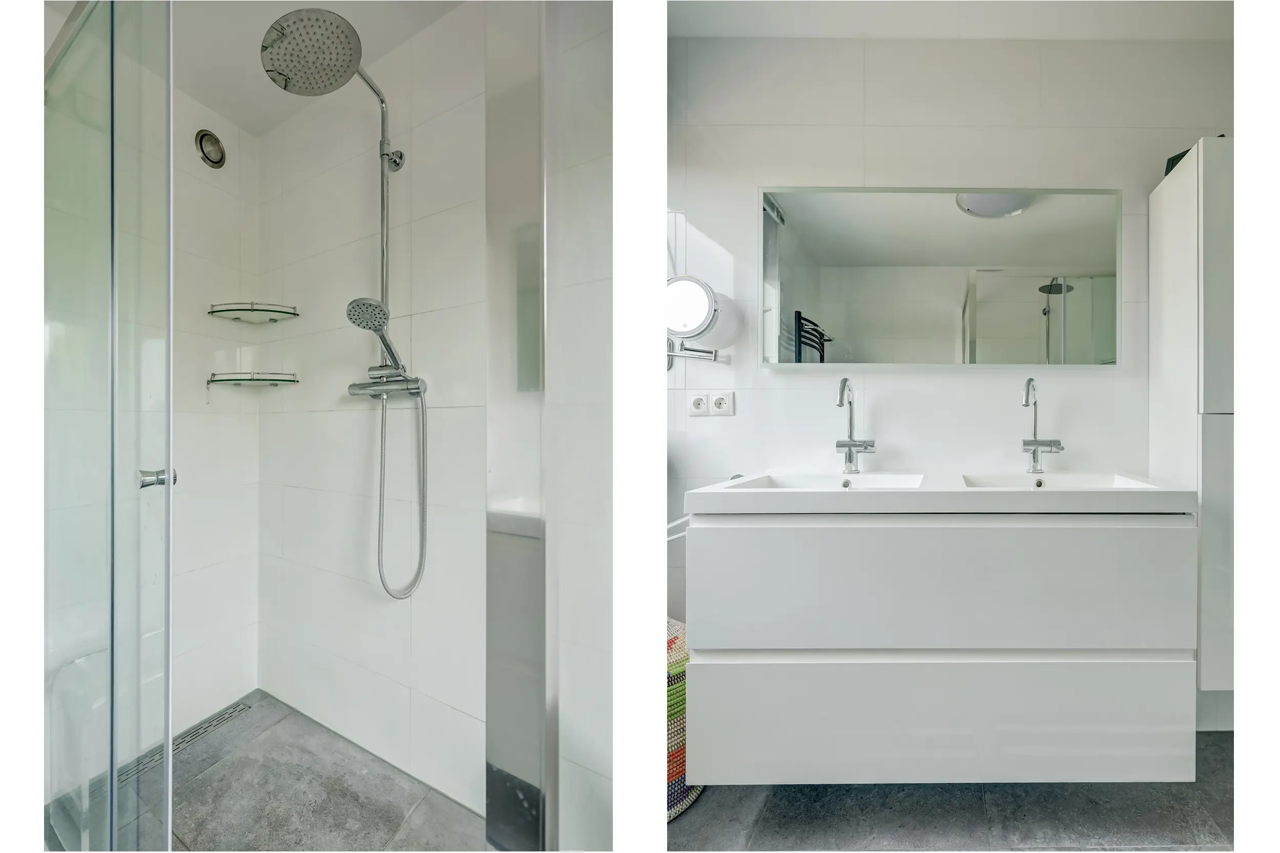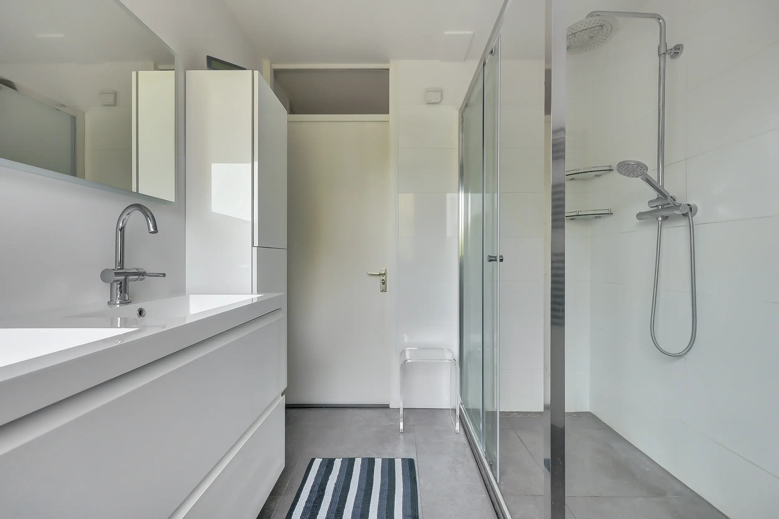 De moderne badkamer (ca. 6 m²) is vernieuwd in 2022 en is geheel betegeld in lichte tinten en uitgerust met een inloopdouche, dubbel wastafelmeubel, spiegel met verlichting en verwarming en een handdoekradiator. Op de overloop is daarnaast een apart toilet aanwezig.