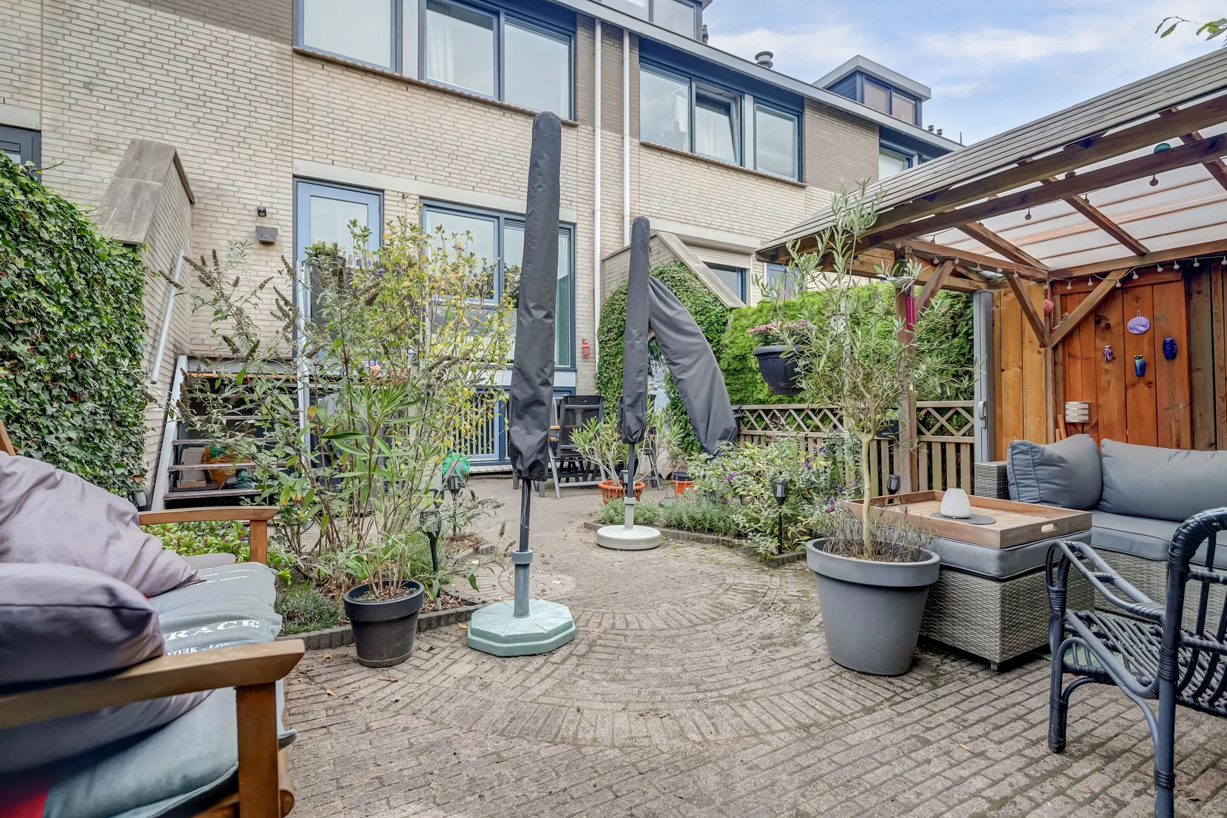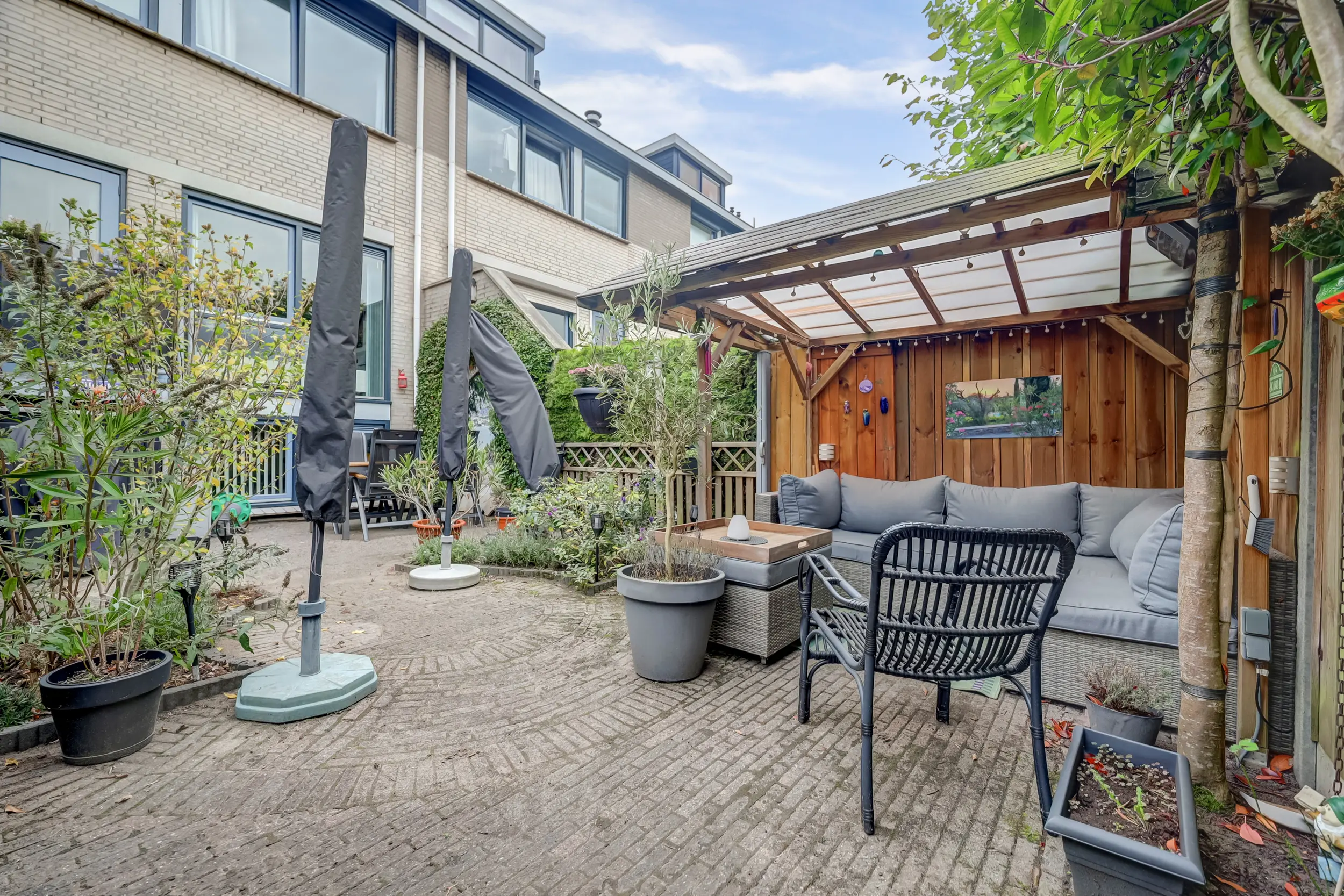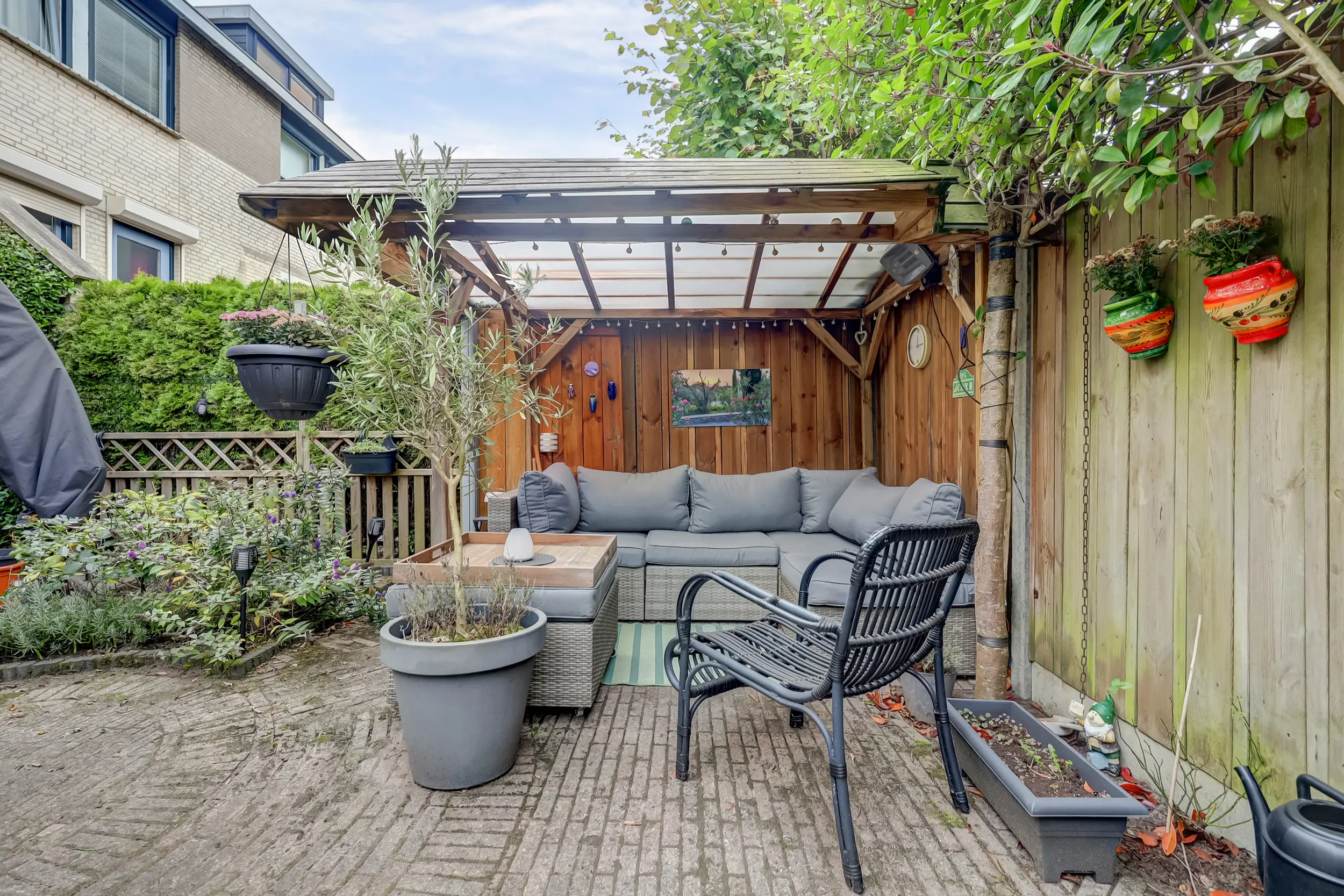 De achtertuin is fraai aangelegd met bestrating, groene borders en een gezellige overkapping met zithoek. Een heerlijke plek om te ontspannen of te genieten van lange zomeravonden. De tuin biedt veel privacy dankzij de hoge groene erfafscheiding en is via een achterom bereikbaar.
