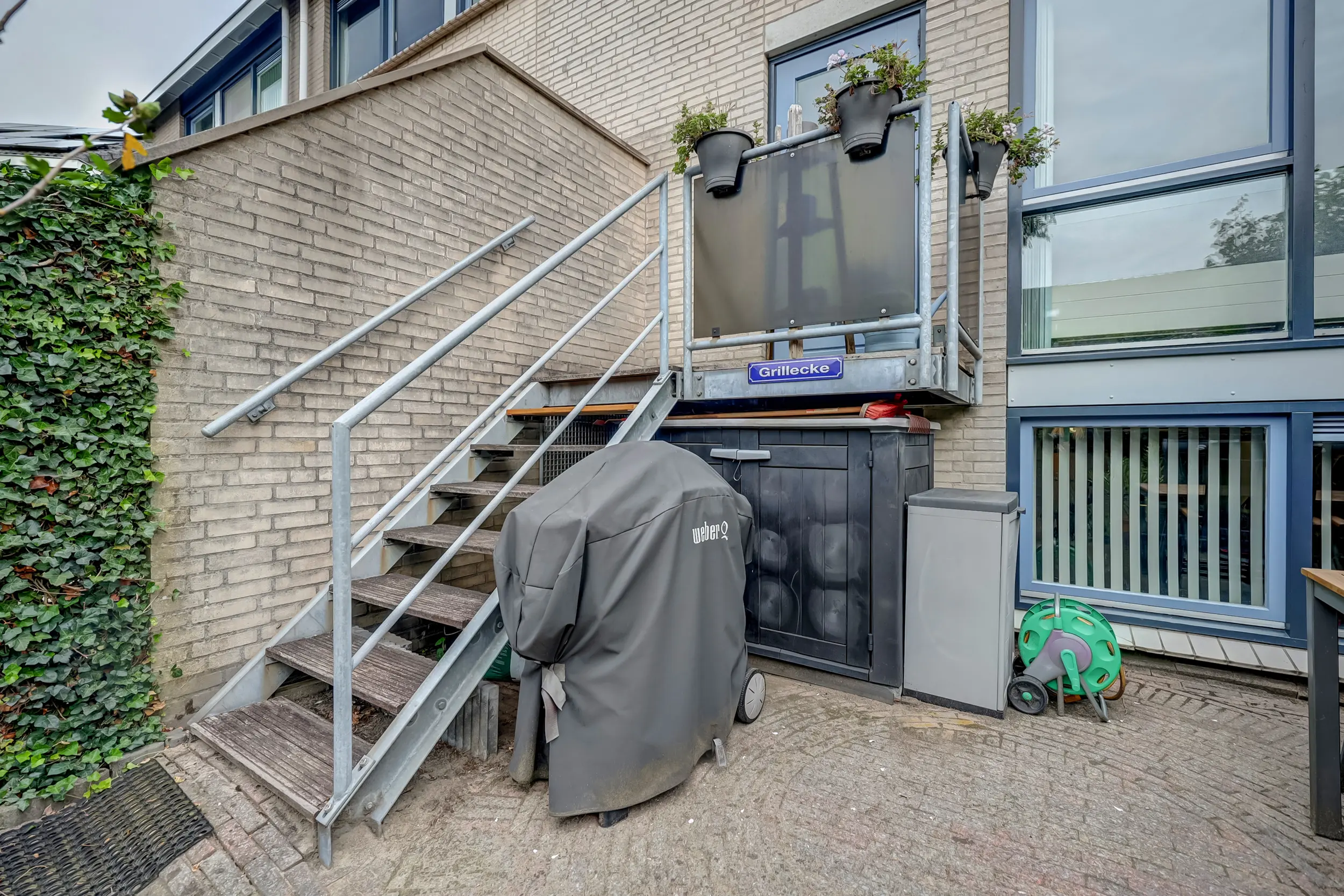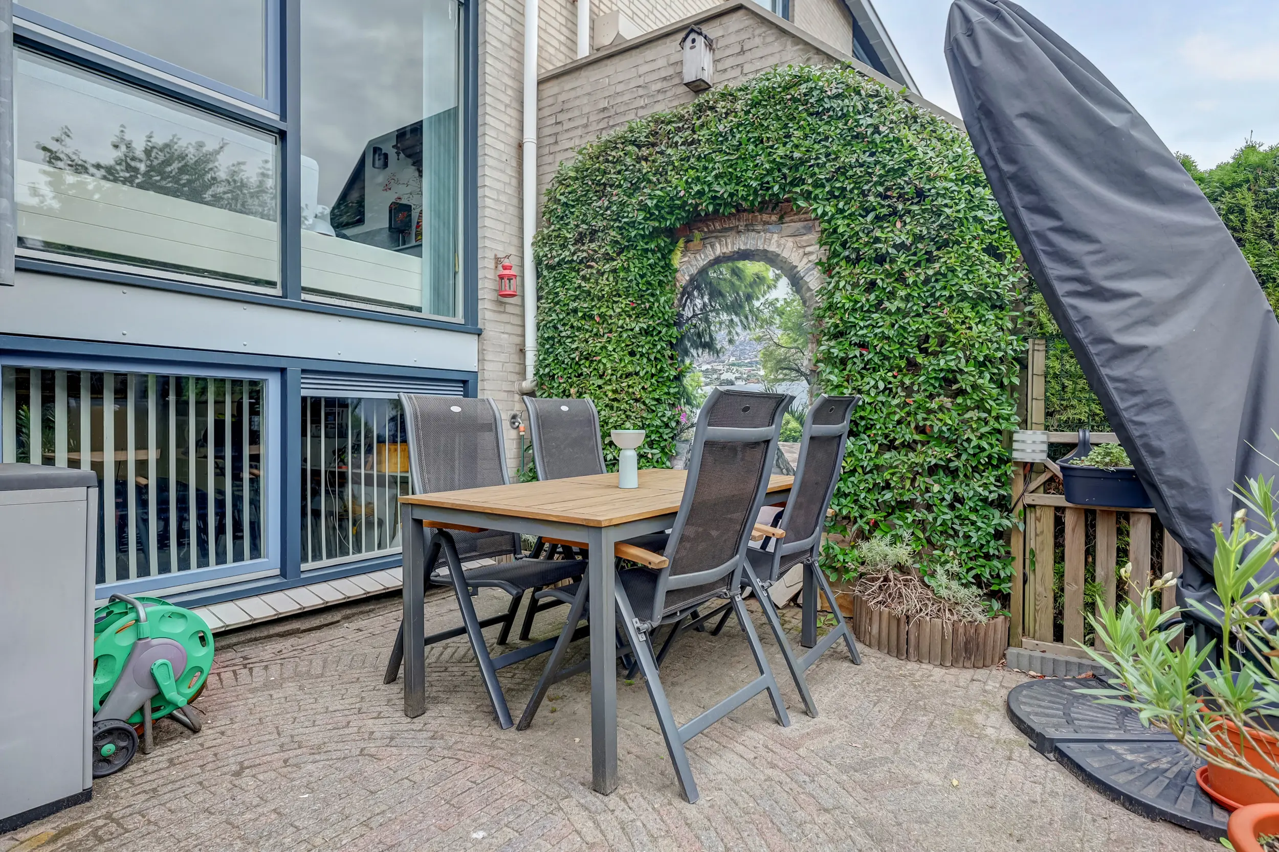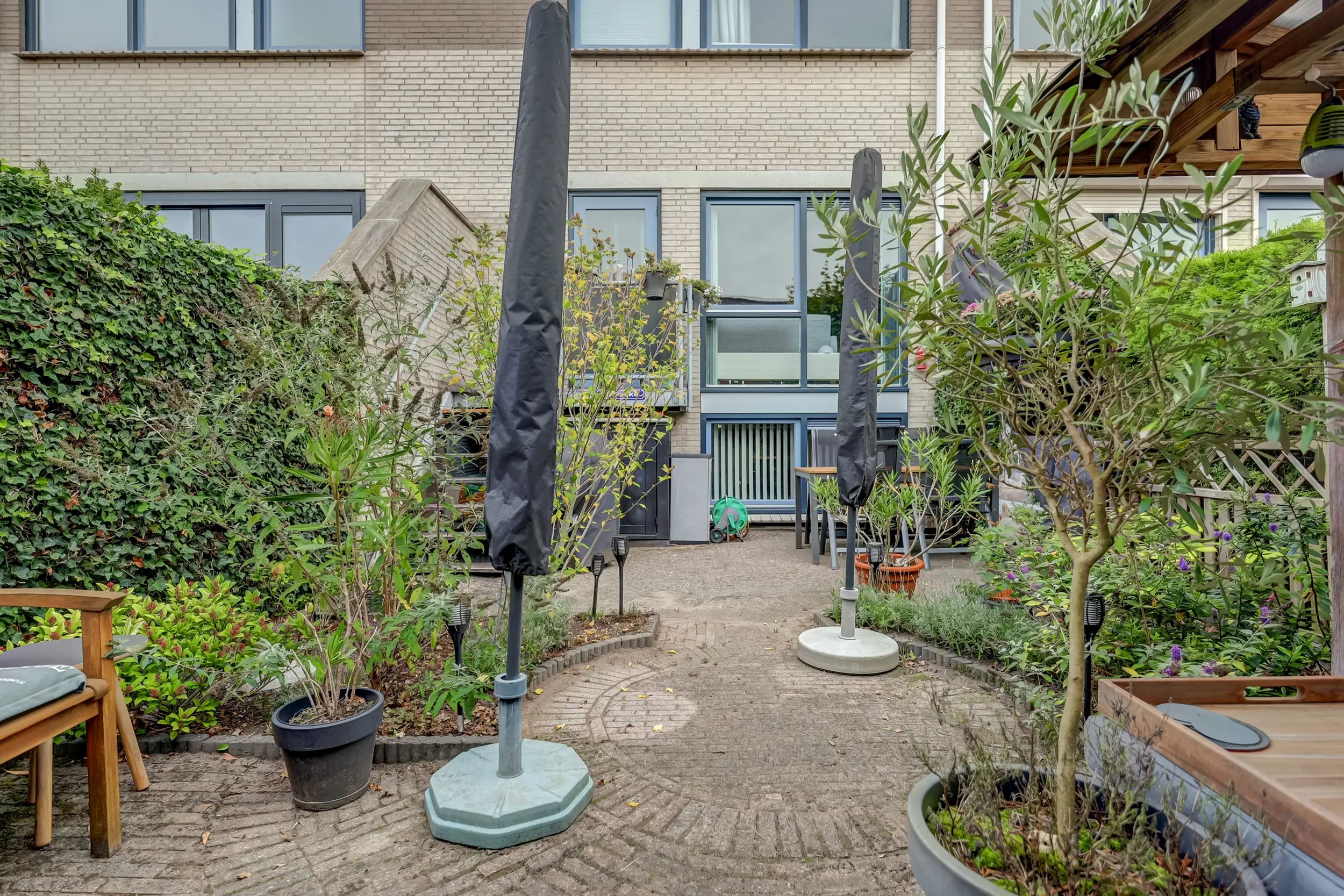 De achtertuin is fraai aangelegd met bestrating, groene borders en een gezellige overkapping met zithoek. Een heerlijke plek om te ontspannen of te genieten van lange zomeravonden. De tuin biedt veel privacy dankzij de hoge groene erfafscheiding en is via een achterom bereikbaar.