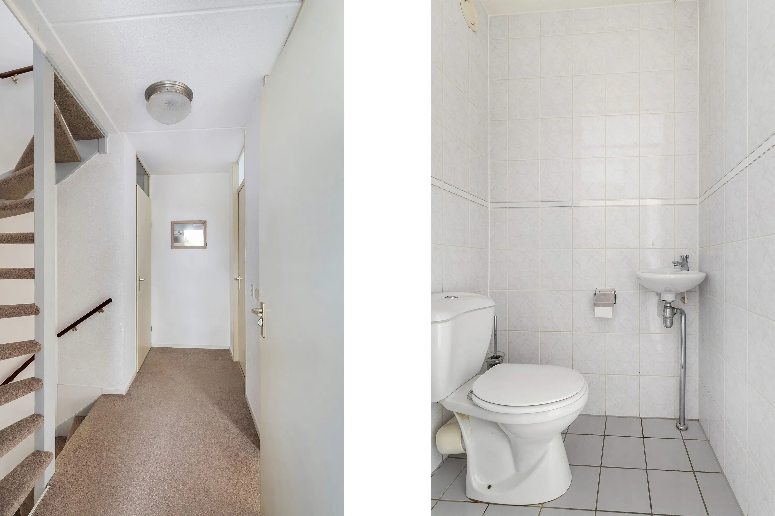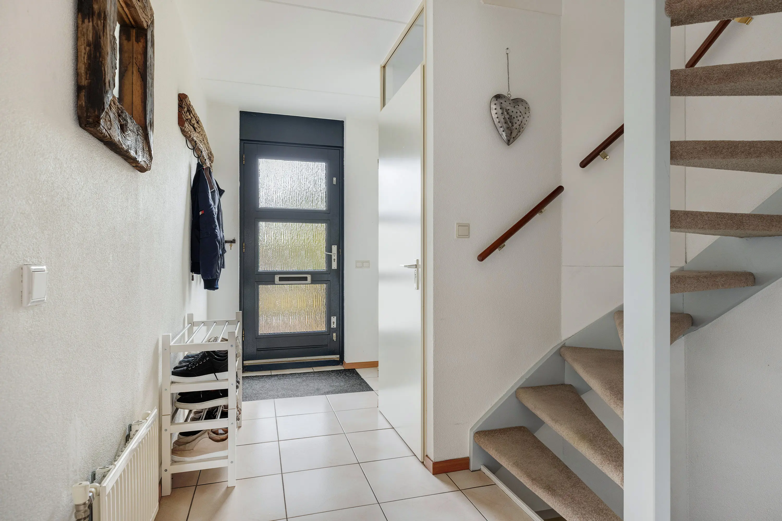 Via de trap aan de voorzijde kom je bij de entreehal met meterkast, toilet, duoblok met fonteintje, wit betegeld en trappen naar zowel het souterrain als de bovenverdieping.