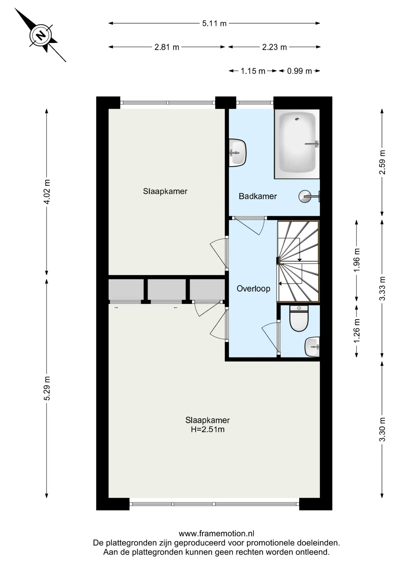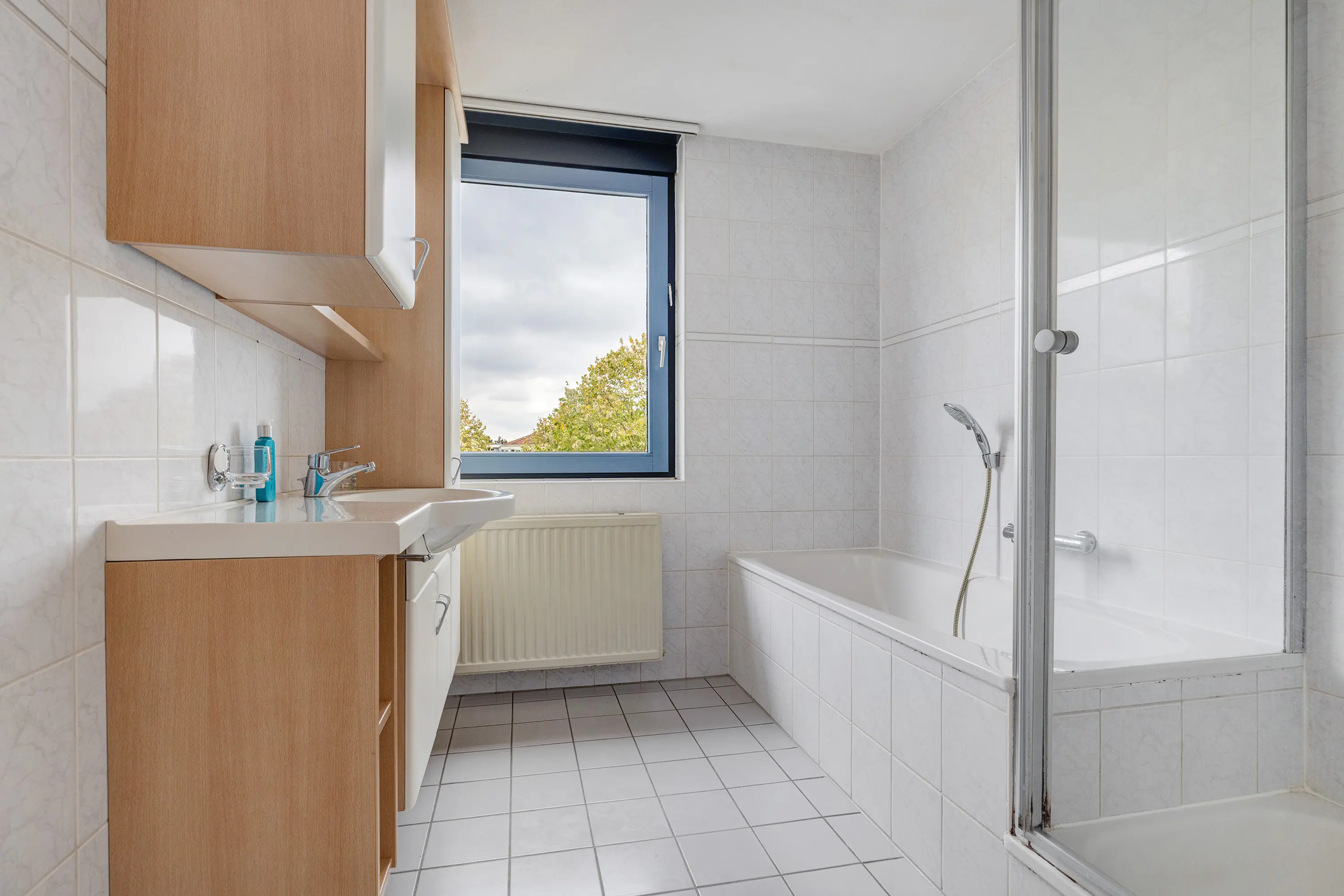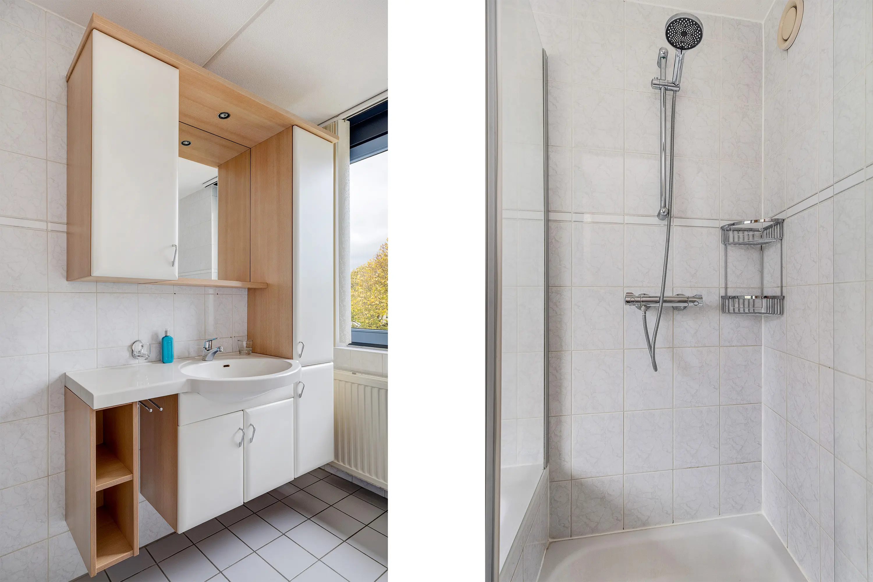 De badkamer is volledig betegeld en voorzien van een ligbad, douchecabine en wastafelmeubel met spiegel. Op de overloop bevindt zich een apart toilet (duoblok met fonteintje), eveneens wit betegeld.