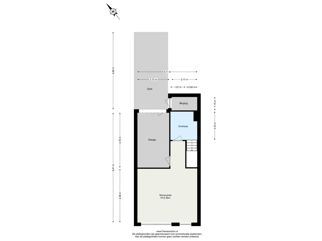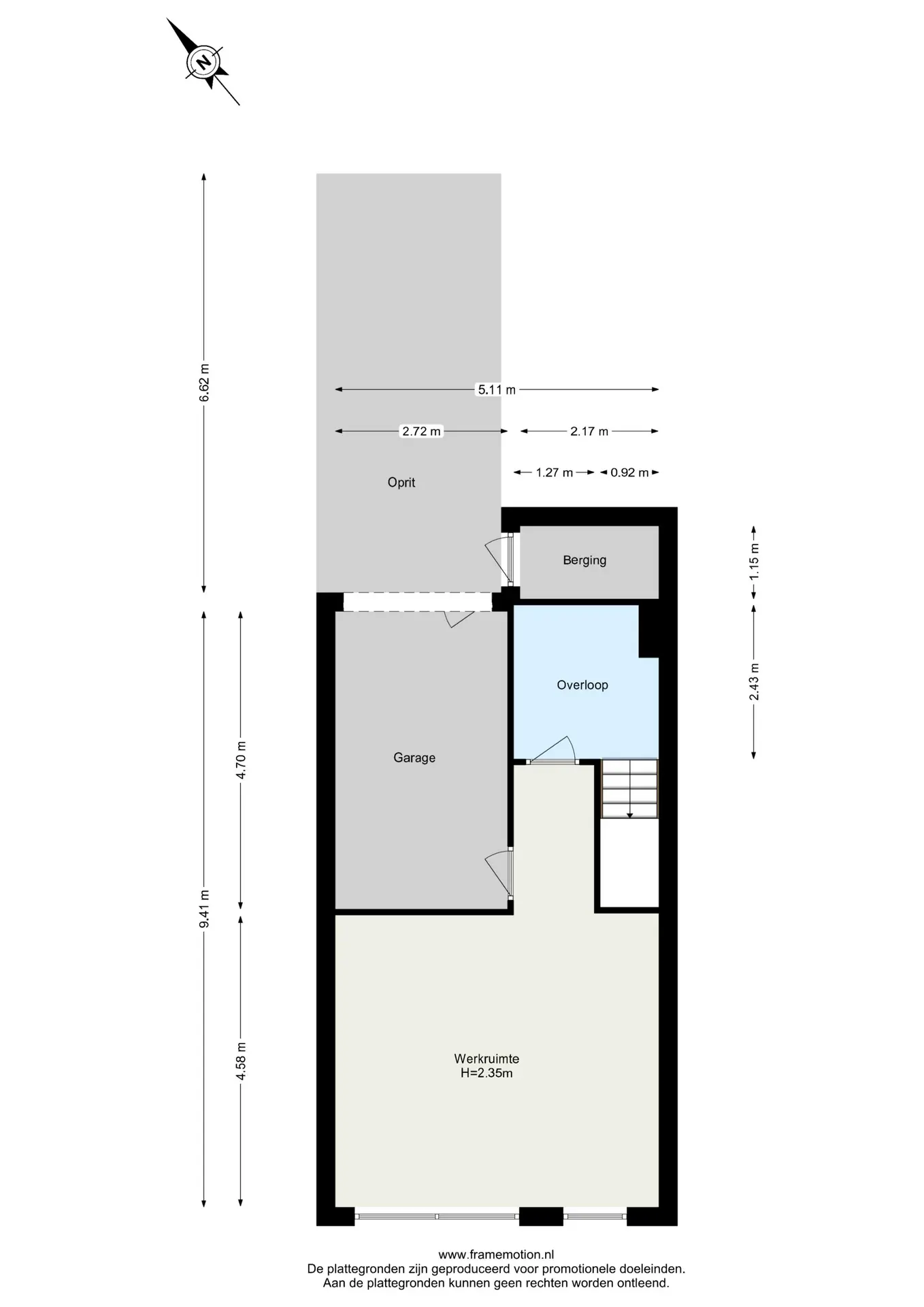 De inpandige garage is van binnenuit bereikbaar via een kantel- en loopdeur en biedt bovendien via de garagedeur directe toegang tot het souterrain. De garage is betegeld en biedt ruimte voor auto, fietsen en extra opslag. Voor de garage ligt een eigen oprit met parkeergelegenheid, en naast de woning bevindt zich een buitenberging voor extra opbergruimte.