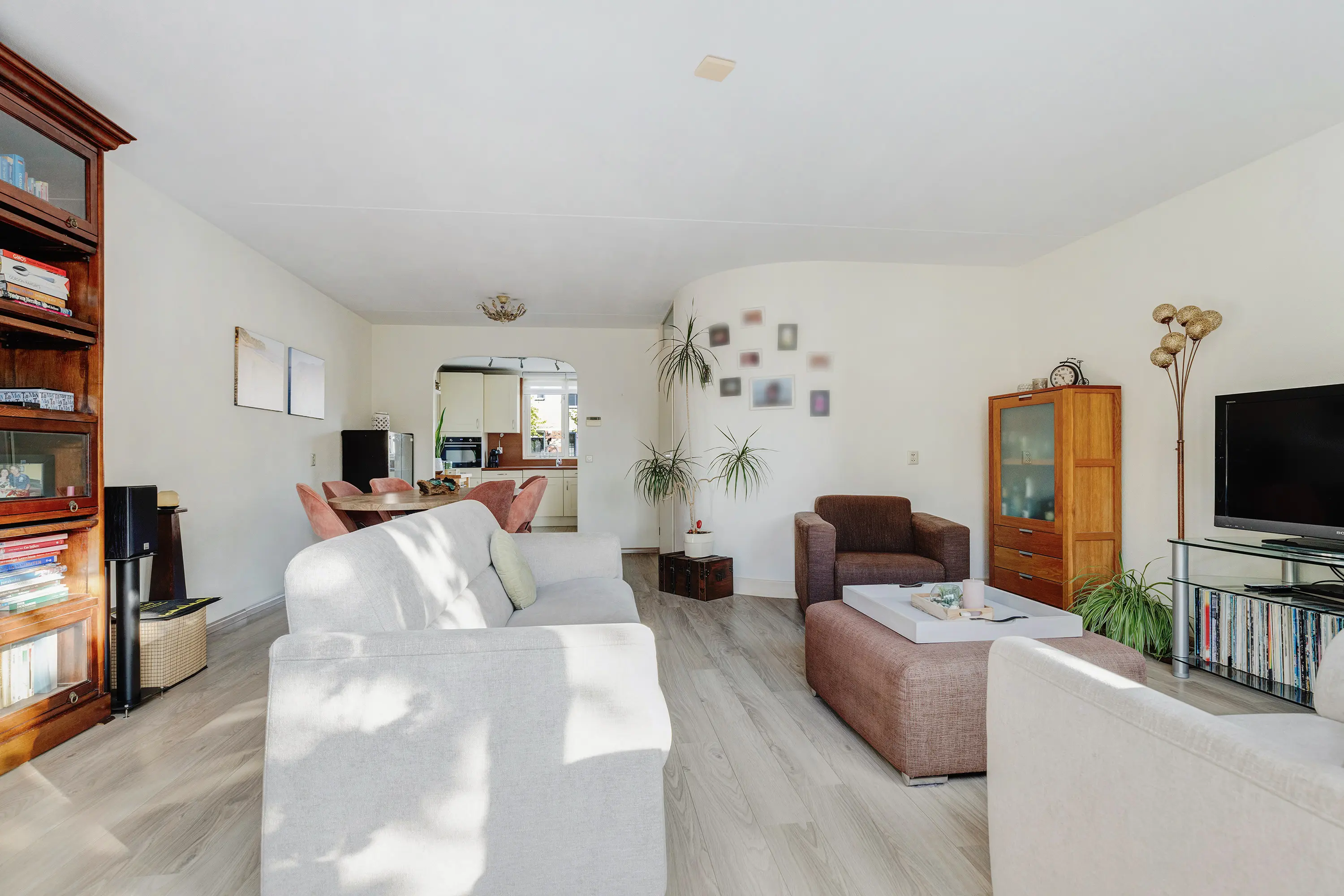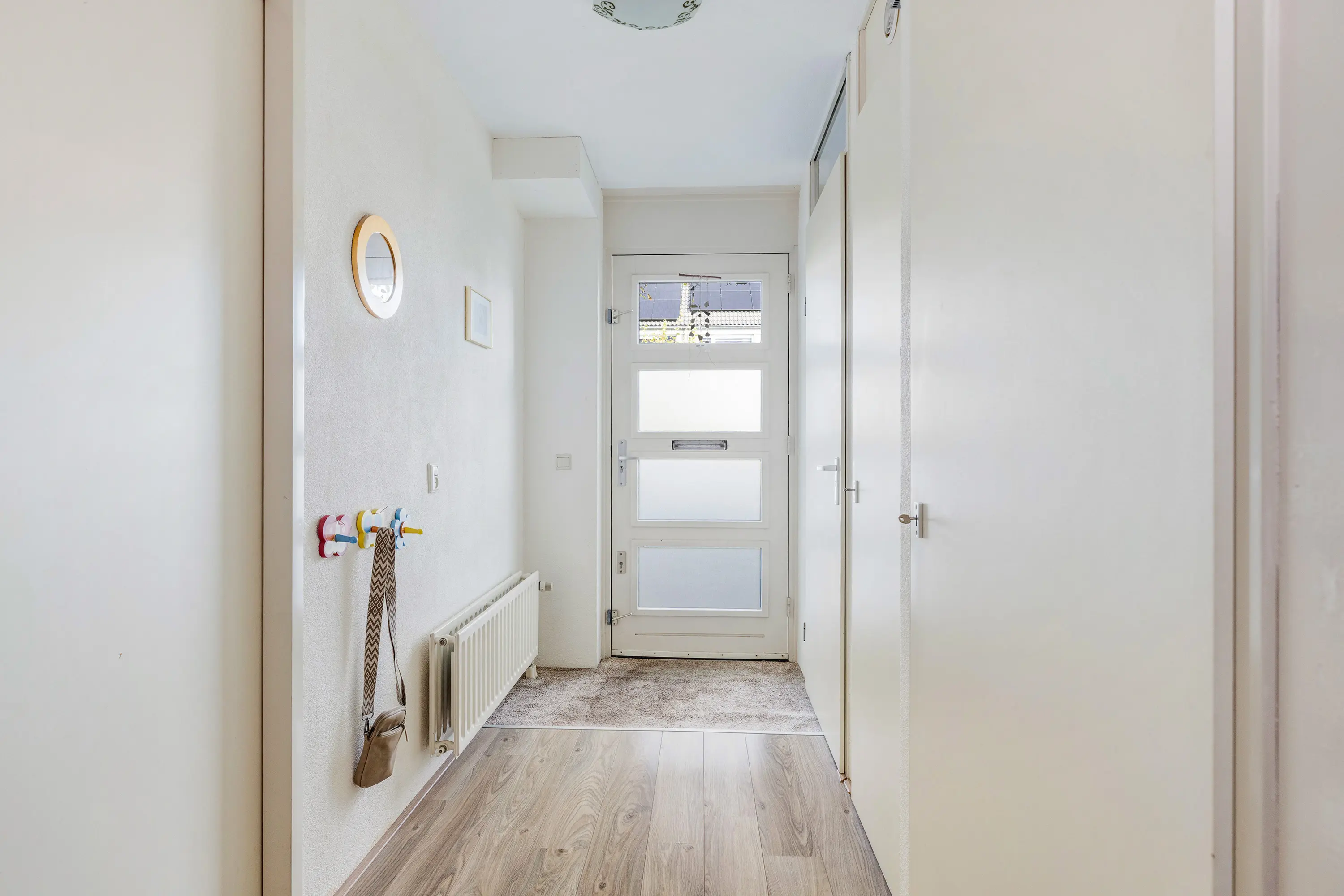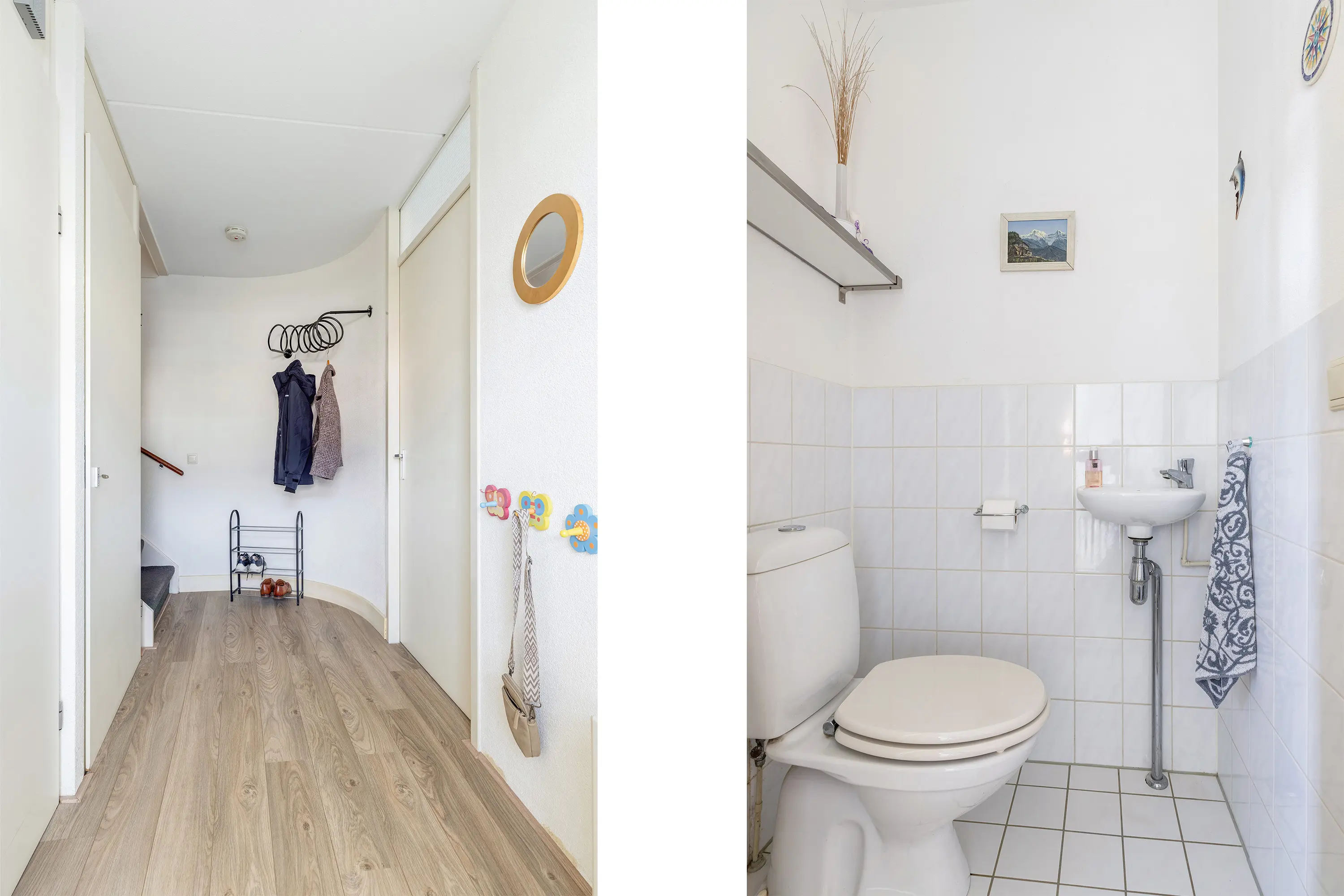Bij binnenkomst valt direct de ruime hal op met garderobe, meterkast en een net afgewerkte toiletruimte met fonteintje. Vanuit de hal stap je de lichte woonkamer in, een gezellige leefruimte met openslaande deuren naar de zonnige achtertuin. Dankzij de grote raampartijen geniet je hier van volop daglicht en een prettig uitzicht op het groen.