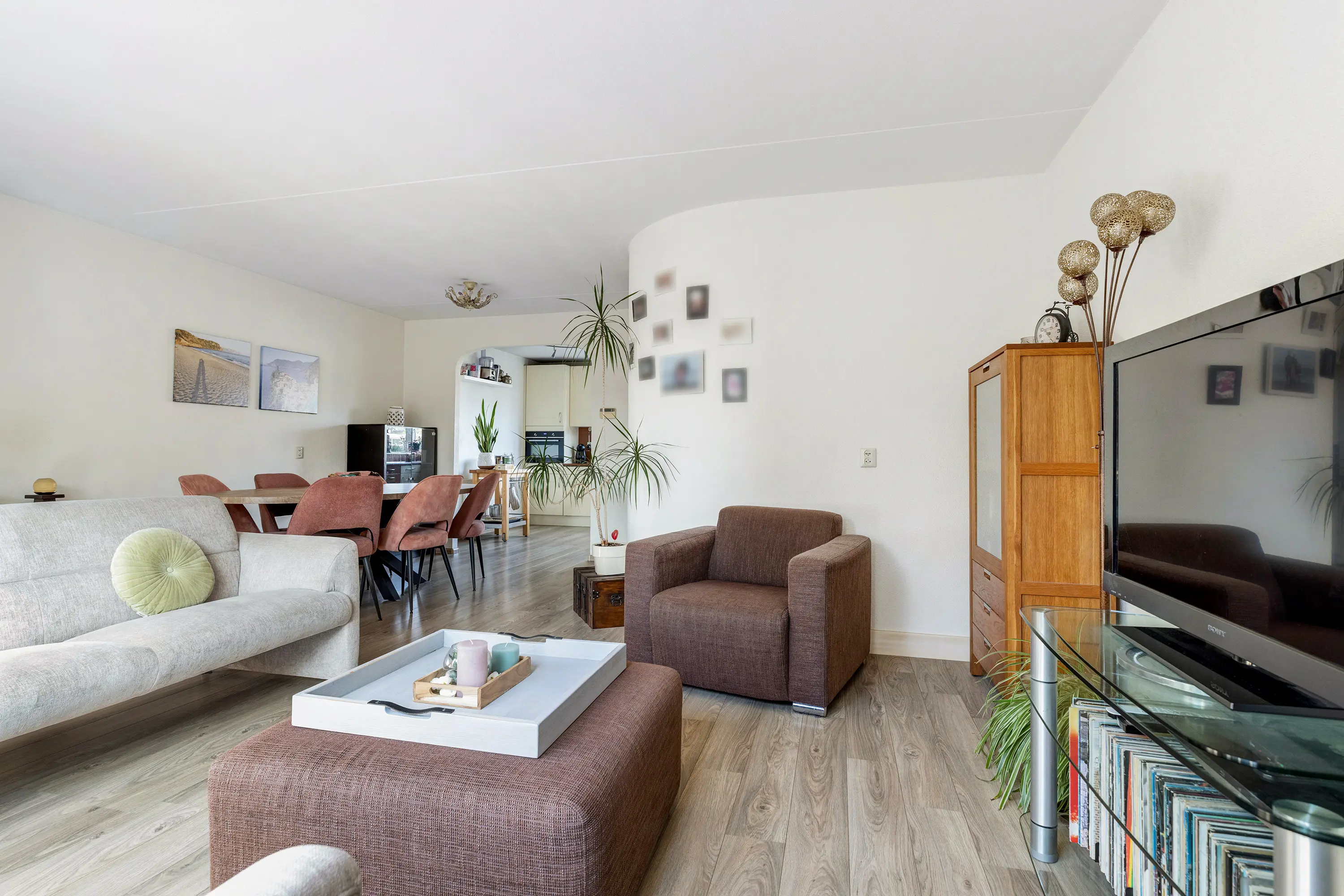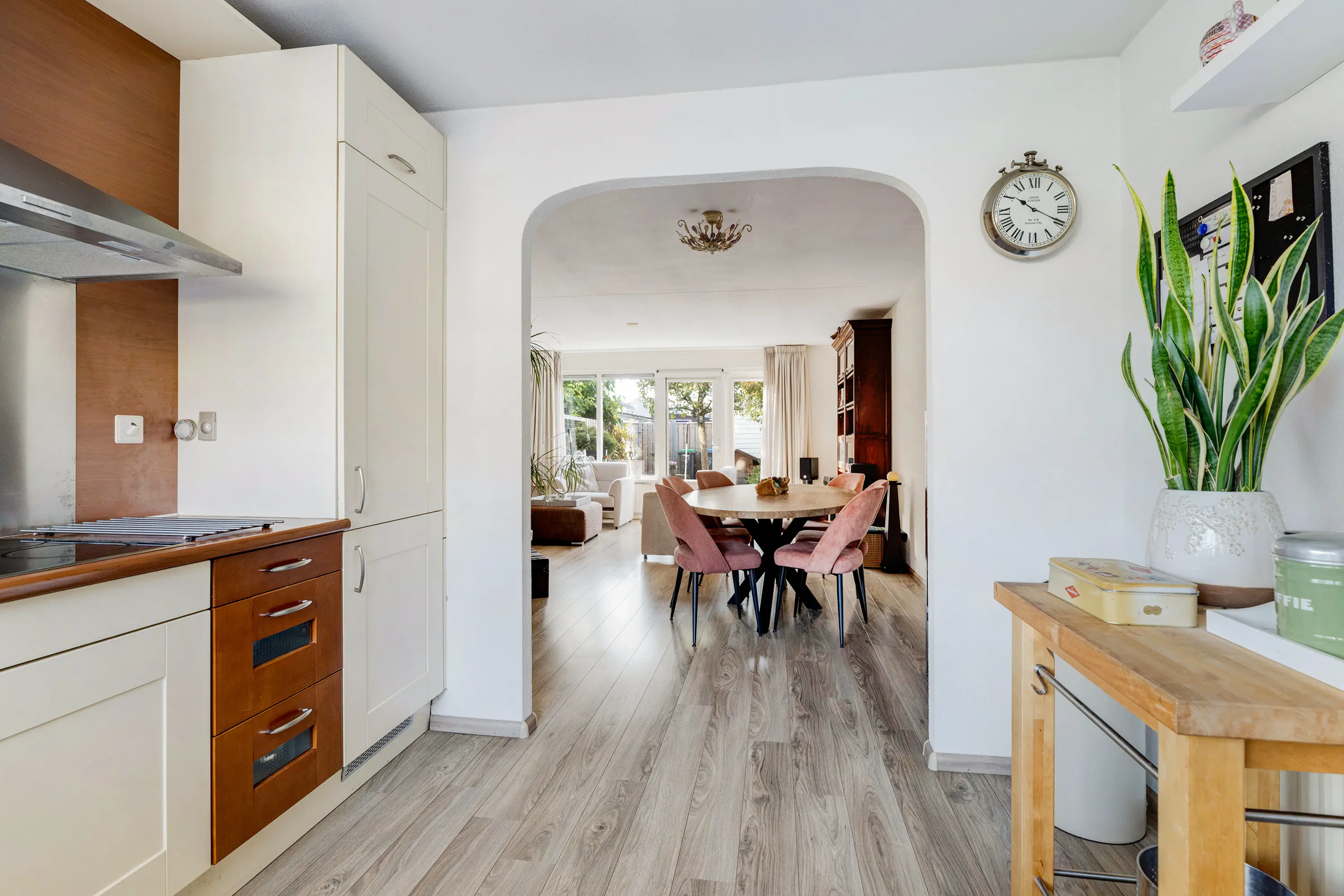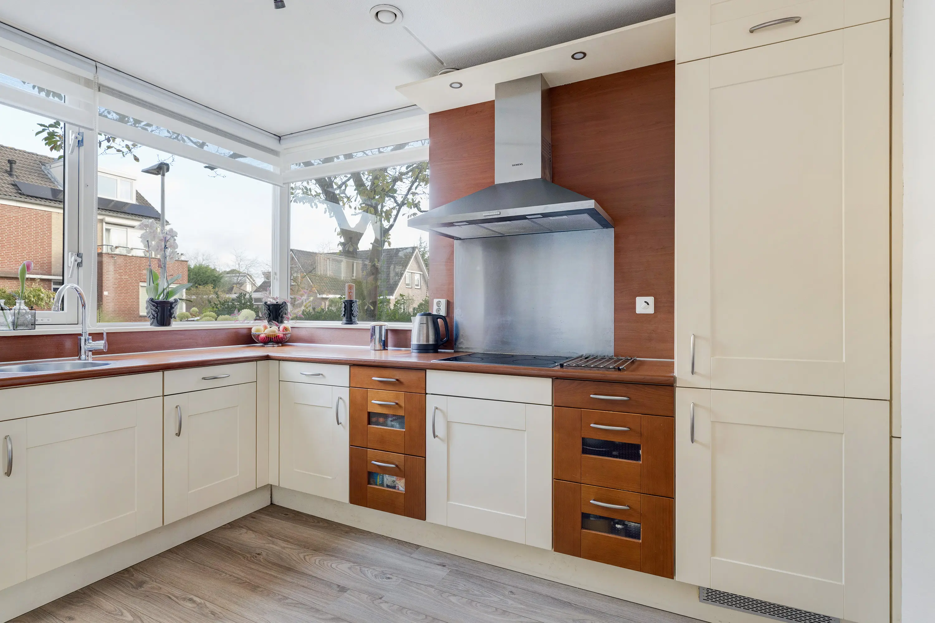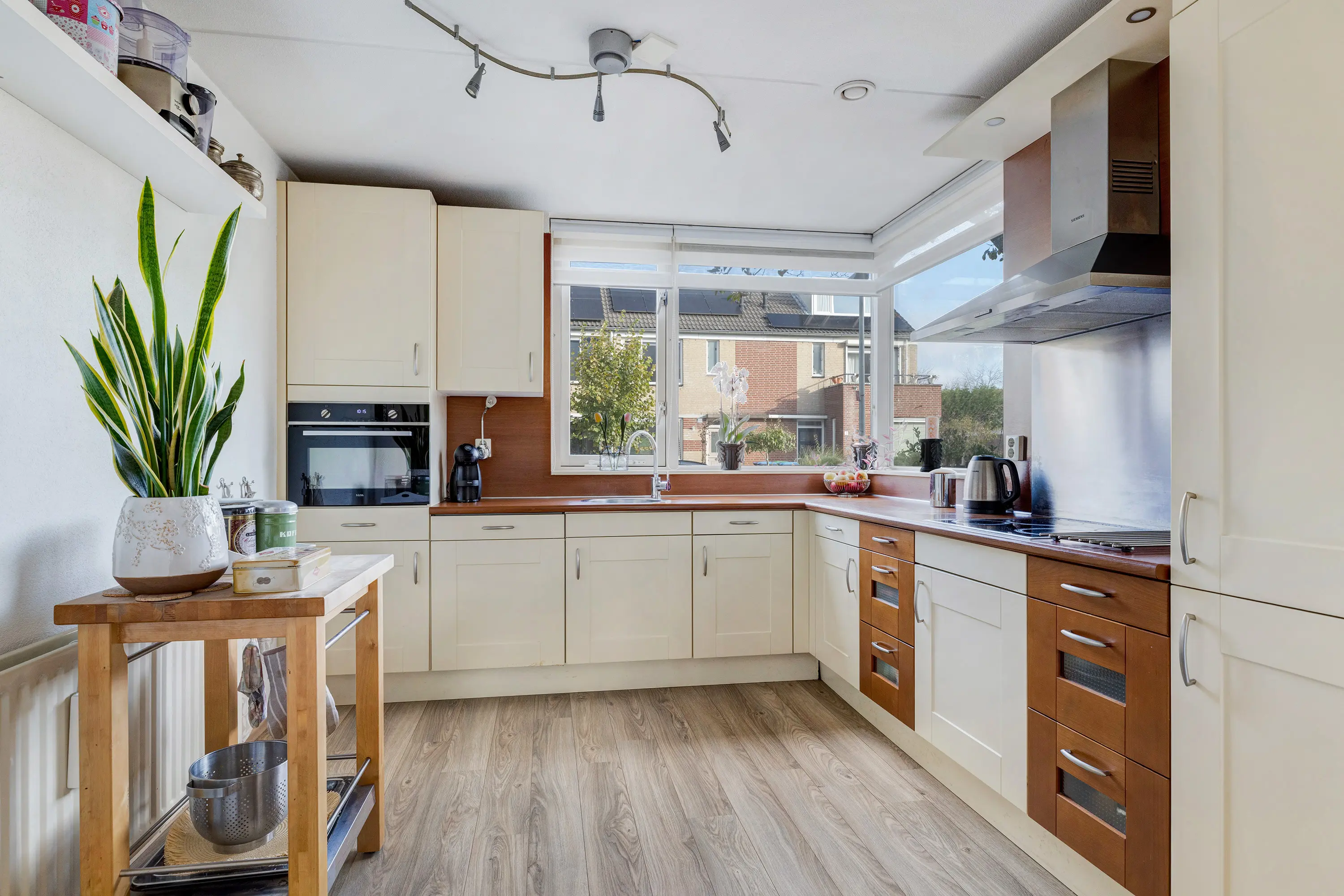 De open keuken ligt aan de voorzijde van de woning en is via een charmante ronde toog verbonden met de woonkamer. De keuken is opgesteld in een praktische hoekopstelling en voorzien van diverse inbouwapparatuur: een 4-pits keramische kookplaat, RVS afzuigkap, koel/vriescombinatie, vaatwasser en combi-oven. De lichte vanillekleurige kasten en het kunststof werkblad zorgen voor een tijdloze uitstraling.