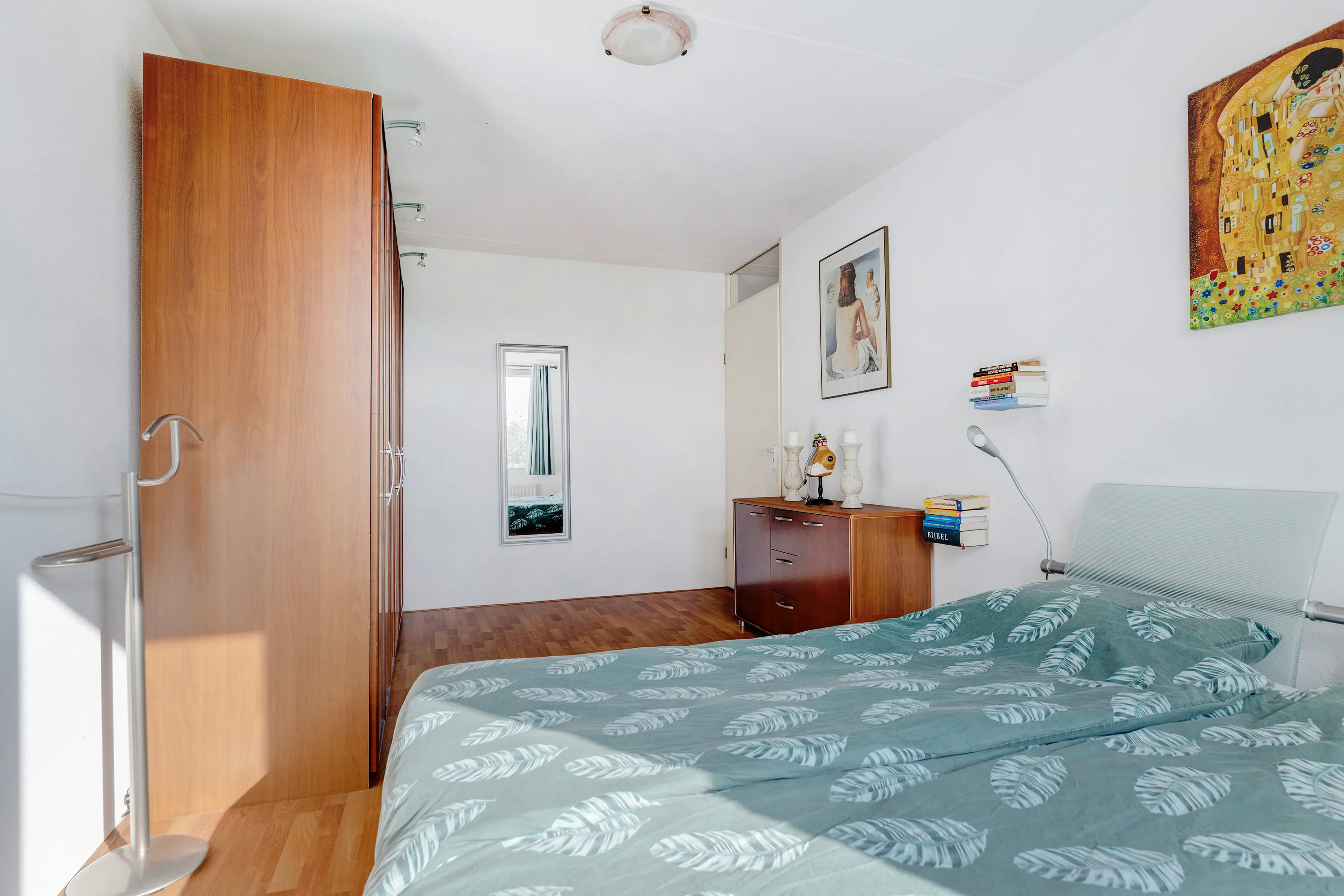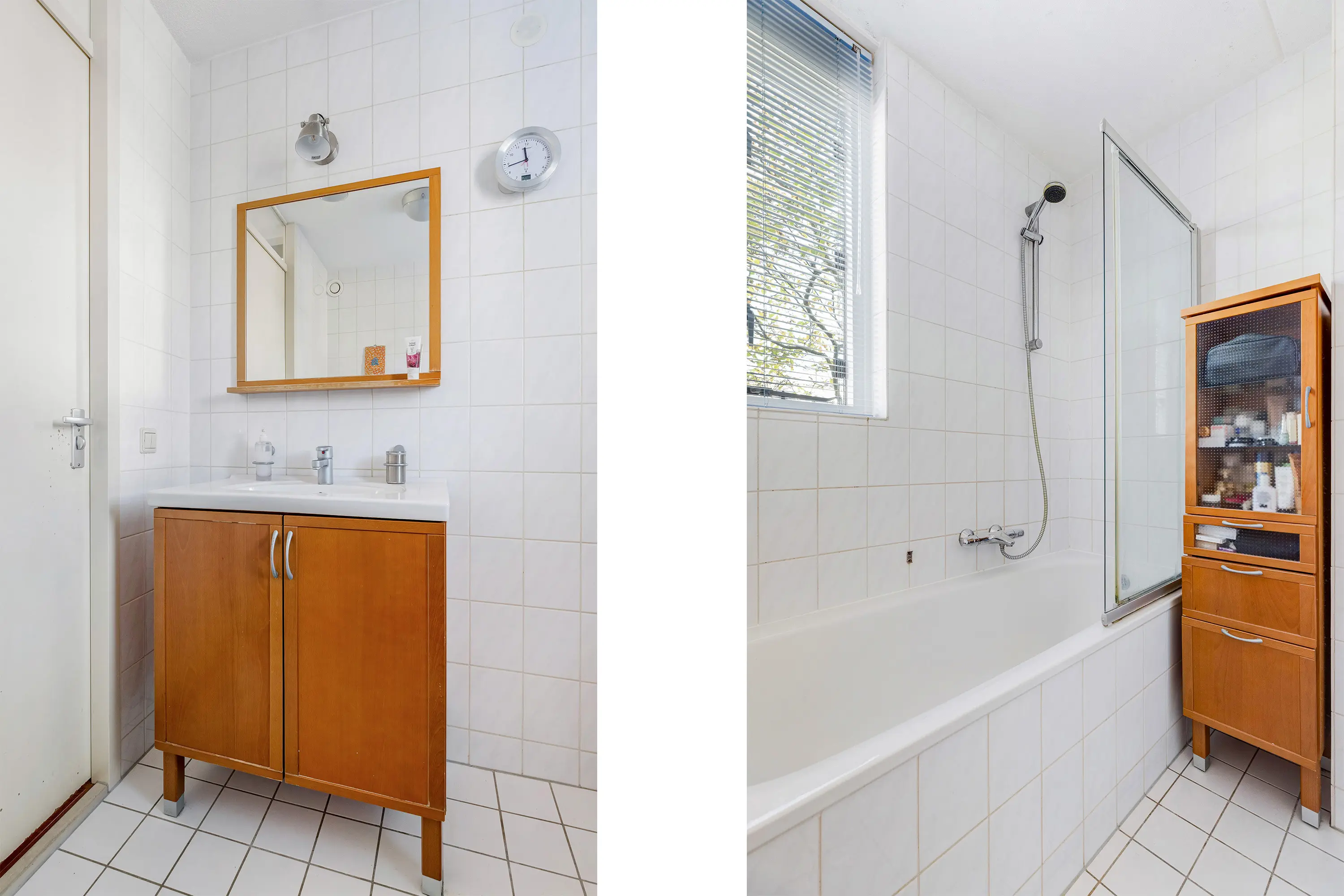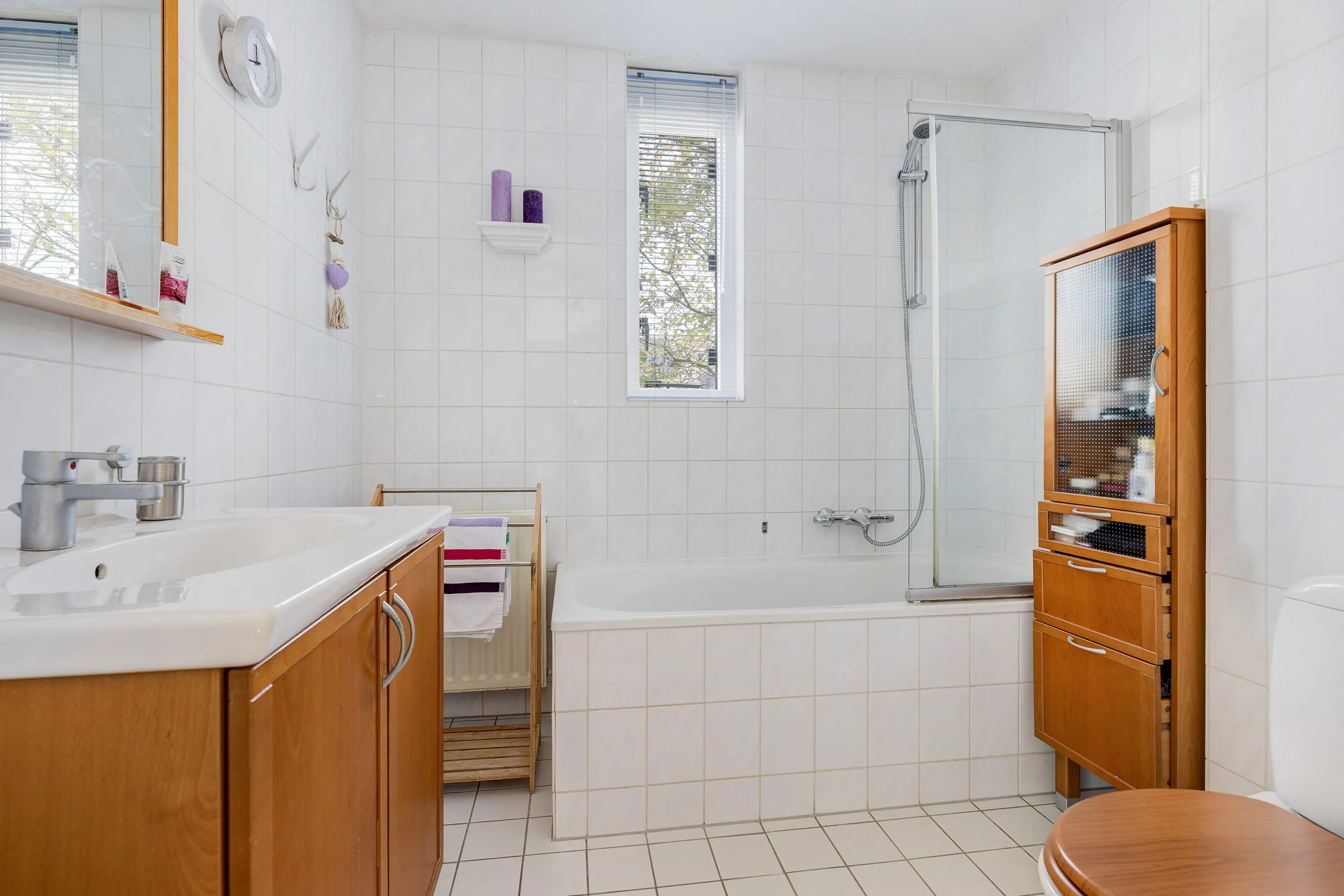 De badkamer is netjes en compleet uitgevoerd met een ligbad met glazen douchescherm, tweede toilet en wastafelmeubel. De lichte betegeling geeft het geheel een frisse uitstraling.