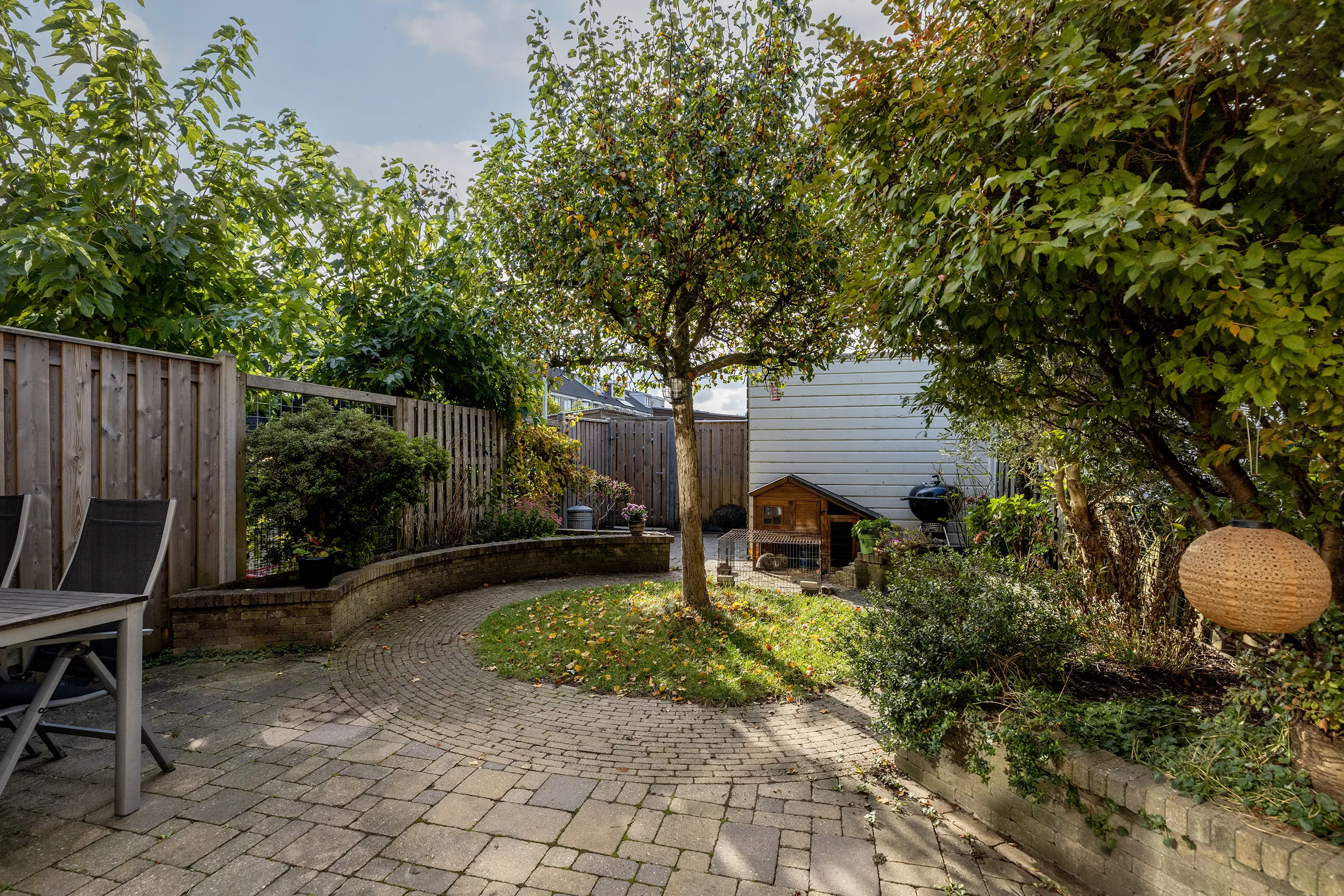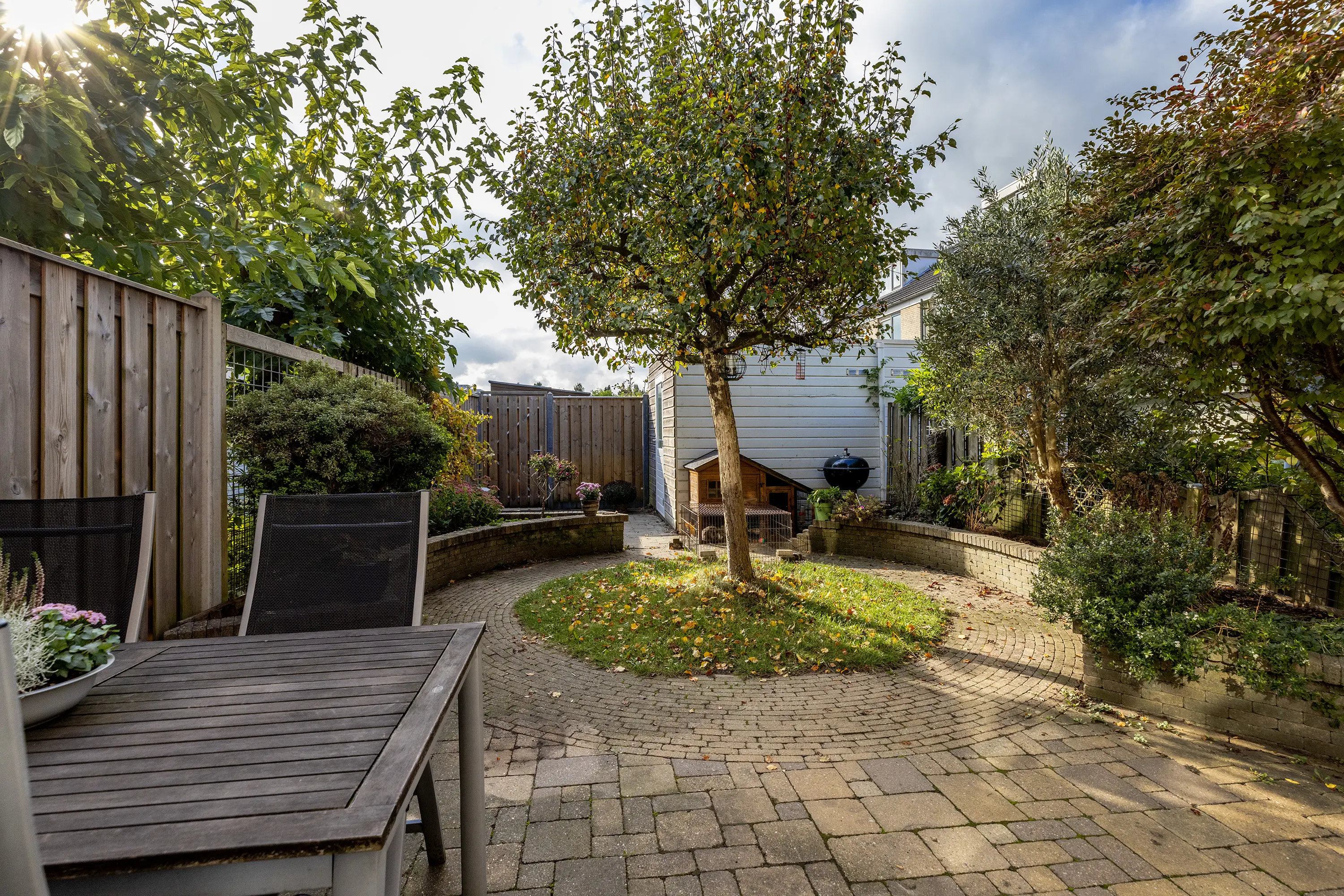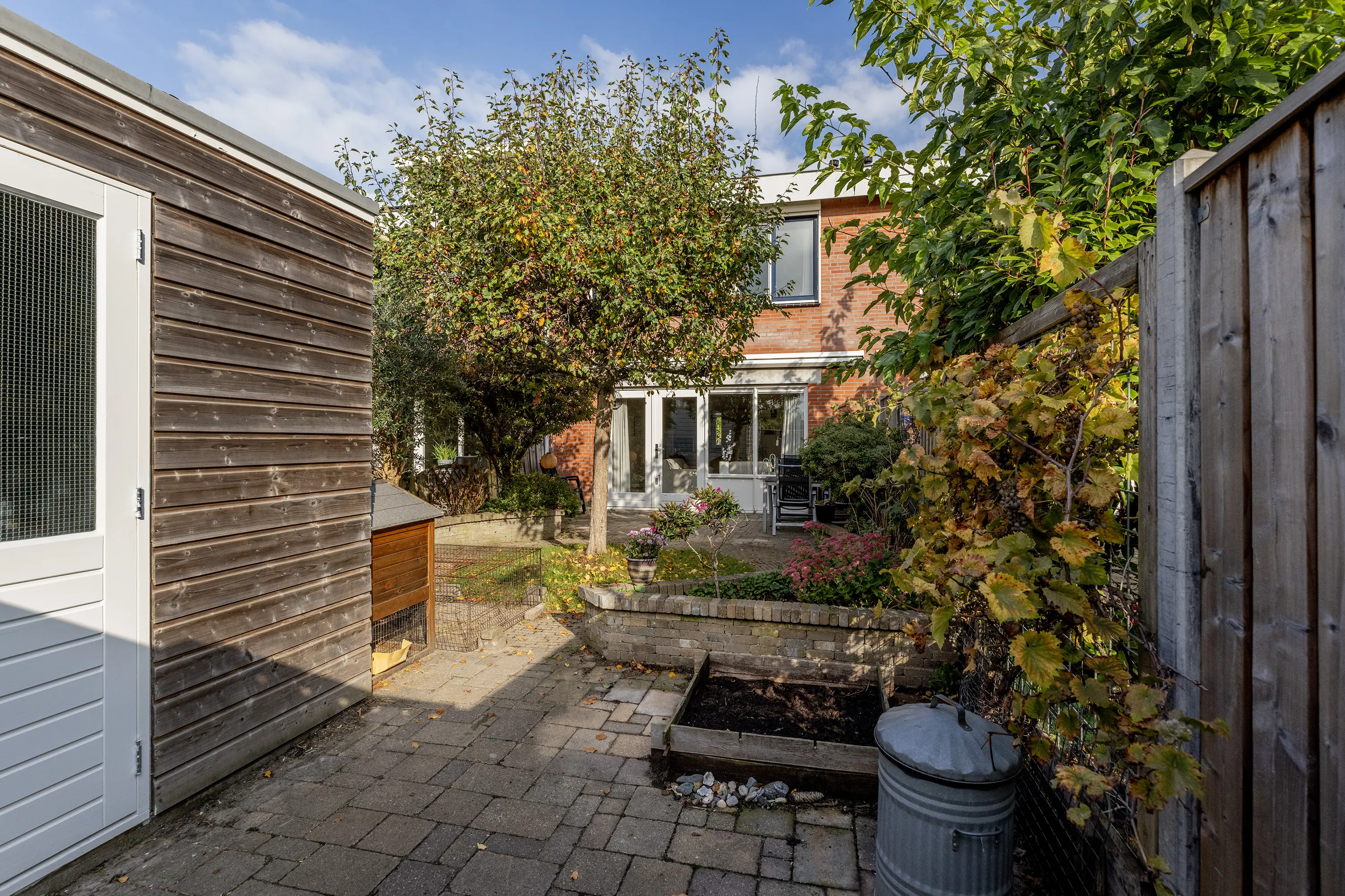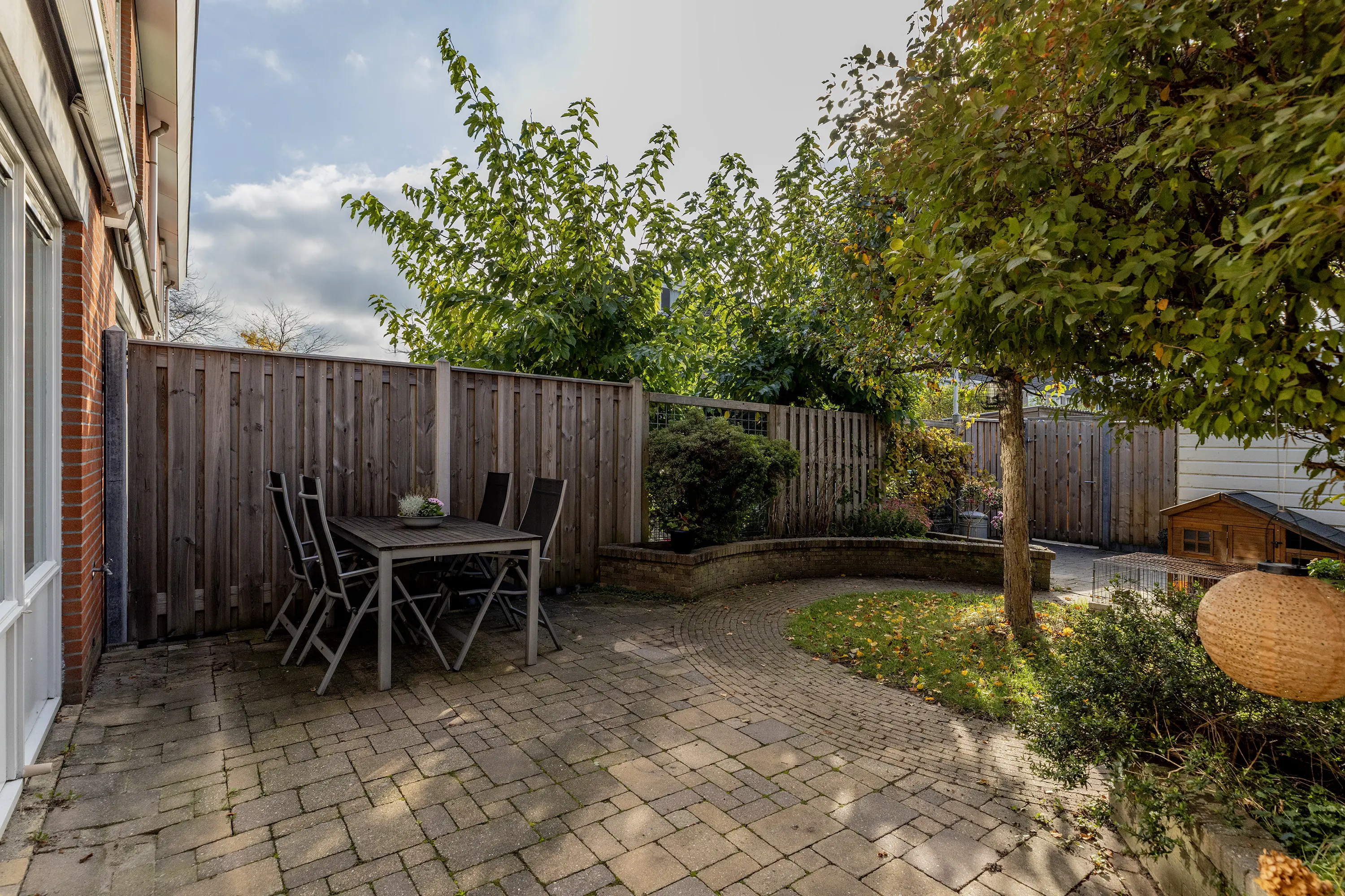 De achtertuin is verzorgd aangelegd met sierbestrating en beplanting, en ligt ideaal op het zuiden. Hier geniet je de hele dag van de zon! Achterin de tuin staat een houten berging en via de achterom is de tuin gemakkelijk bereikbaar. Een handmatig zonnescherm biedt desgewenst schaduw tijdens warme dagen.