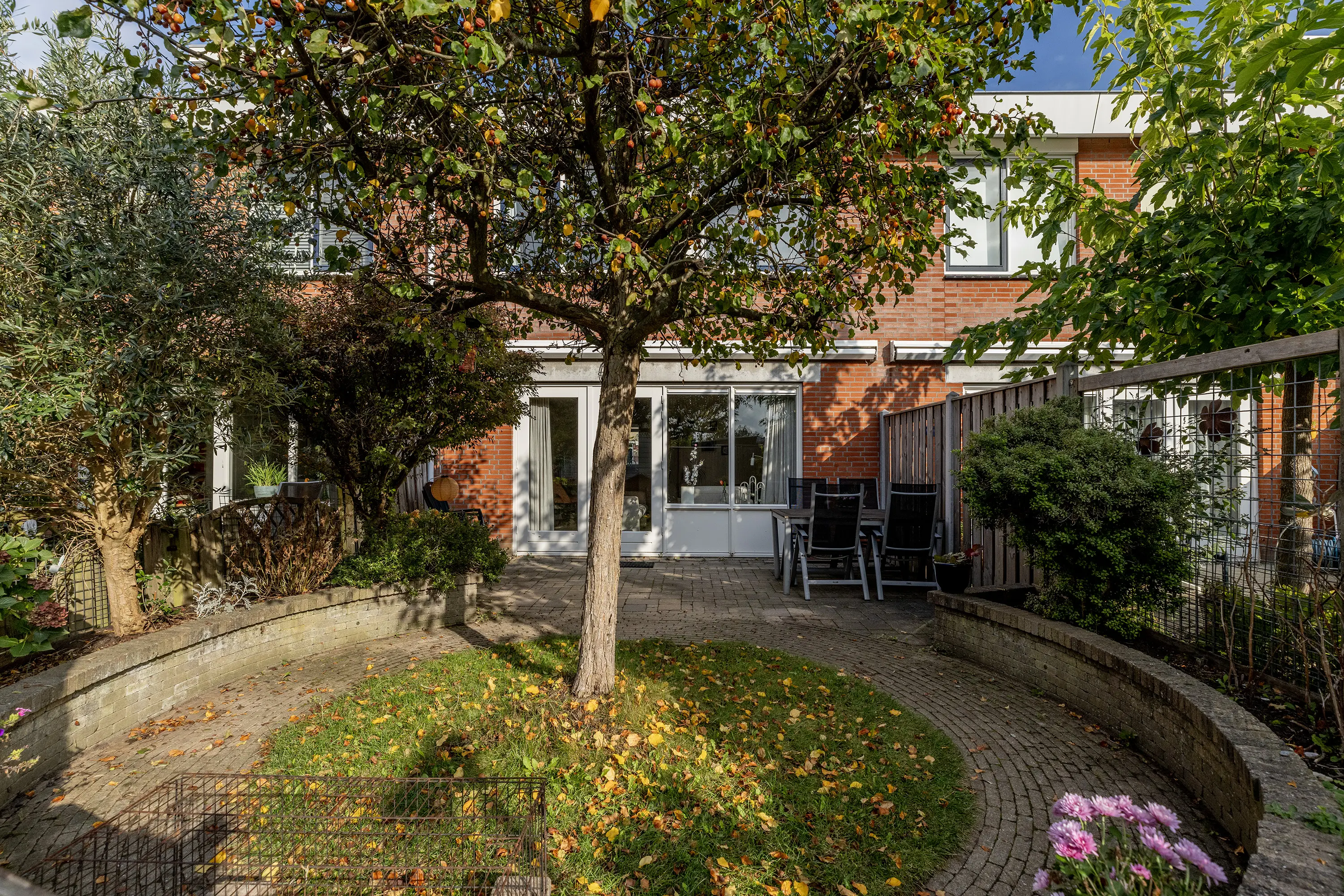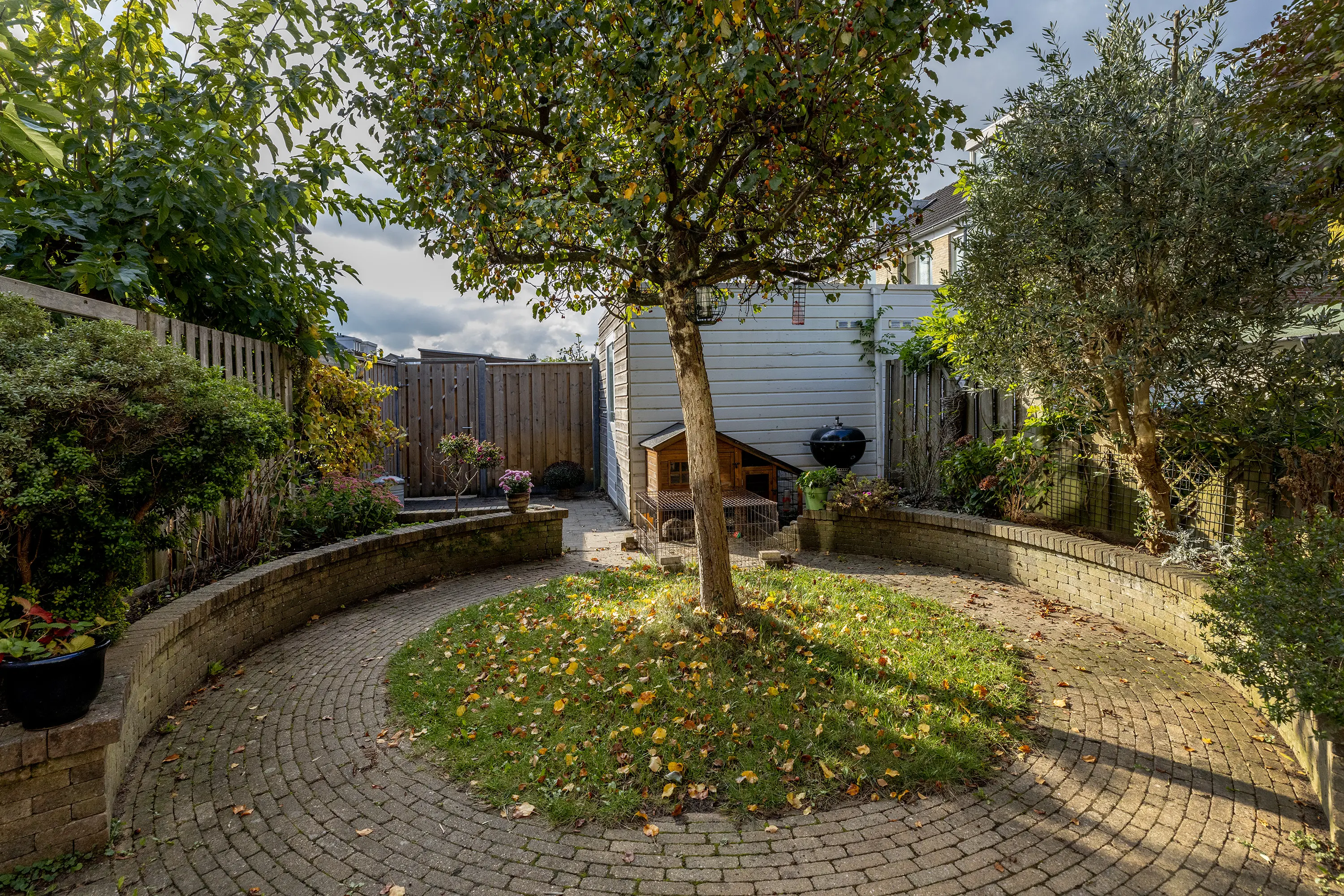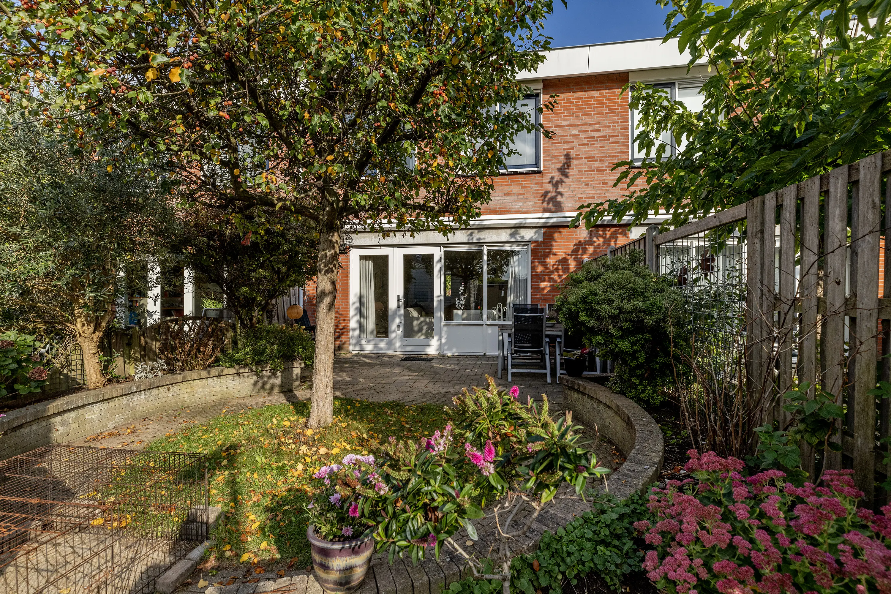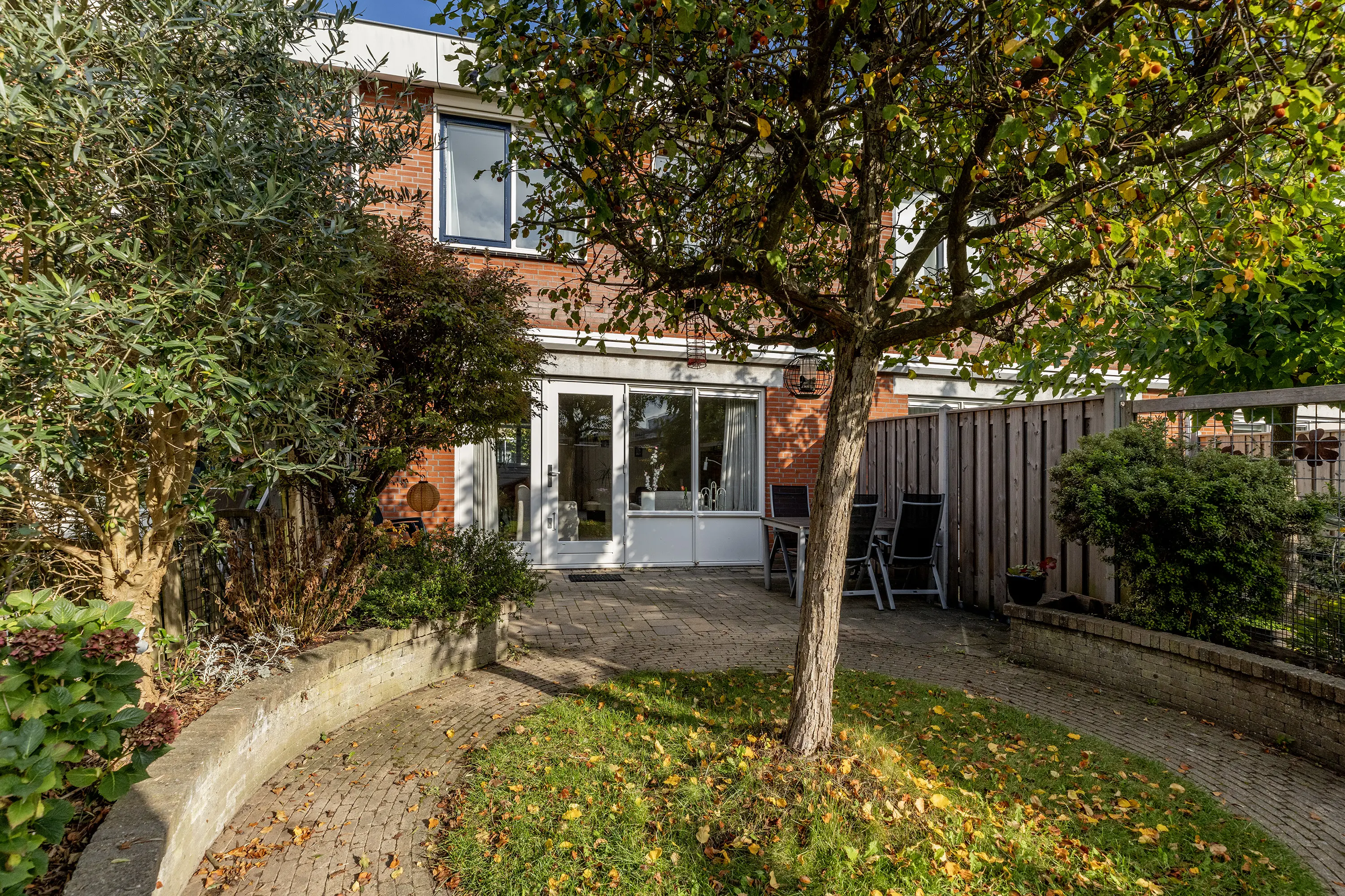 De achtertuin is verzorgd aangelegd met sierbestrating en beplanting, en ligt ideaal op het zuiden. Hier geniet je de hele dag van de zon! Achterin de tuin staat een houten berging en via de achterom is de tuin gemakkelijk bereikbaar. Een handmatig zonnescherm biedt desgewenst schaduw tijdens warme dagen.