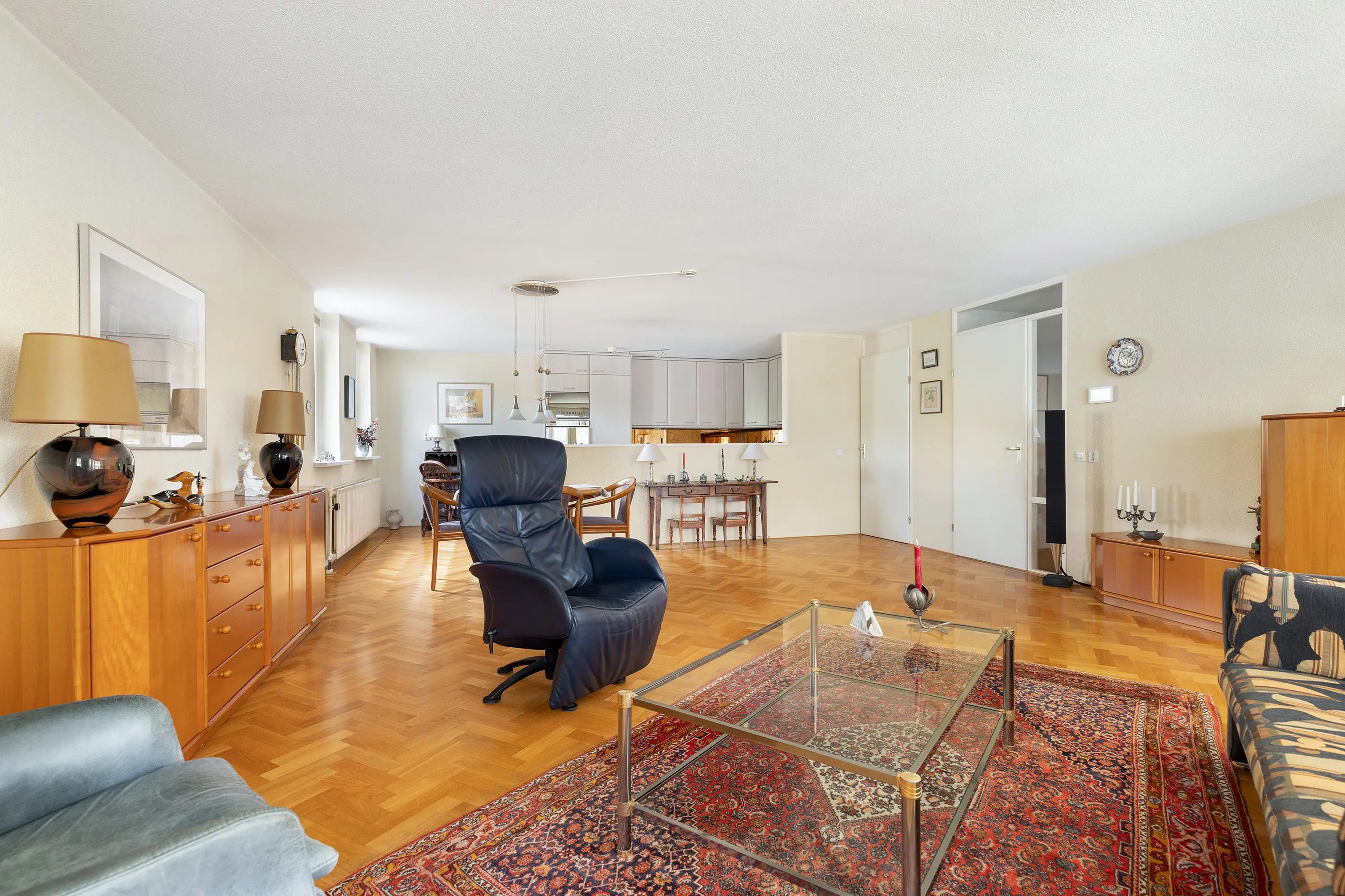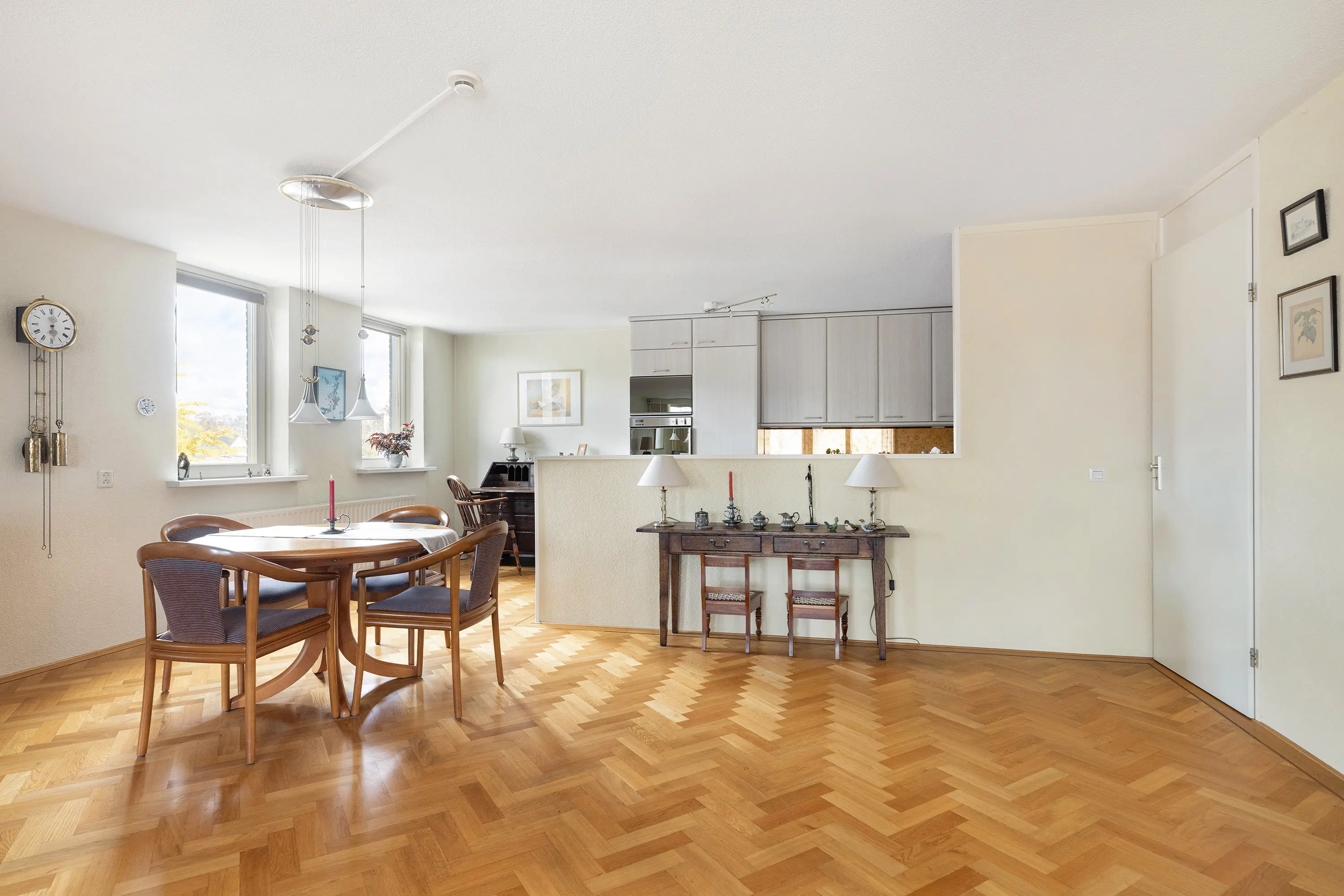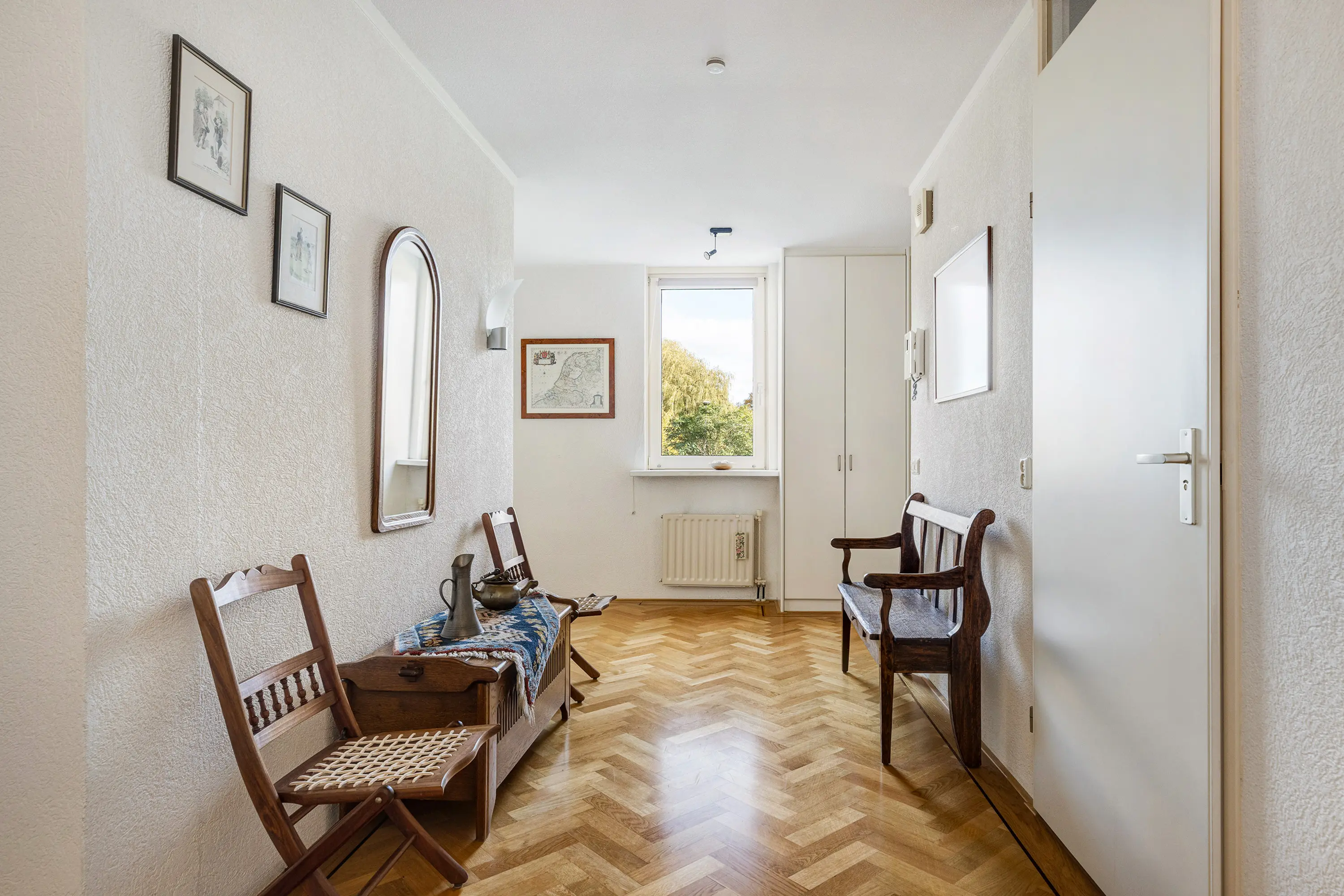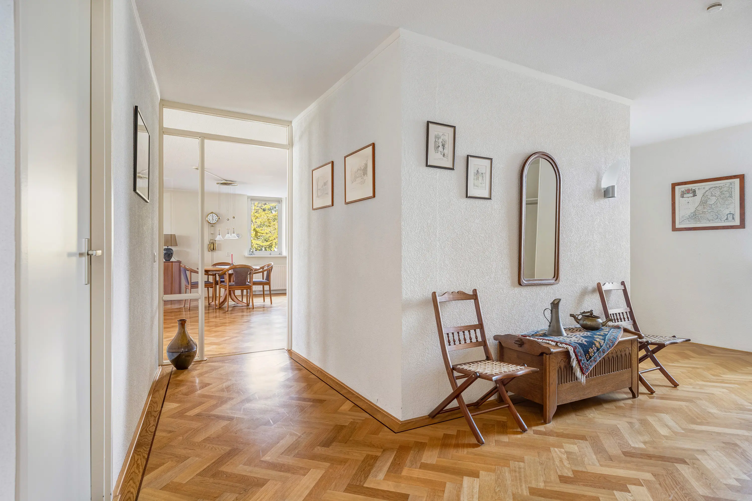 Vrijwel het gehele appartement is afgewerkt met een prachtige visgraat parketvloer met wengé bies, wat het geheel een luxe en warme uitstraling geeft.