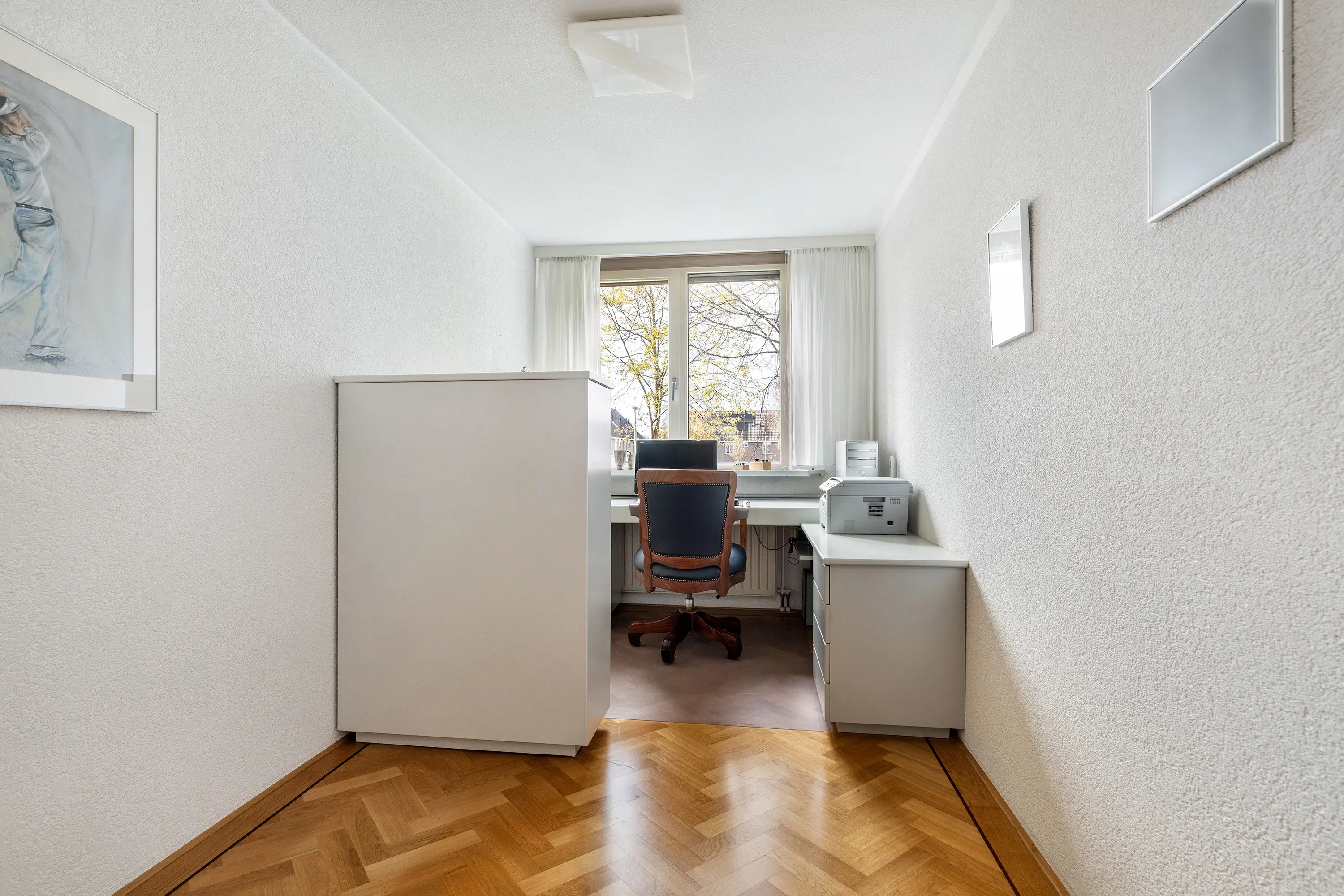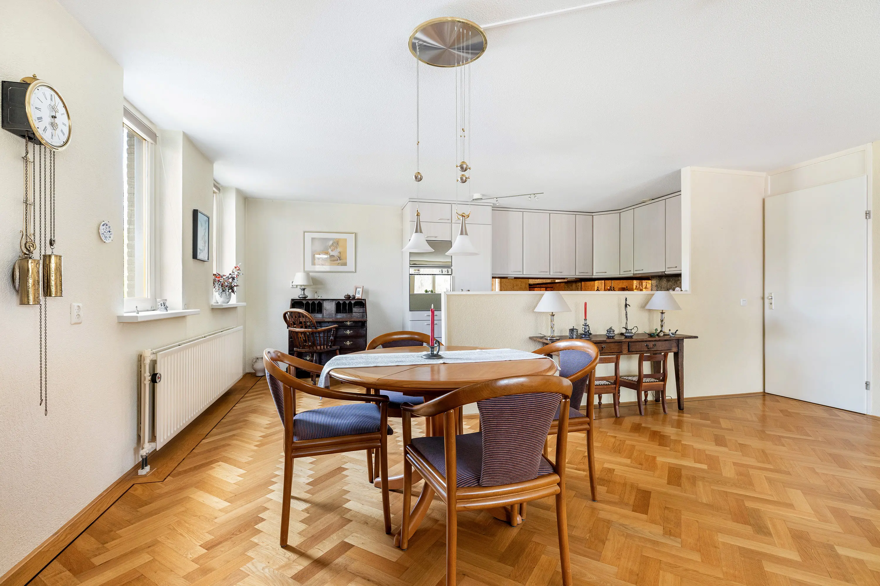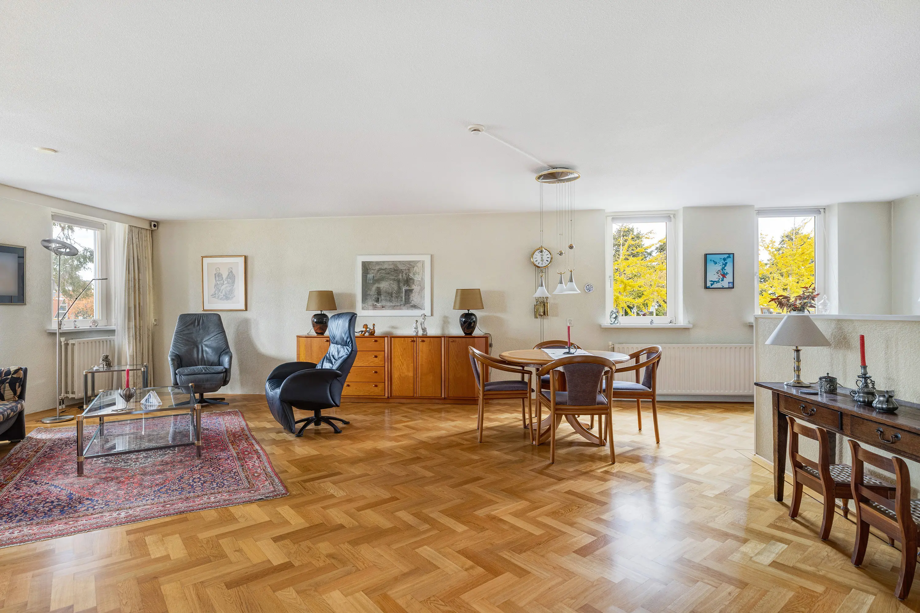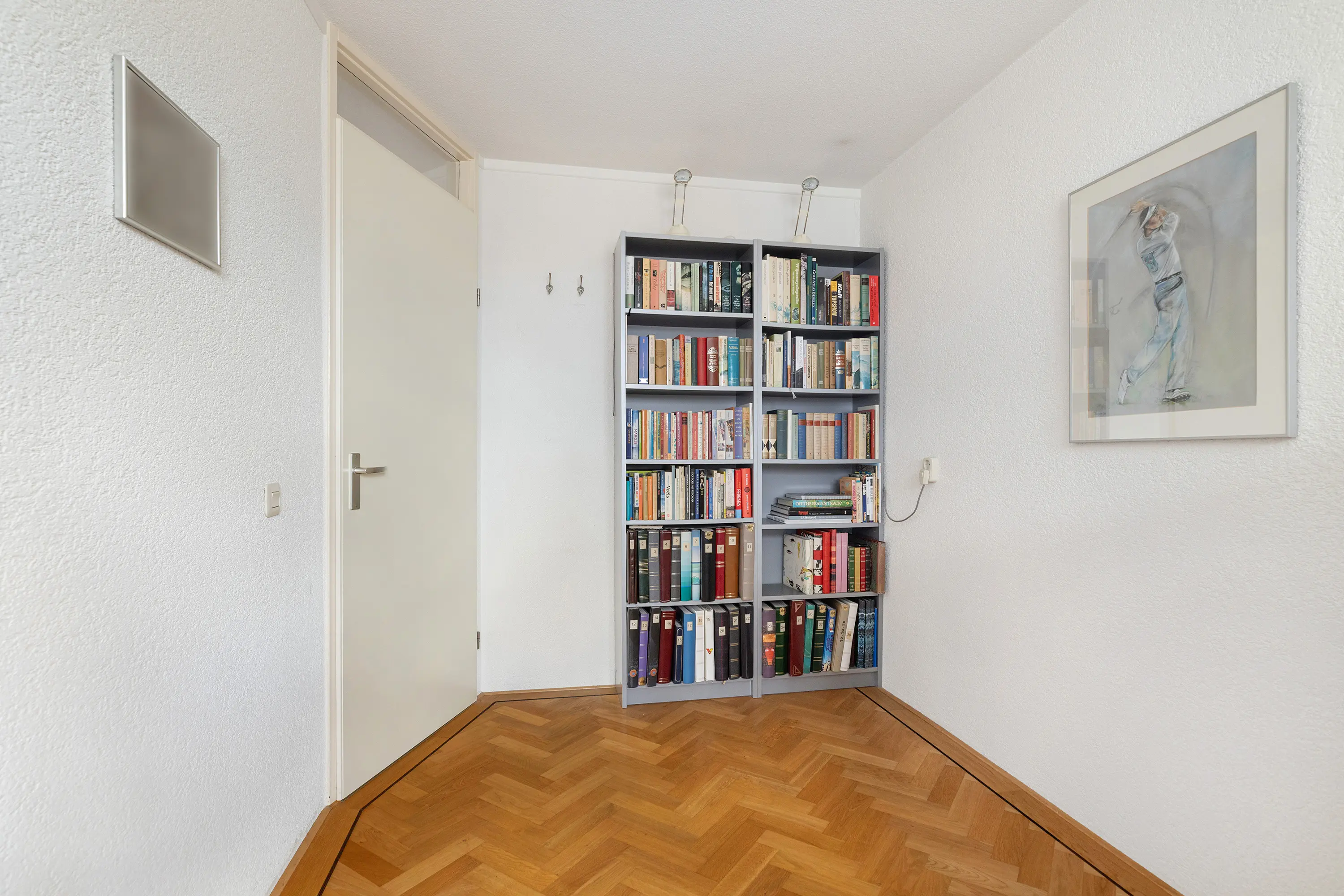 Vrijwel het gehele appartement is afgewerkt met een prachtige visgraat parketvloer met wengé bies, wat het geheel een luxe en warme uitstraling geeft.