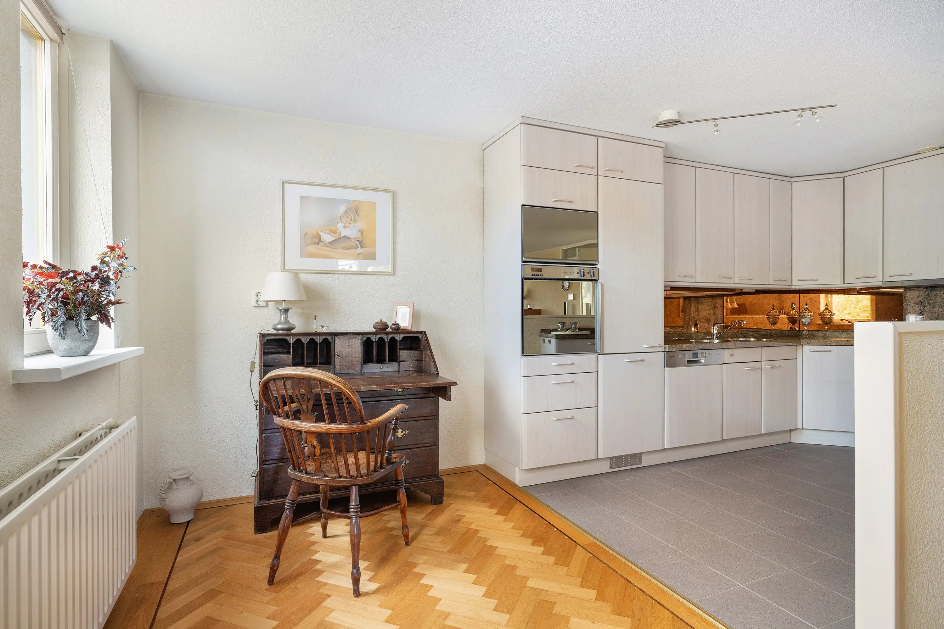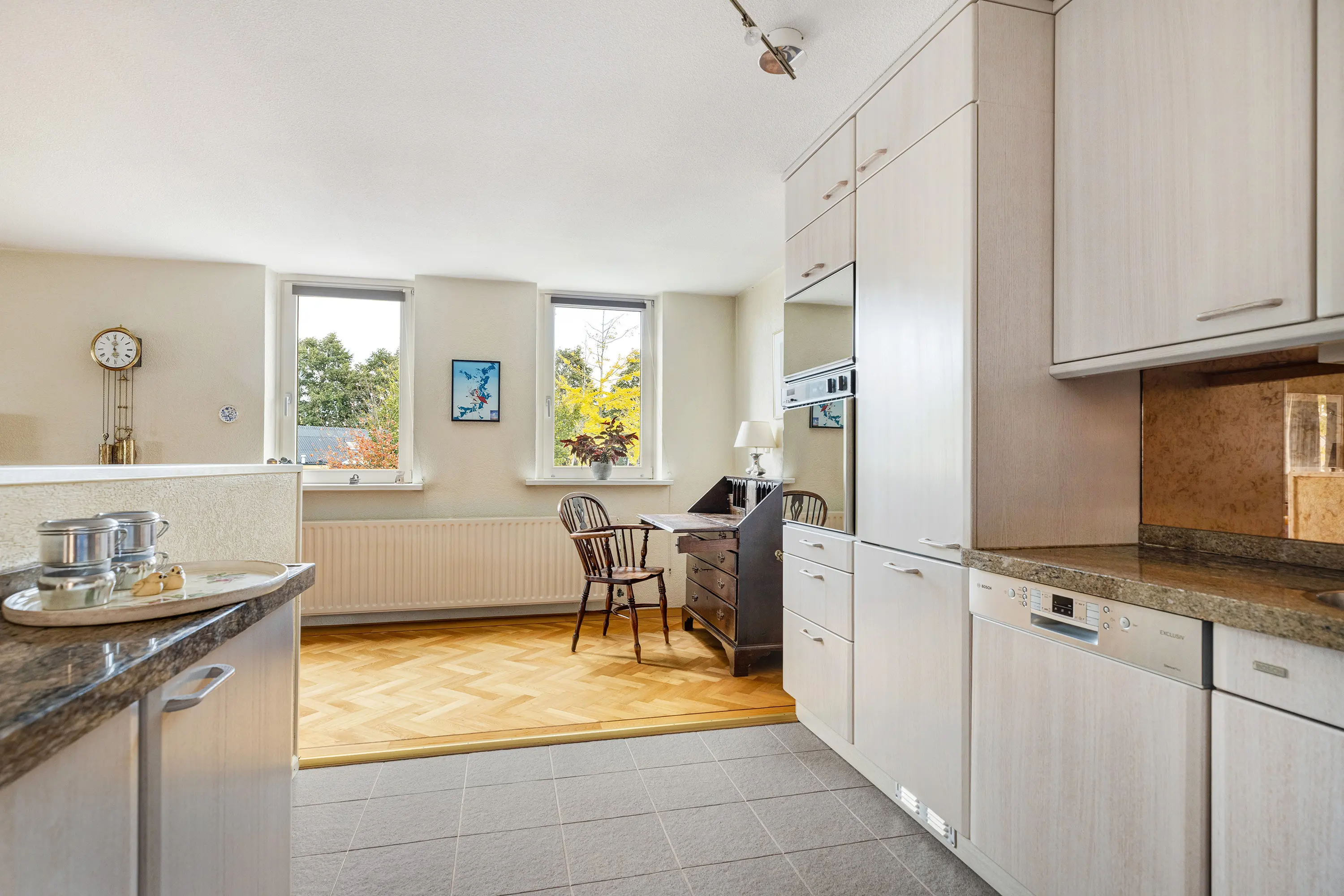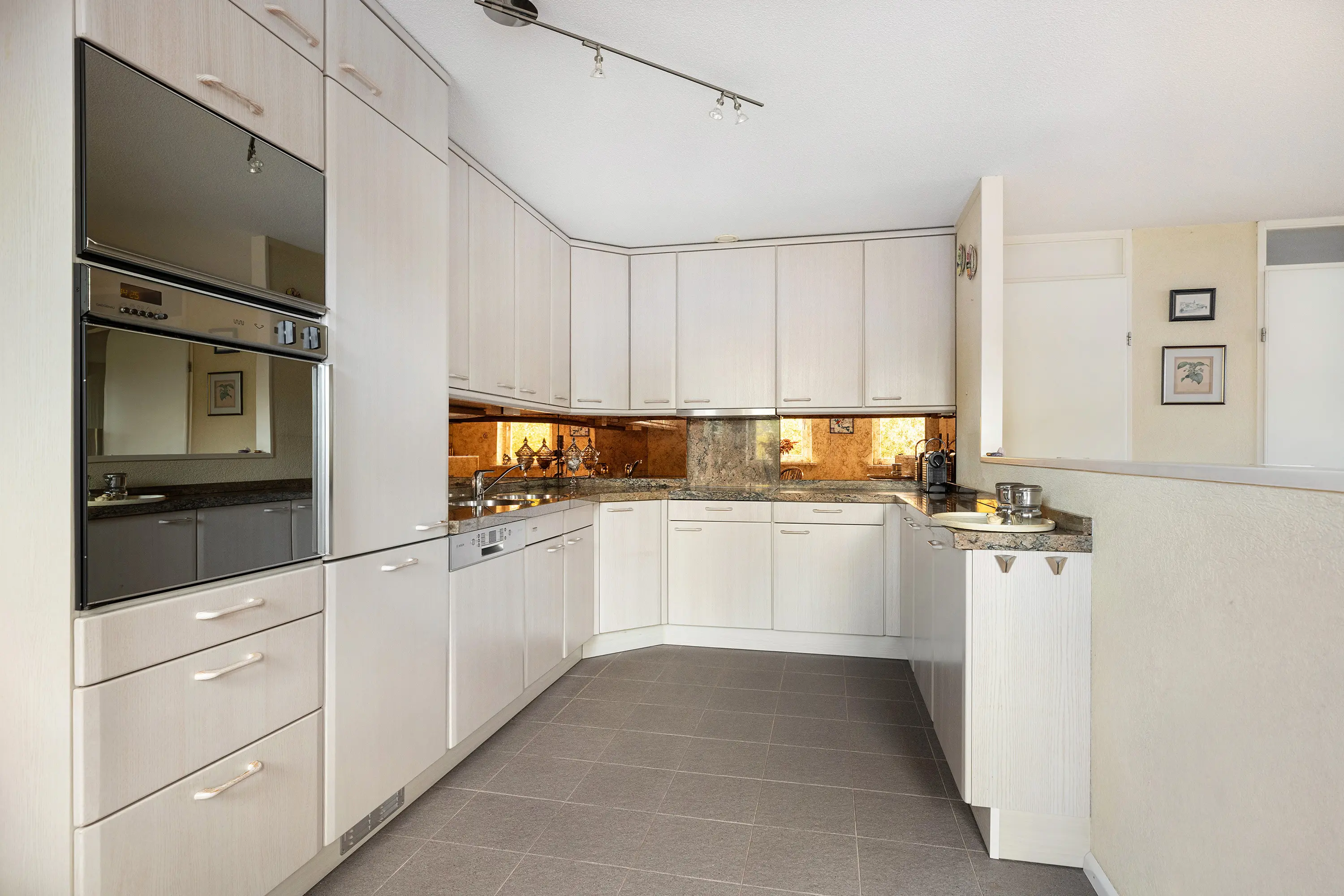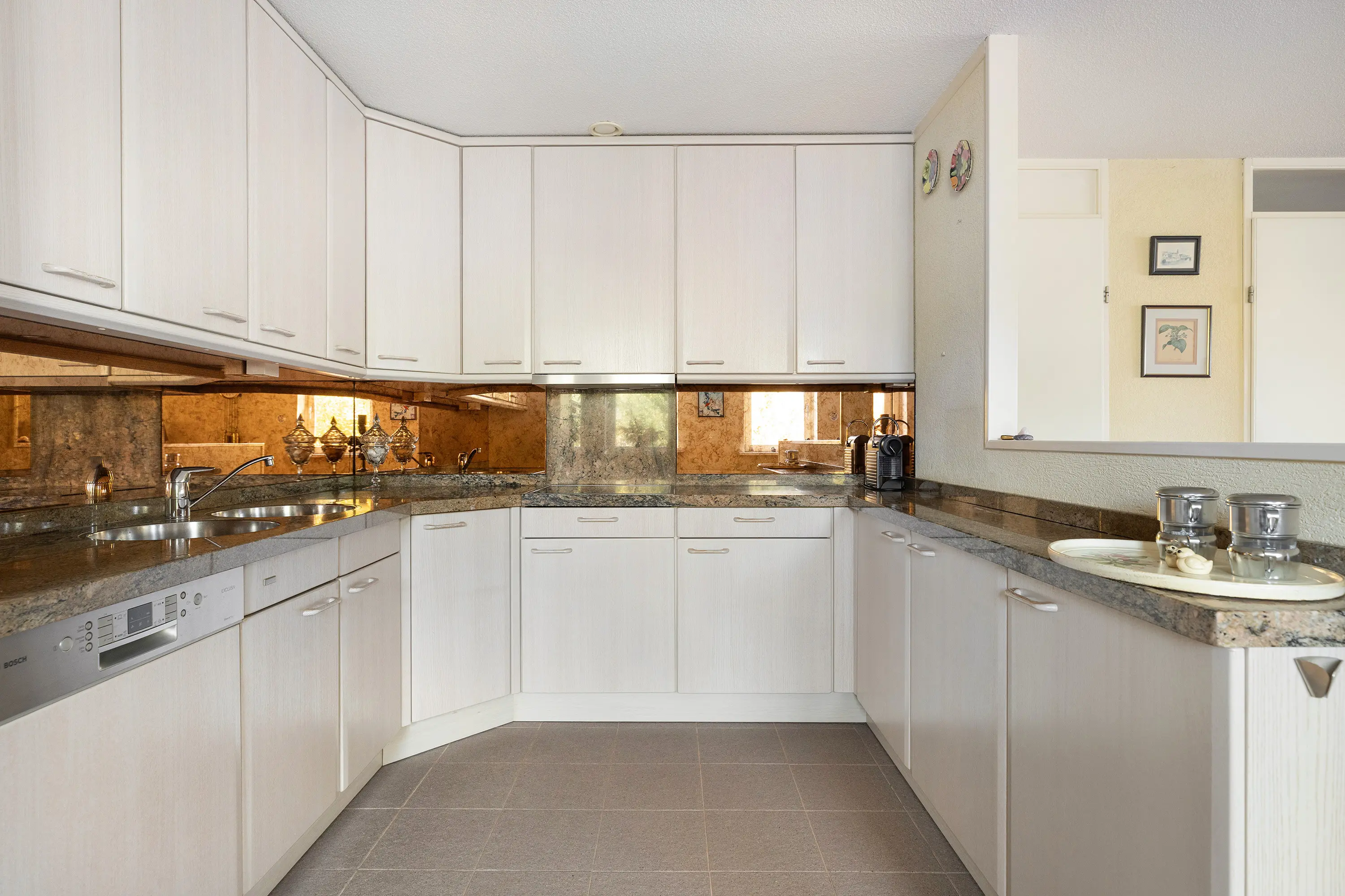 De open keuken heeft een moderne U-opstelling en is halfopen door een laag muurtje dat zorgt voor een prettige verbinding tussen koken en wonen. De keuken is compleet uitgevoerd met hoogwaardige inbouwapparatuur zoals een oven en magnetron van Gaggenau, een 4-pits keramische kookplaat met vlakschermafzuigkap, een vaatwasser, koelkast en vrieskast. De vloer is afgewerkt met stijlvolle plavuizen.