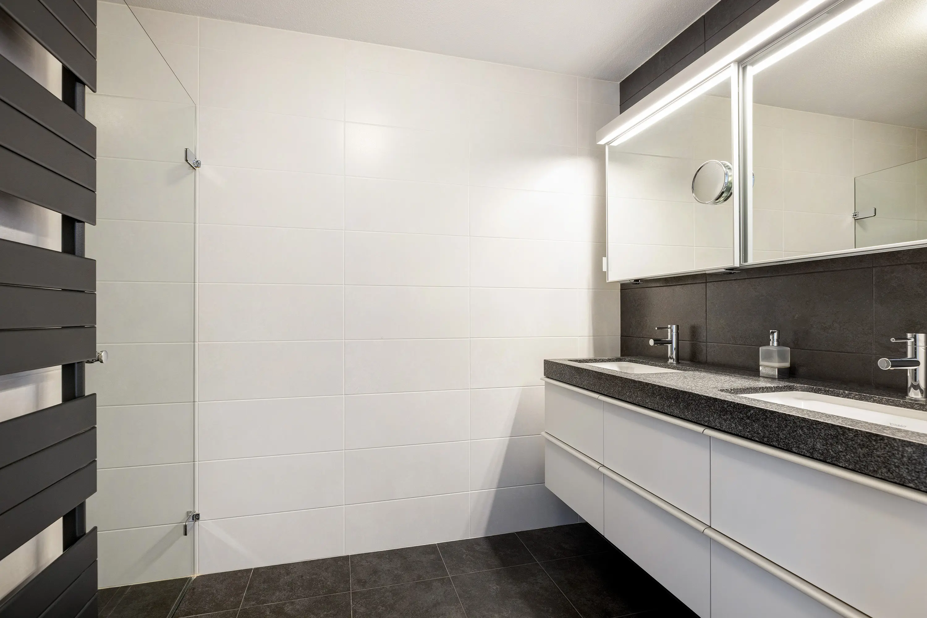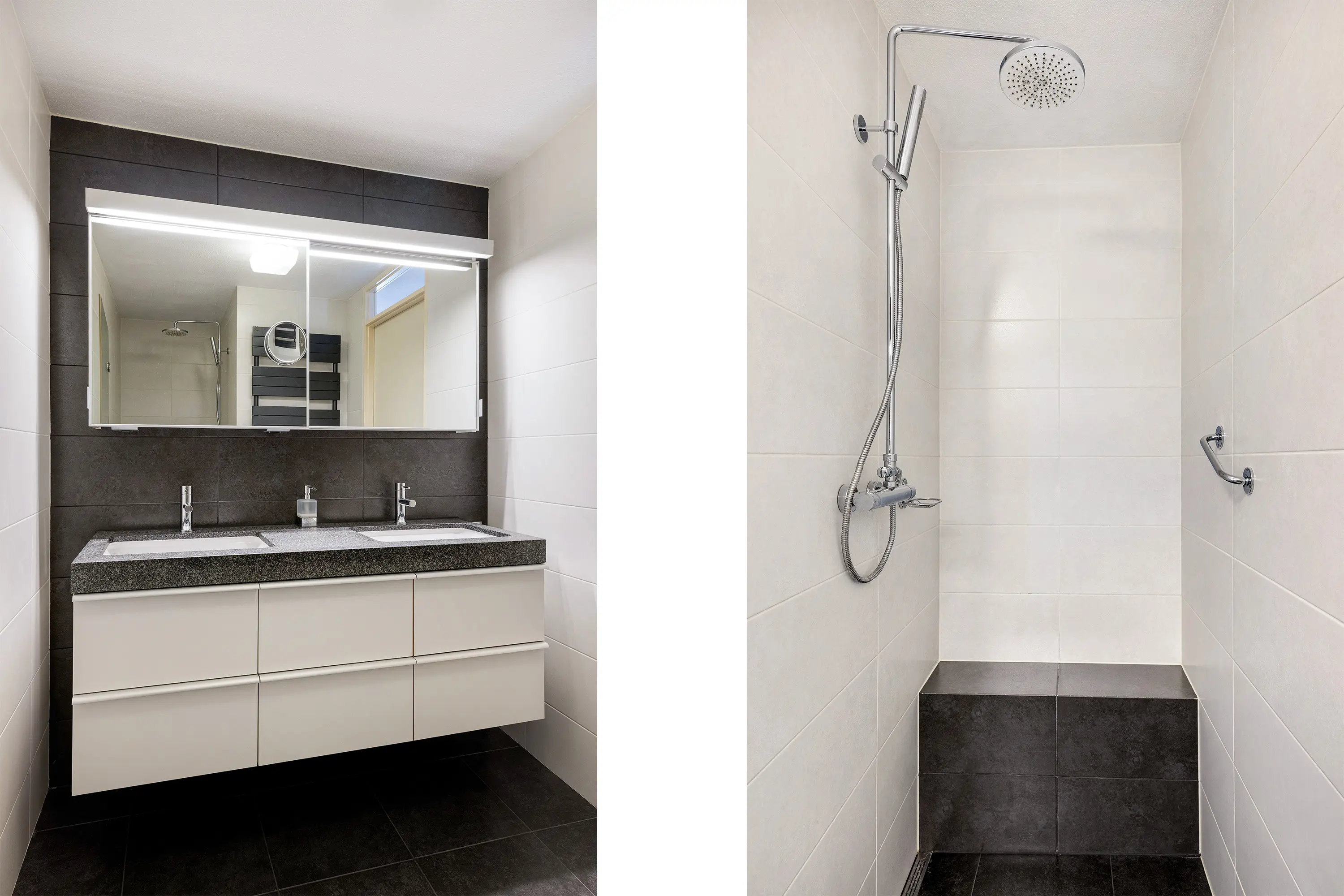 De badkamer is geheel betegeld in een lichte kleurstelling en beschikt over een inloopdouche met regendouche, een dubbel wastafelmeubel met veel bergruimte, een verlichte spiegelkast en een designradiator in matzwart.