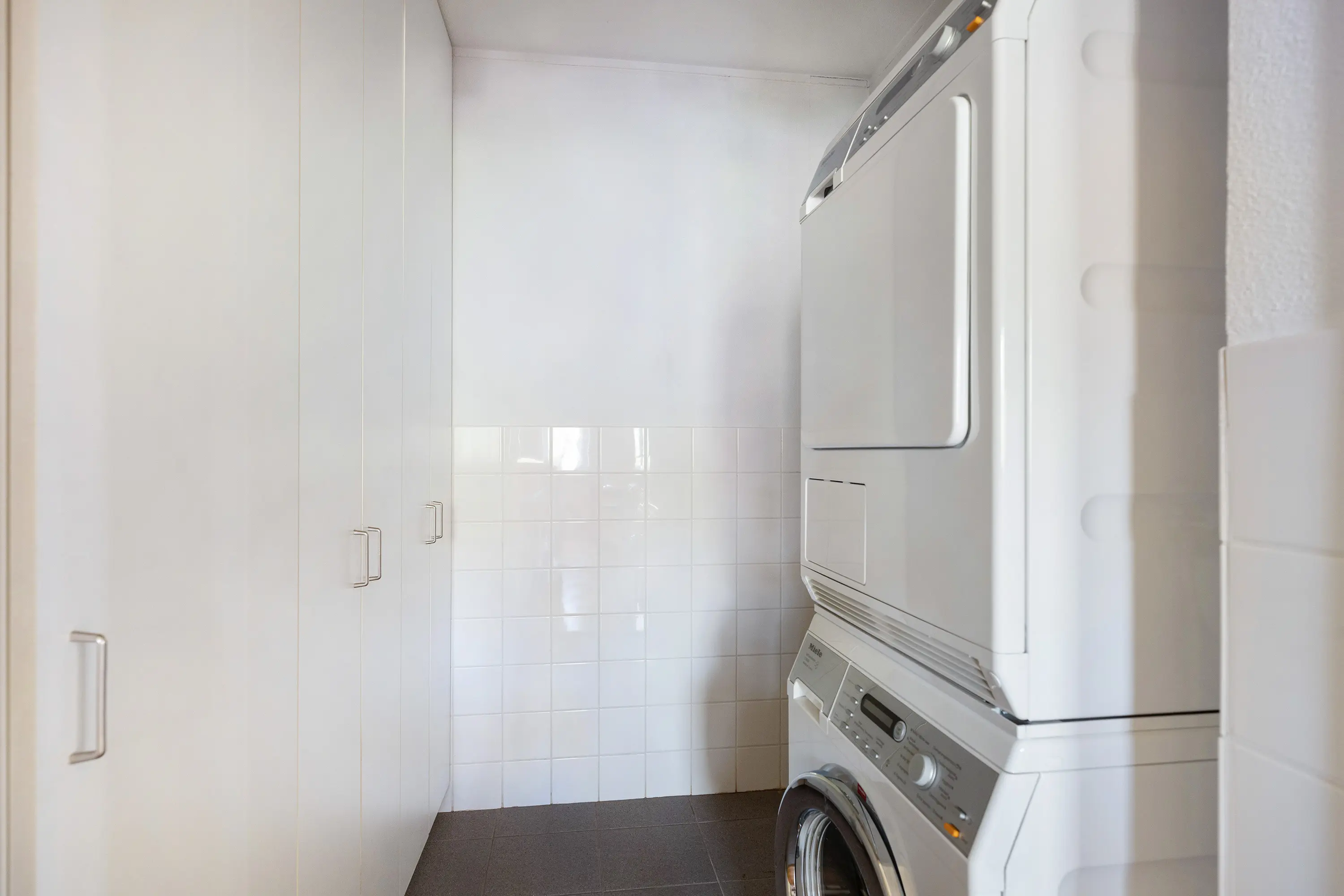 Vanuit de woonkamer heeft u toegang tot de bijkeuken, met de aansluitingen voor de wasmachine en droger – praktisch en netjes uit het zicht.
