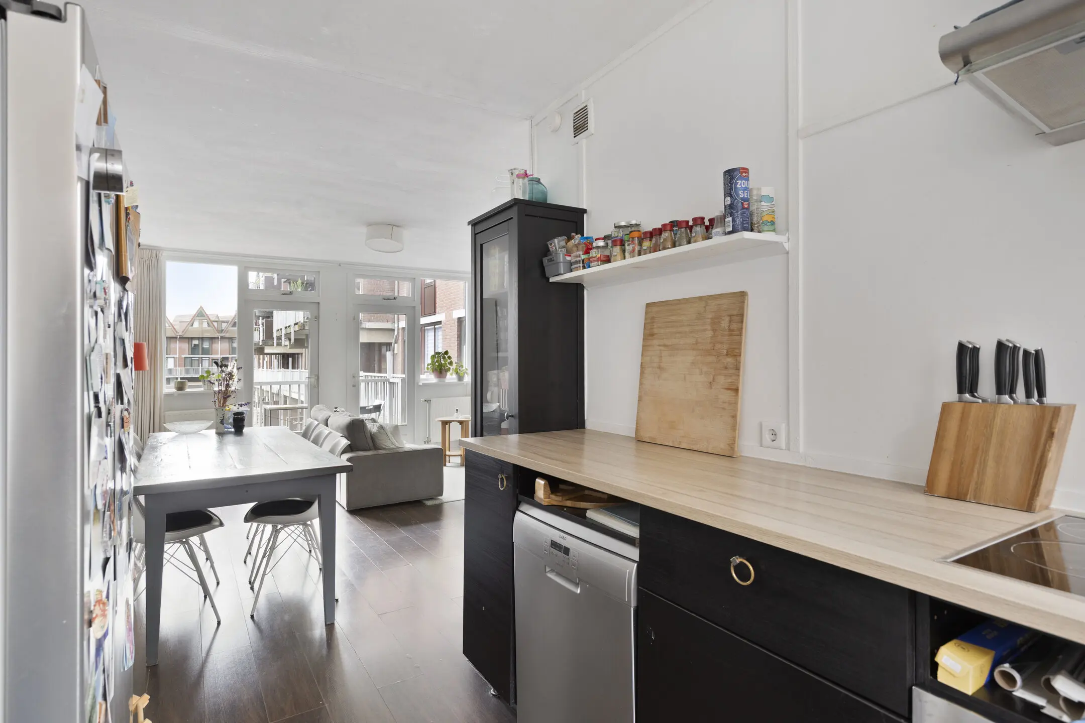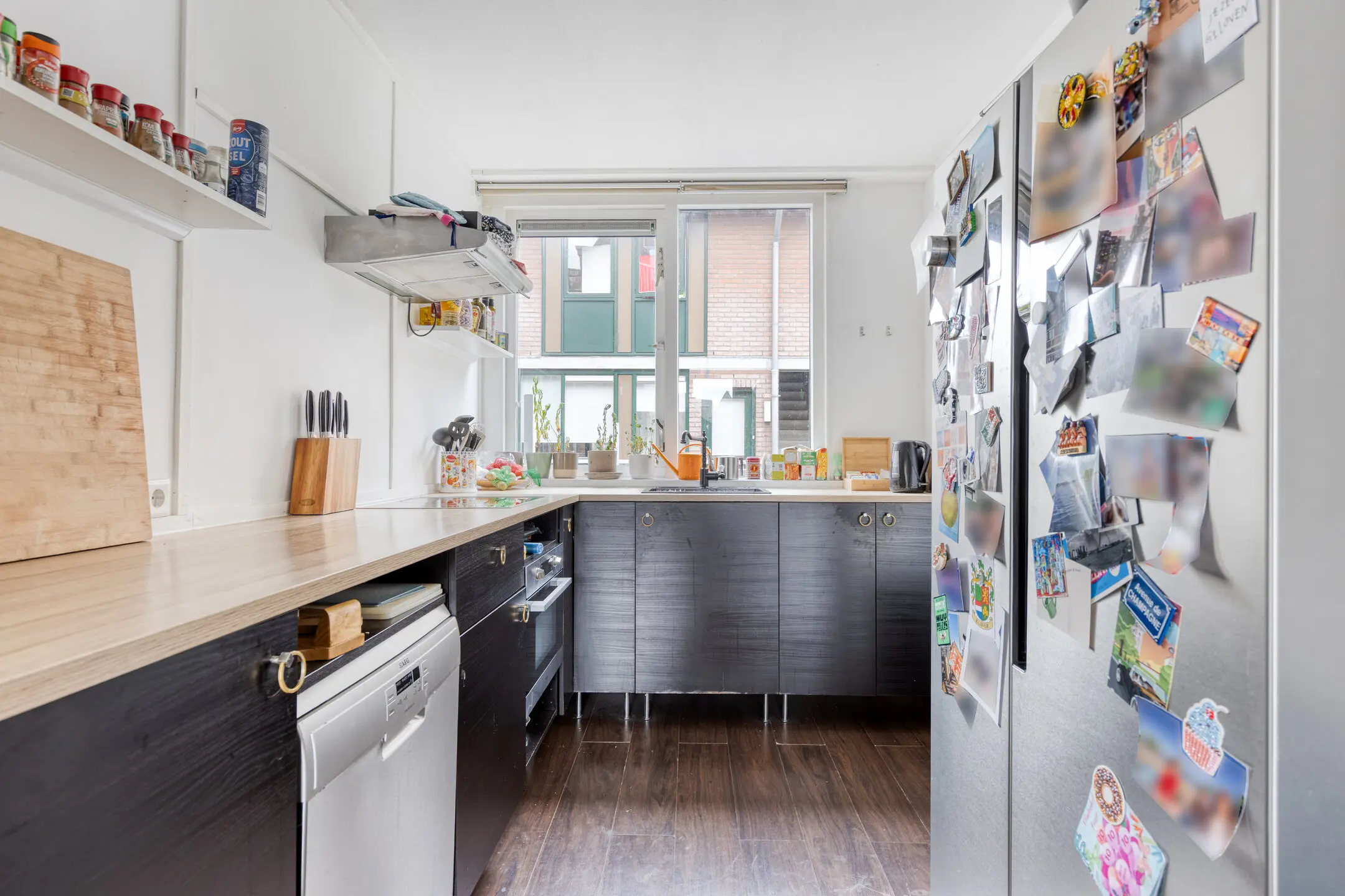 De open keuken ligt aan de voorzijde en is extra licht door het grote raam. Het is een nette keuken zonder bovenkastjes, wat zorgt voor een ruimtelijk effect. Er is een spoelbak met mengkraan, ingebouwde oven en een groot werkblad met inductiekookplaat en afzuigkap. Het aanrecht biedt volop werkruimte en in de keukenkastjes berg je alles netjes op. De koelkast en vaatwasmachine hebben een losse plek gekregen.