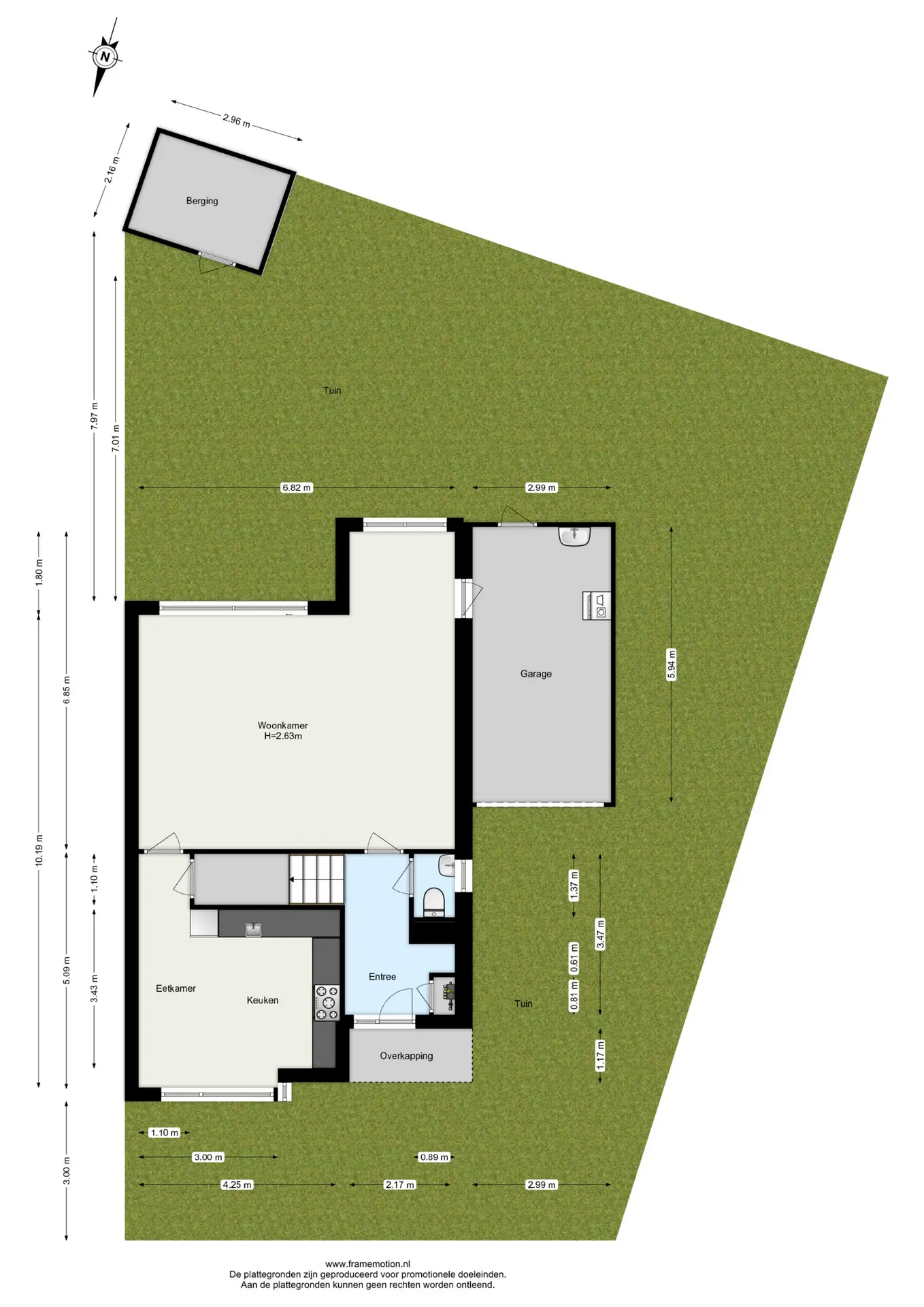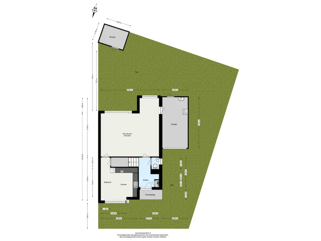 De garage is uitgerust met een elektrische garagedeur, wasmachine- en drogeraansluiting, en herbergt de omvormer van de 11 zonnepanelen.