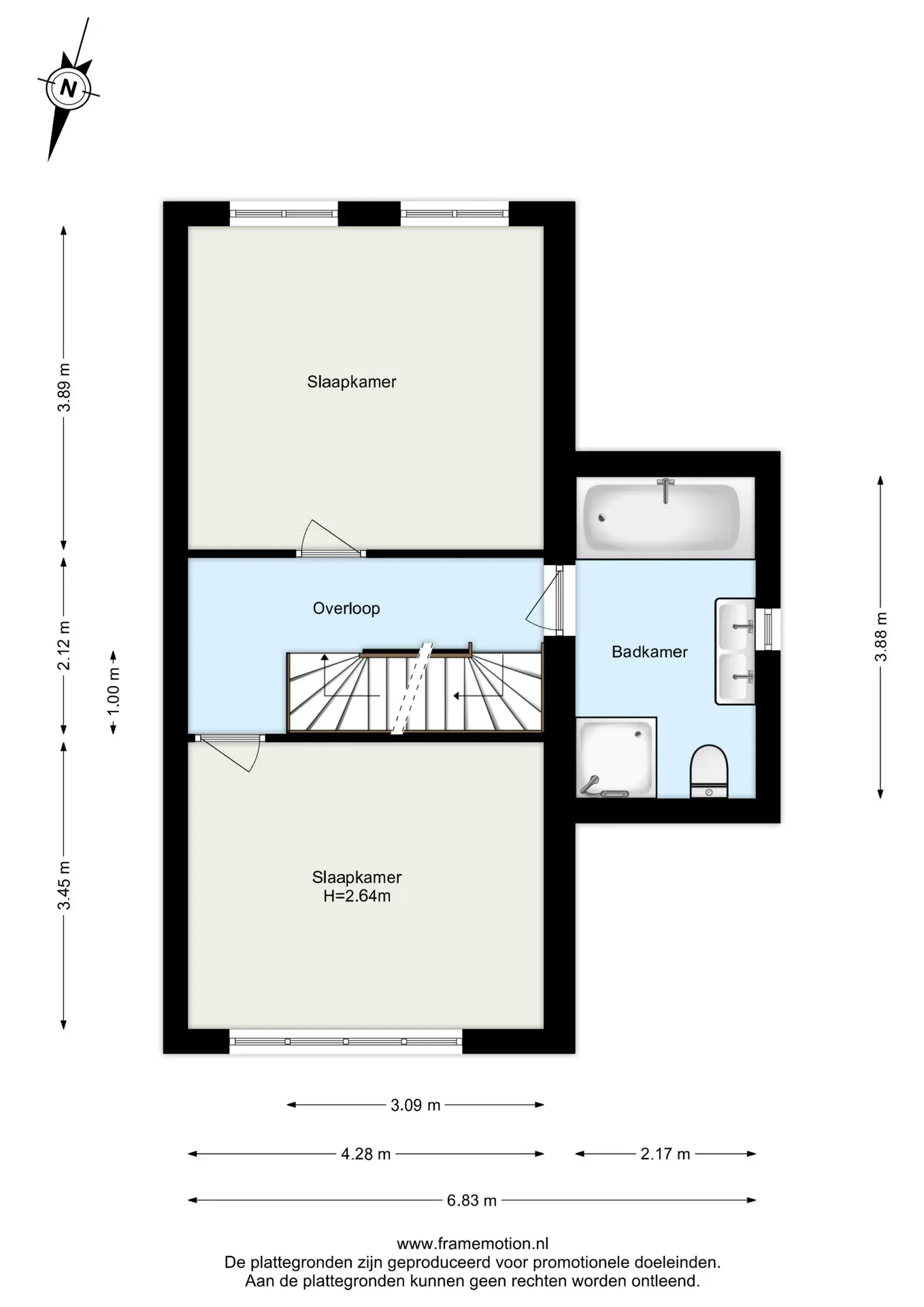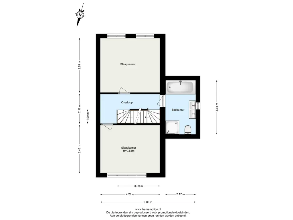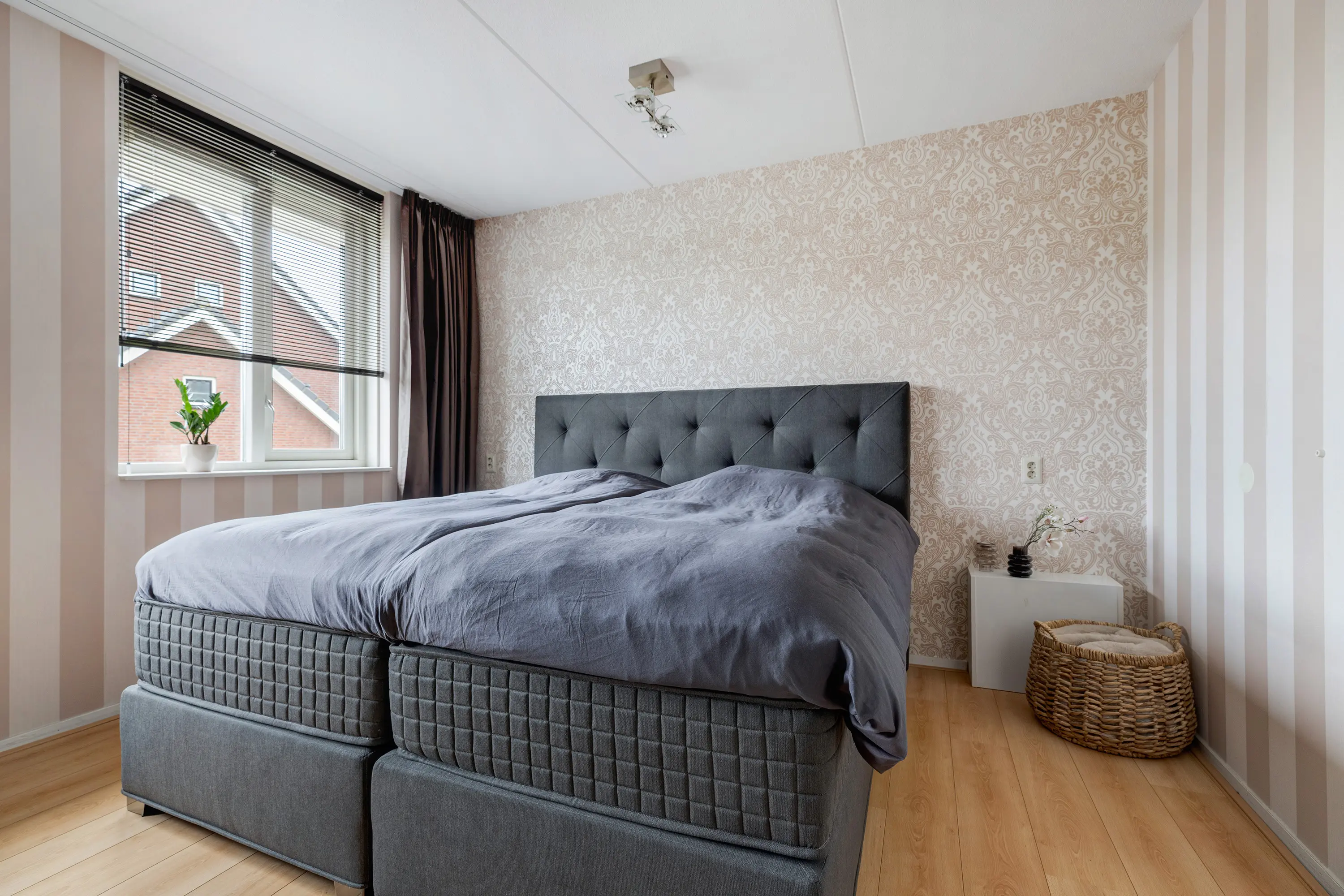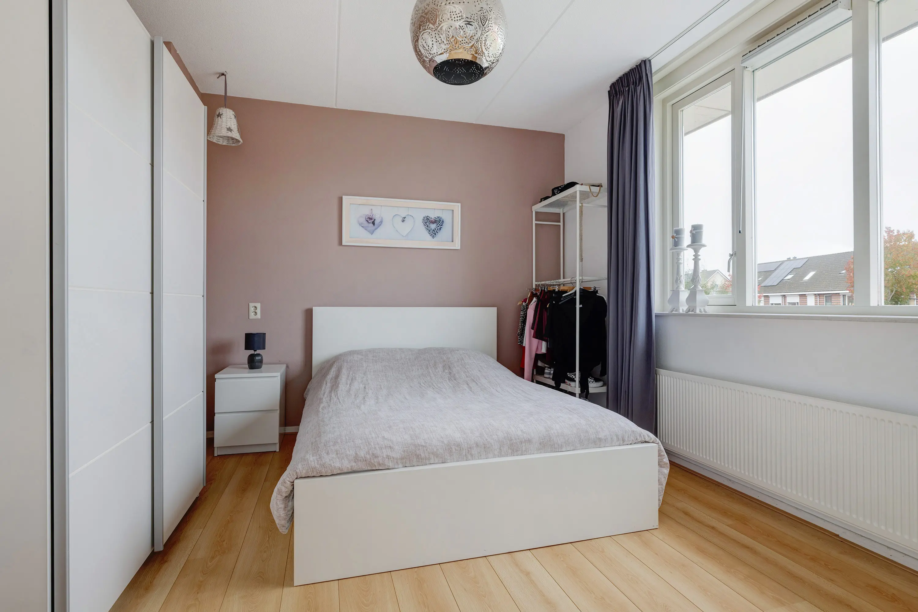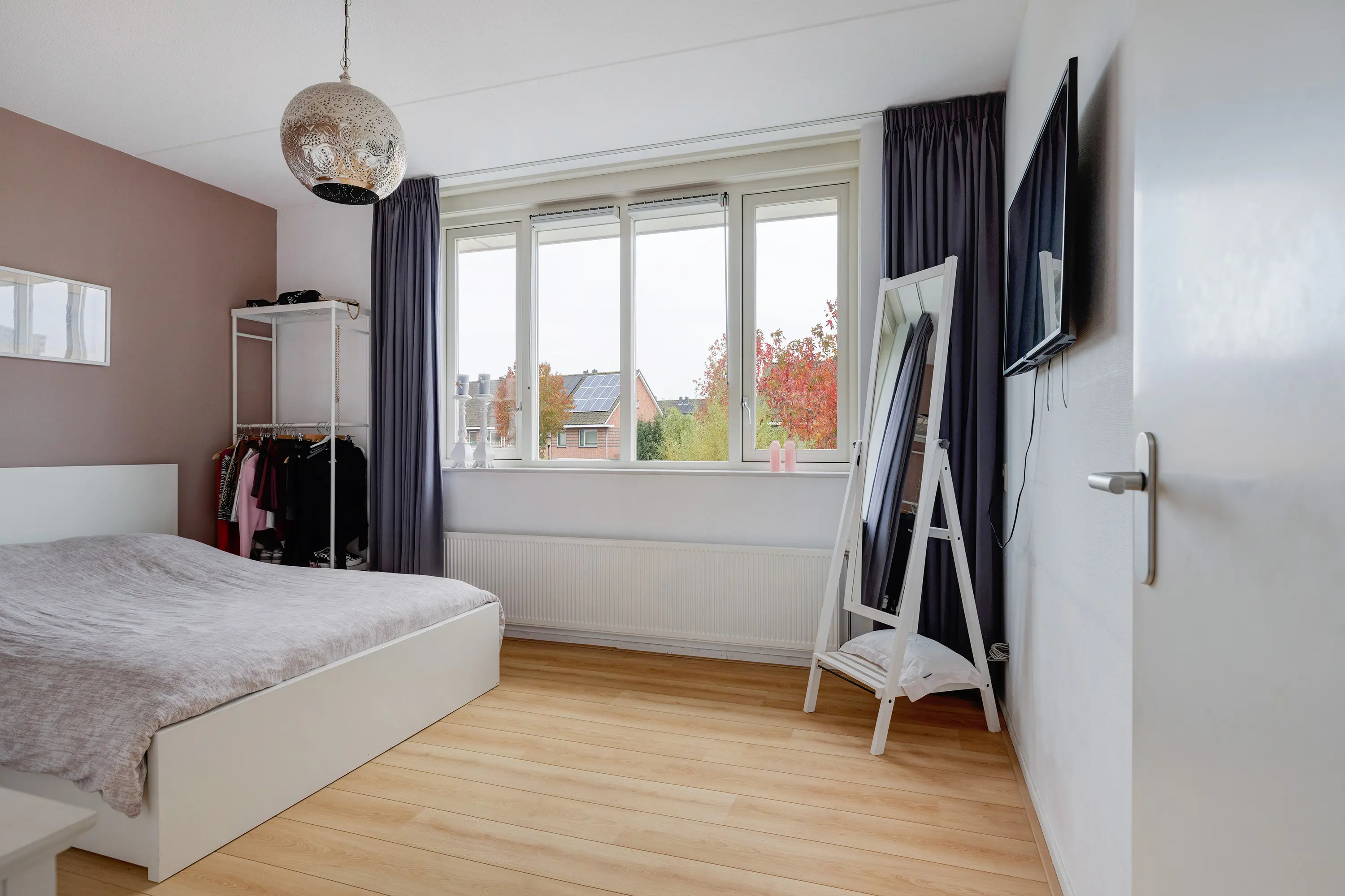Slaapkamer 2 ligt aan de voorzijde en heeft, net als de kamer aan de achterzijde, een laminaatvloer en behangwanden.