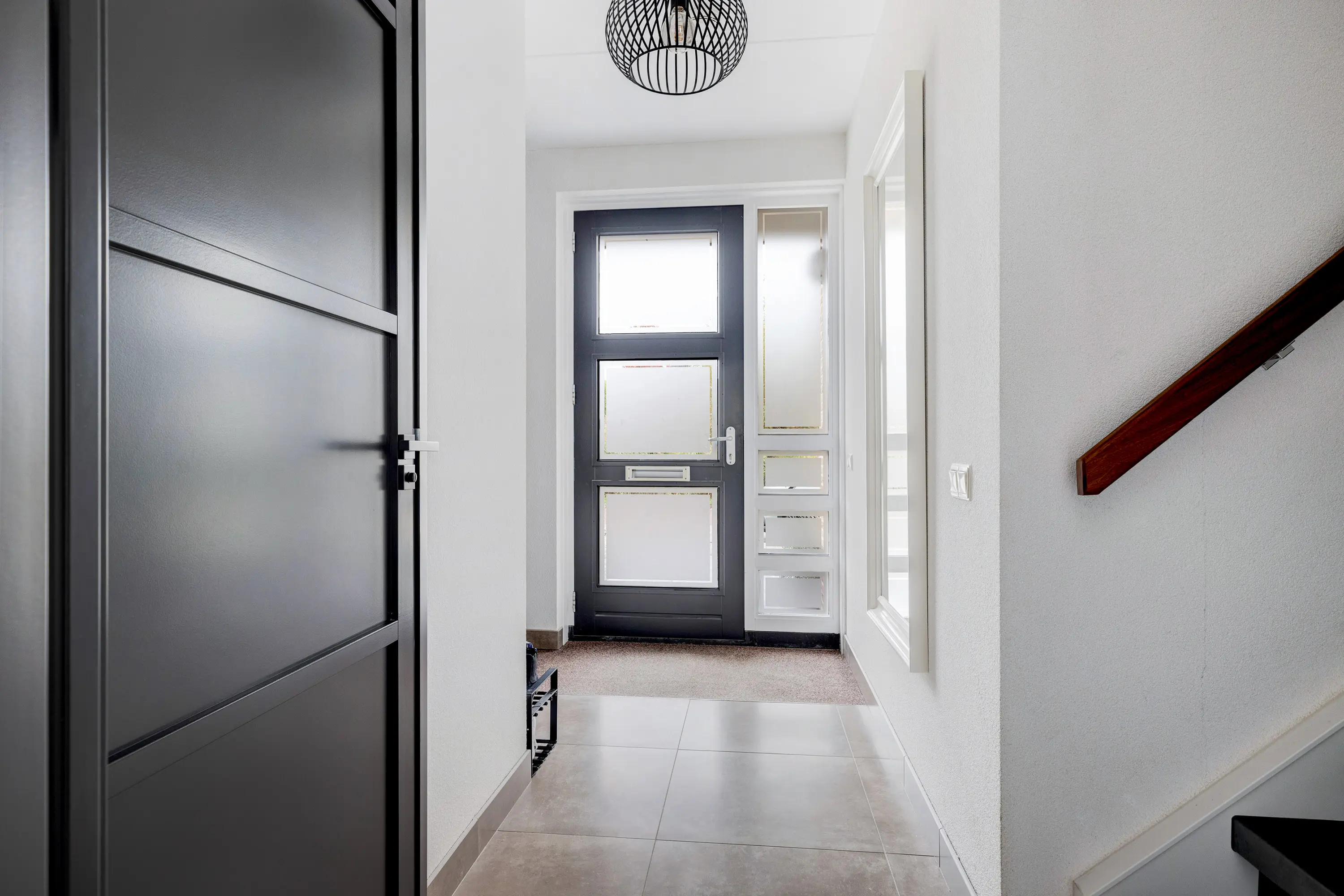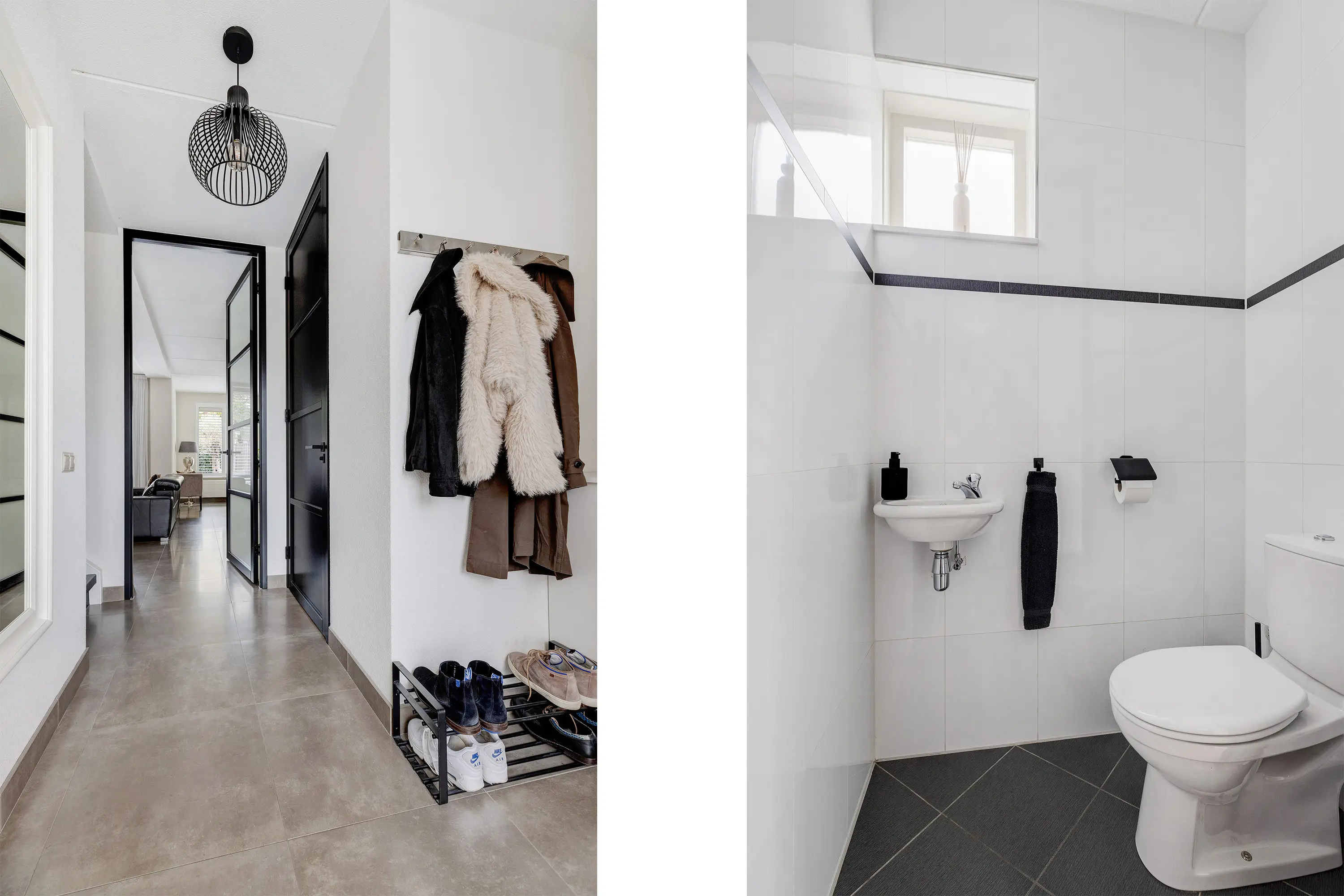 De entree biedt toegang tot de hal met meterkast, garderobe en een modern, geheel betegeld toilet met fonteintje.