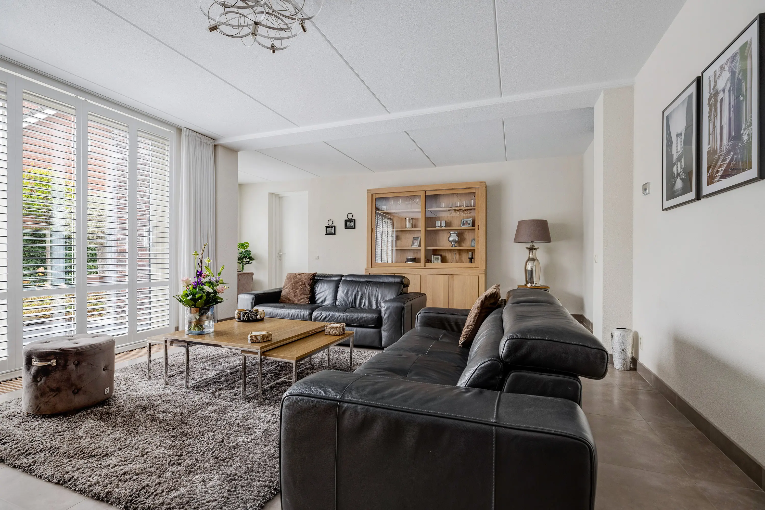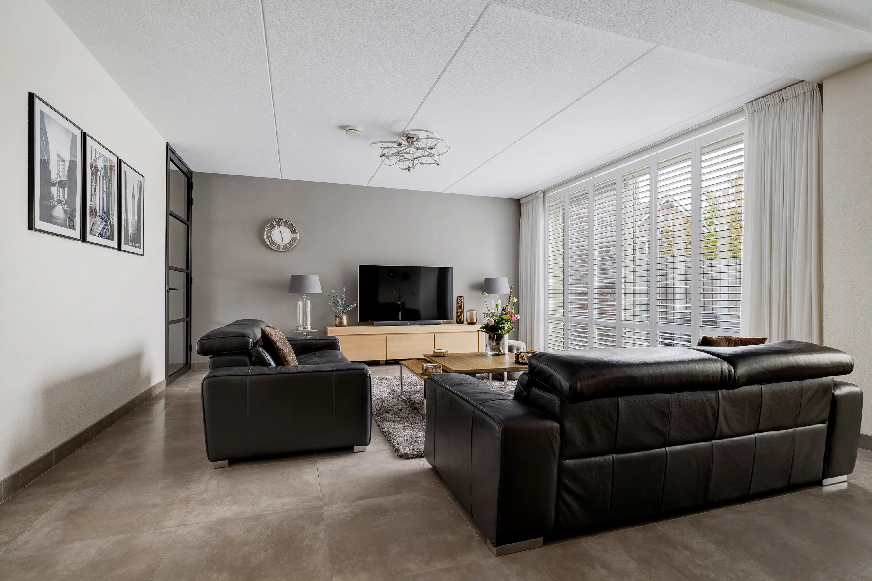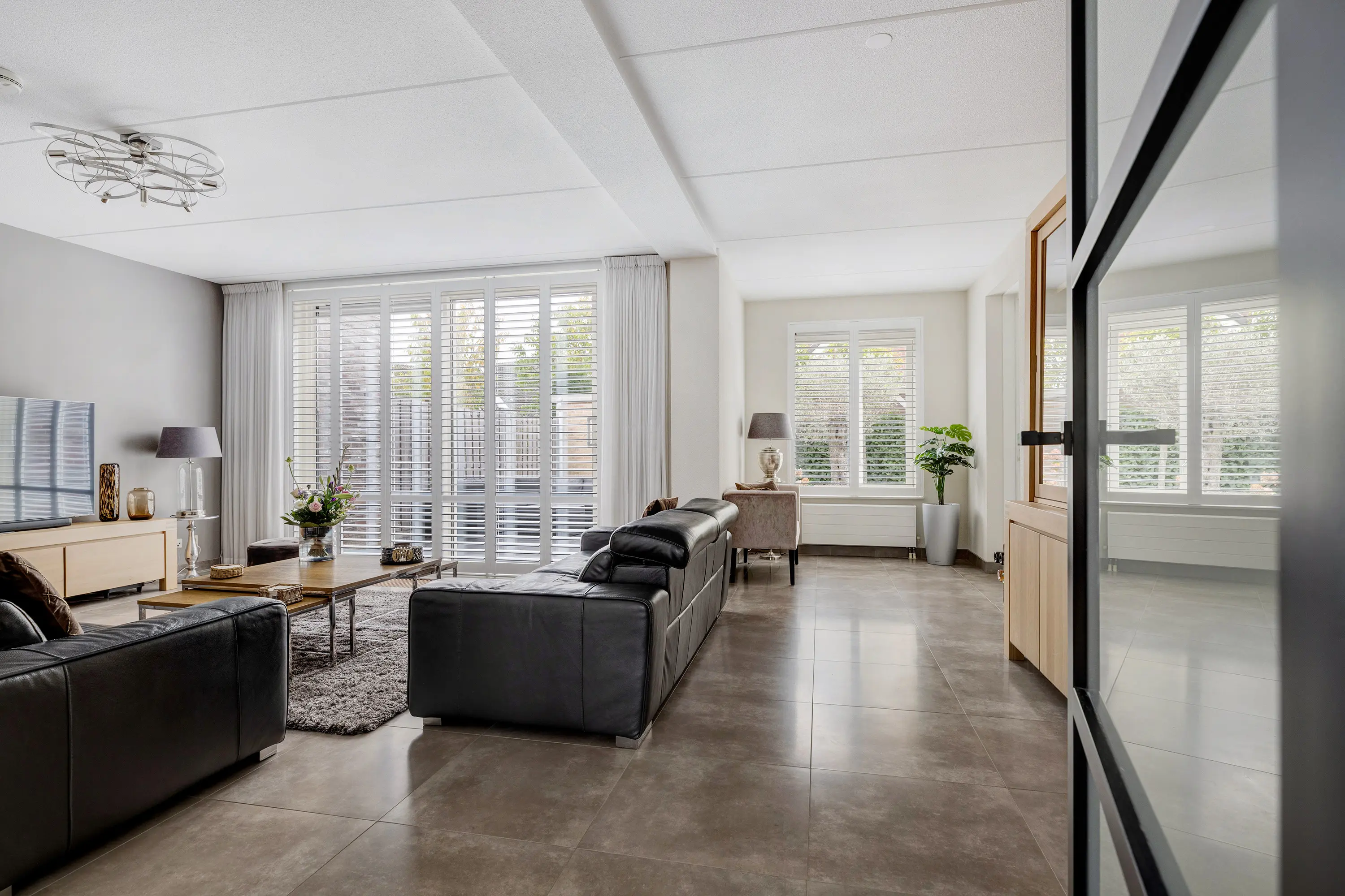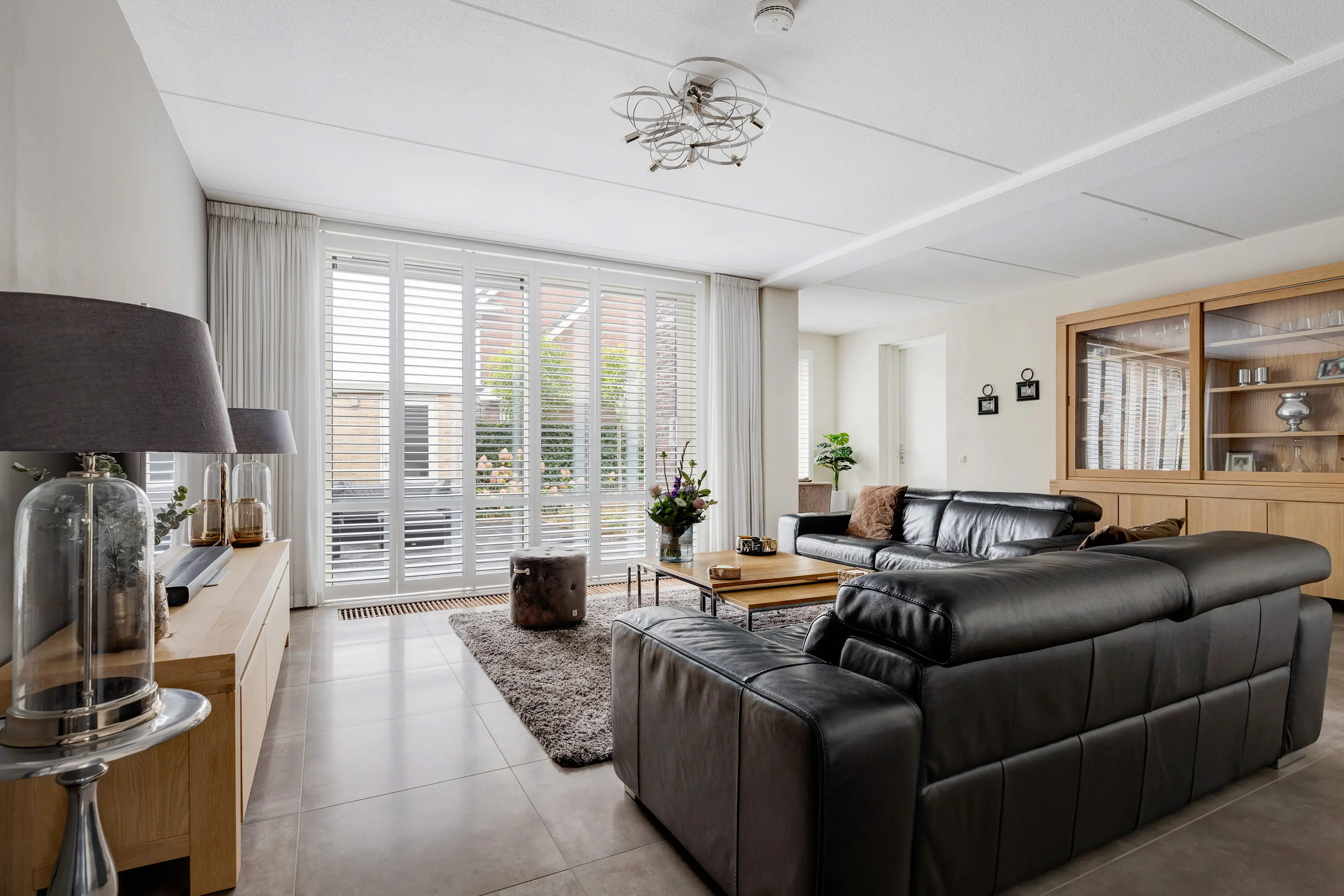 Een hoge zwarte glazen paneeldeur geeft toegang tot de lichte woonkamer met grote grijze plavuizen voorzien van vloerverwarming. De woonkamer is sfeervol ingedeeld, met een grote schuifpui naar de zonnige achtertuin en witte shutters voor de ramen die zorgen voor privacy en stijl. Vanuit de woonkamer is er tevens toegang tot de garage.