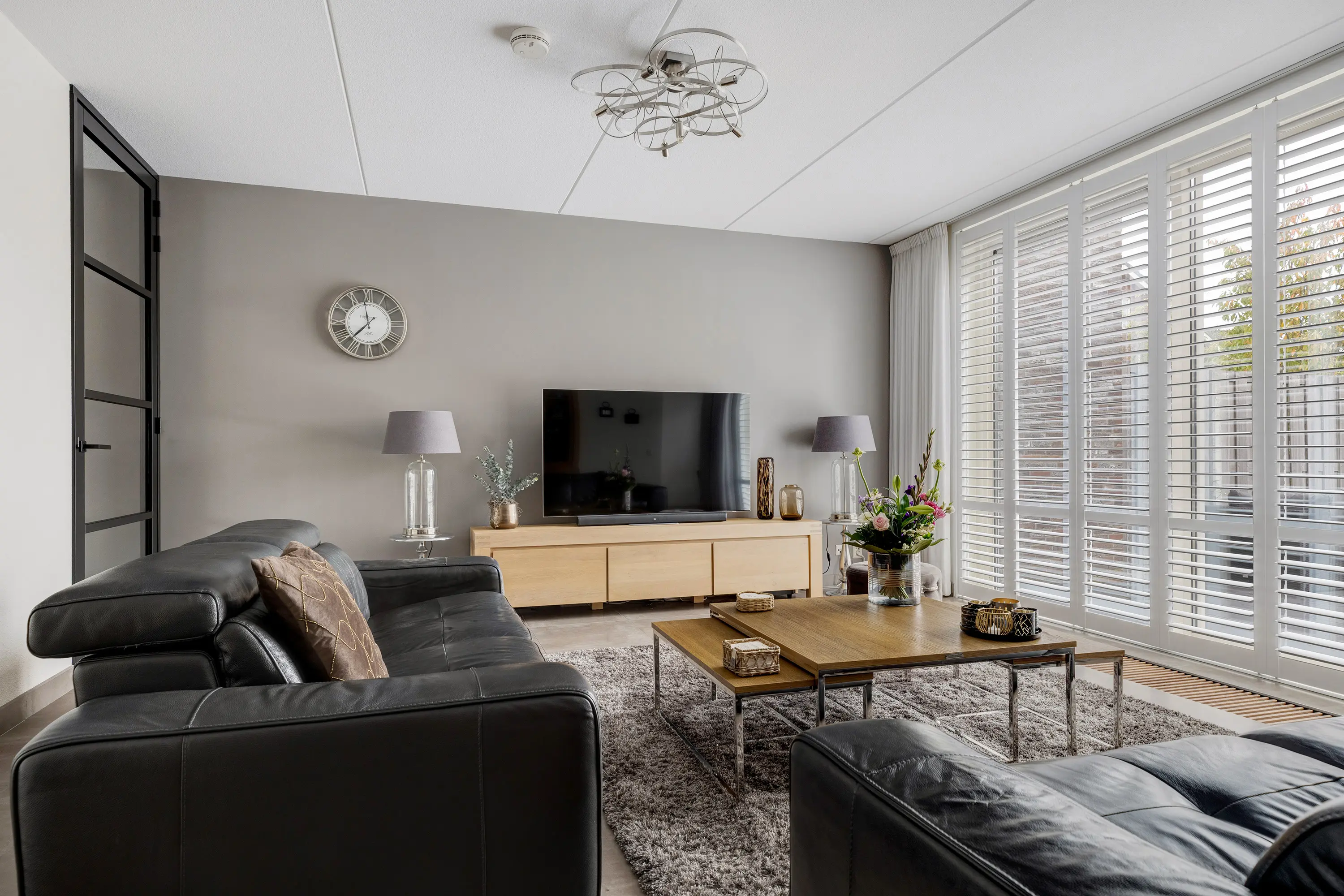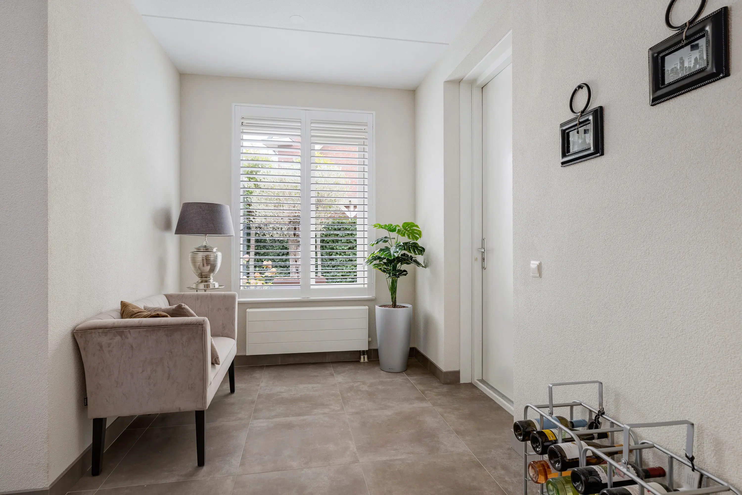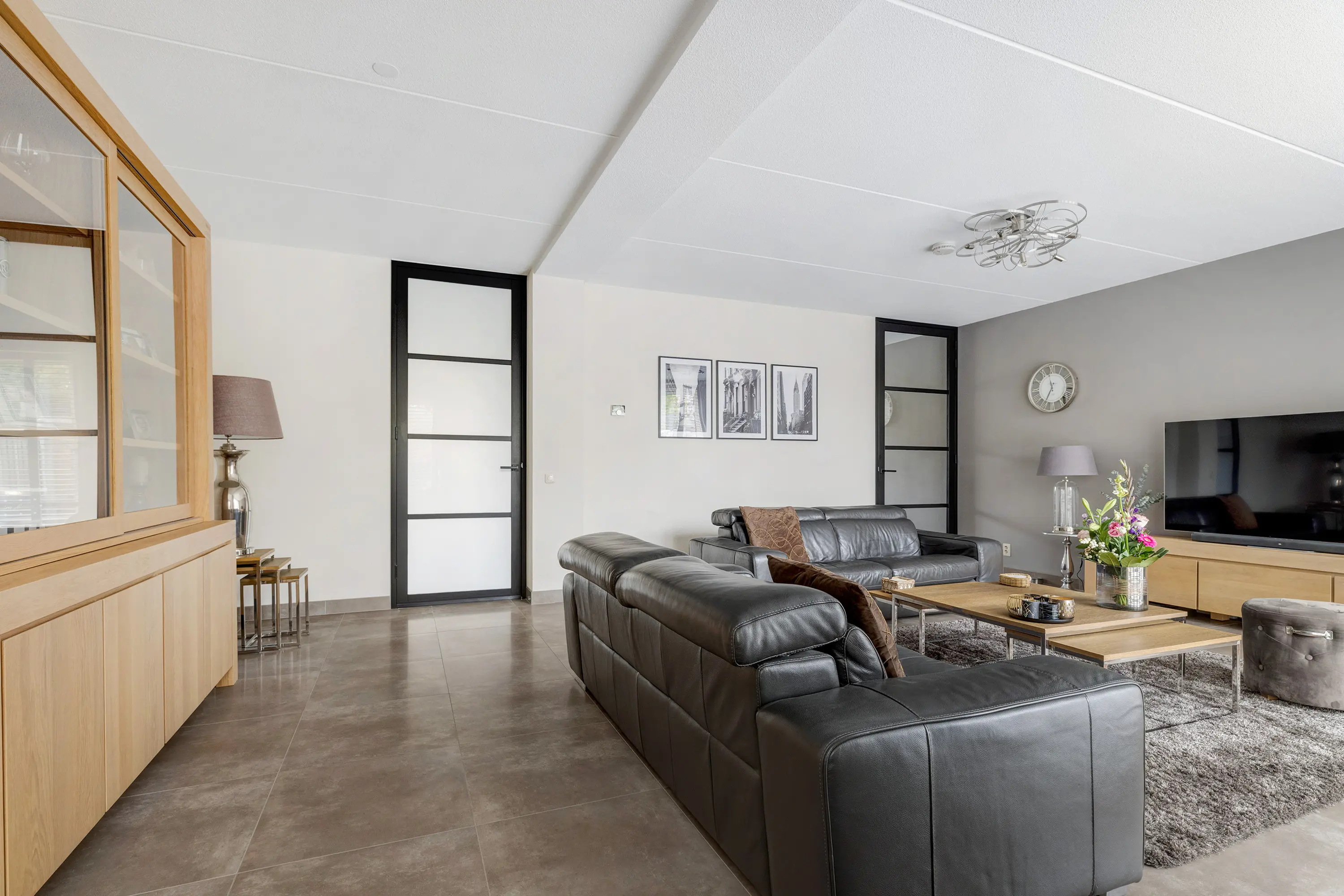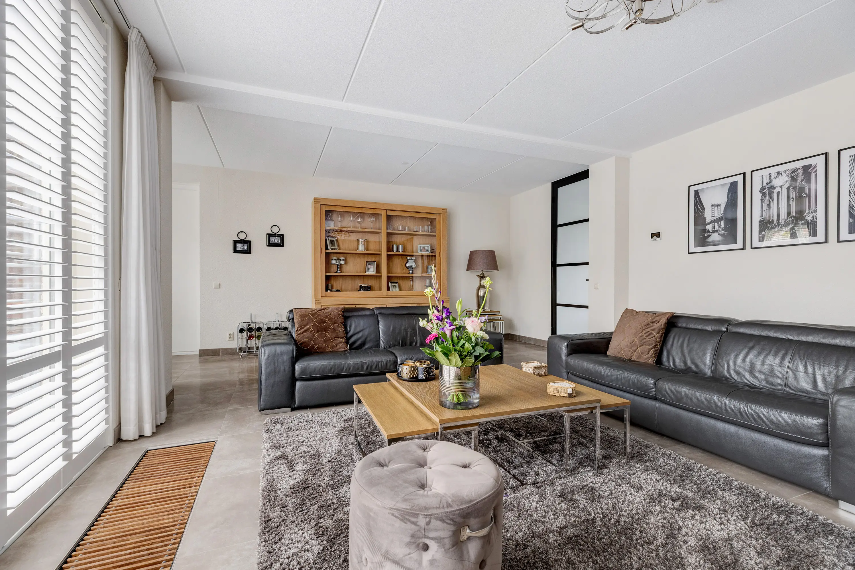 Een hoge zwarte glazen paneeldeur geeft toegang tot de lichte woonkamer met grote grijze plavuizen voorzien van vloerverwarming. De woonkamer is sfeervol ingedeeld, met een grote schuifpui naar de zonnige achtertuin en witte shutters voor de ramen die zorgen voor privacy en stijl. Vanuit de woonkamer is er tevens toegang tot de garage.