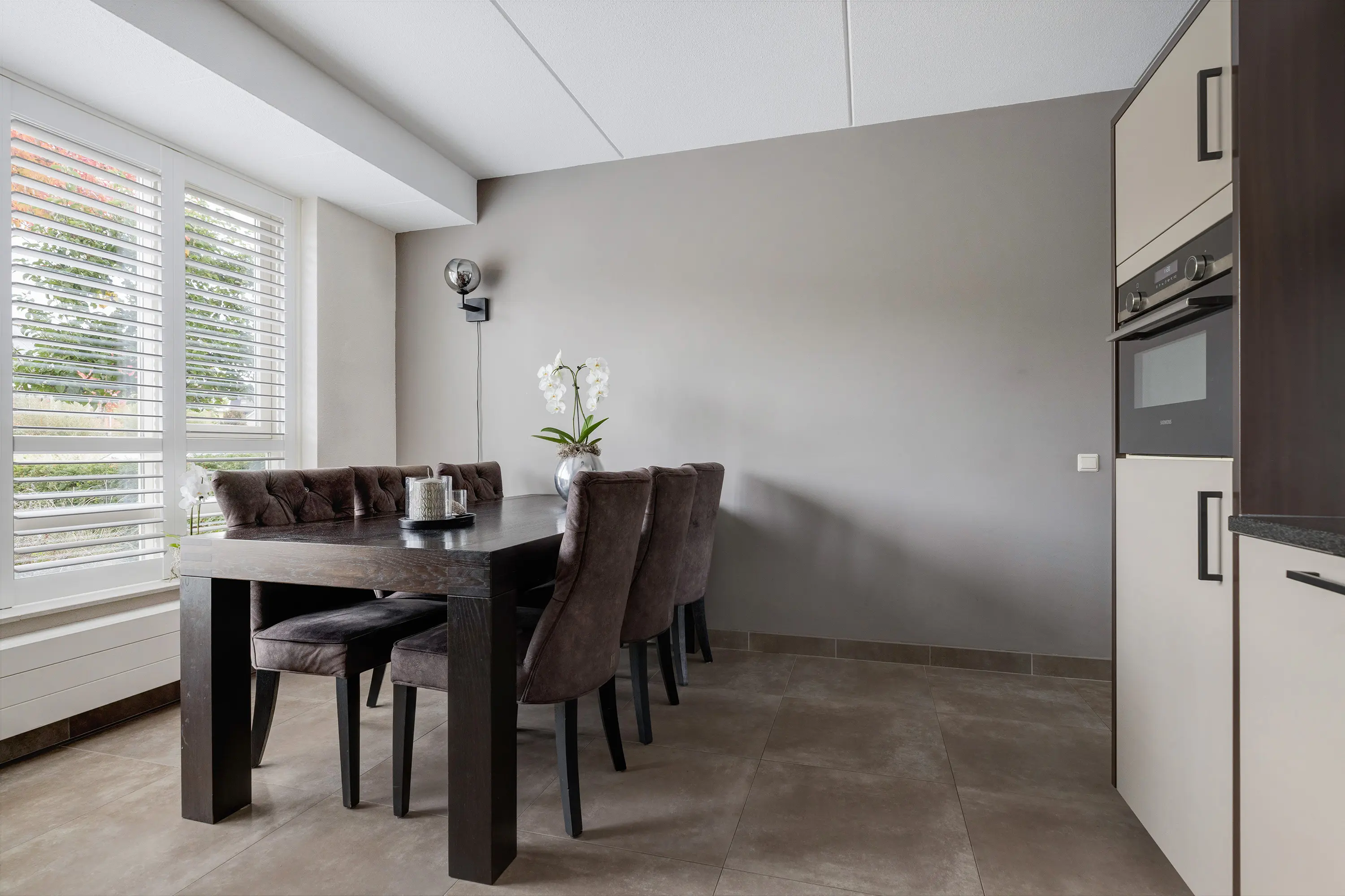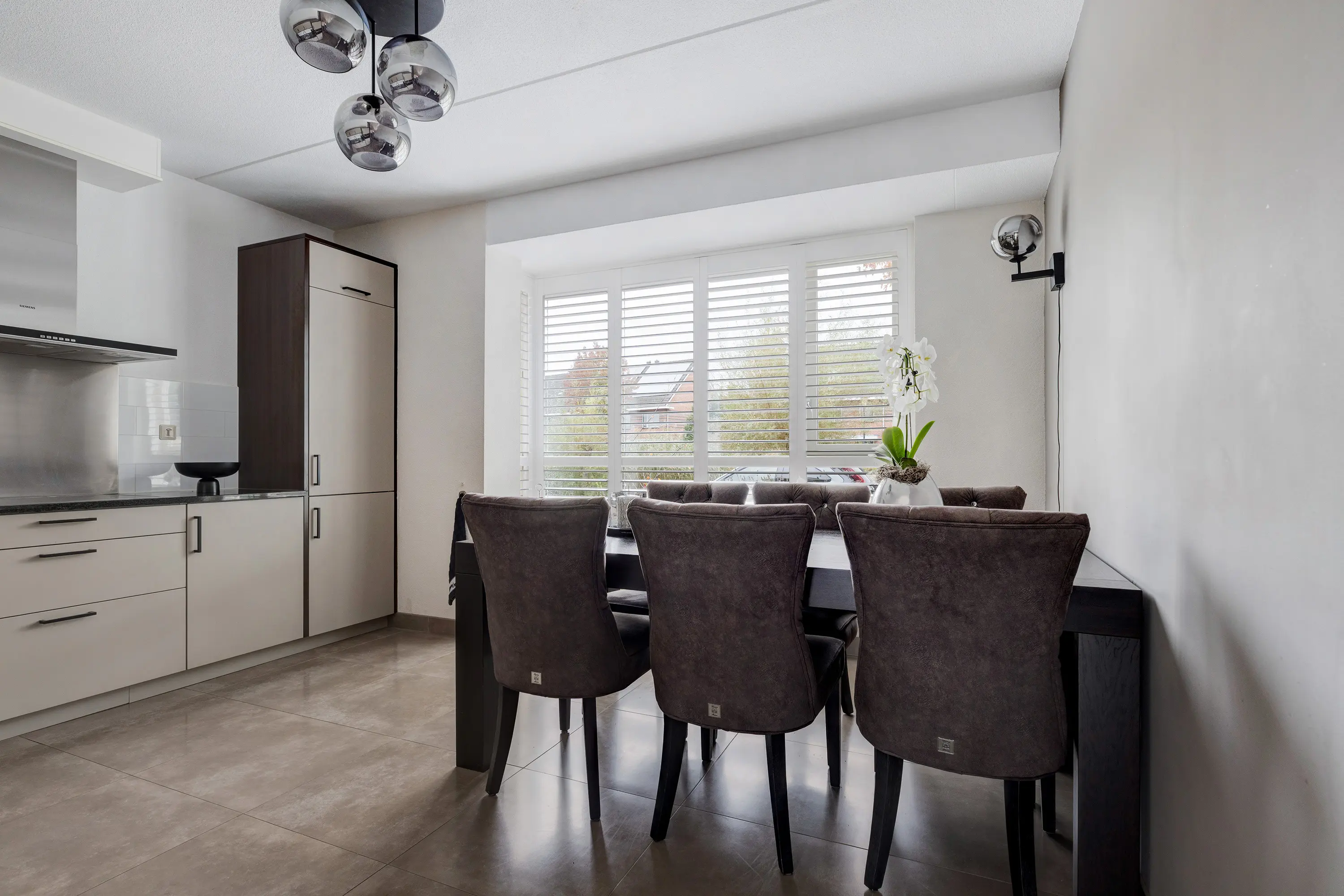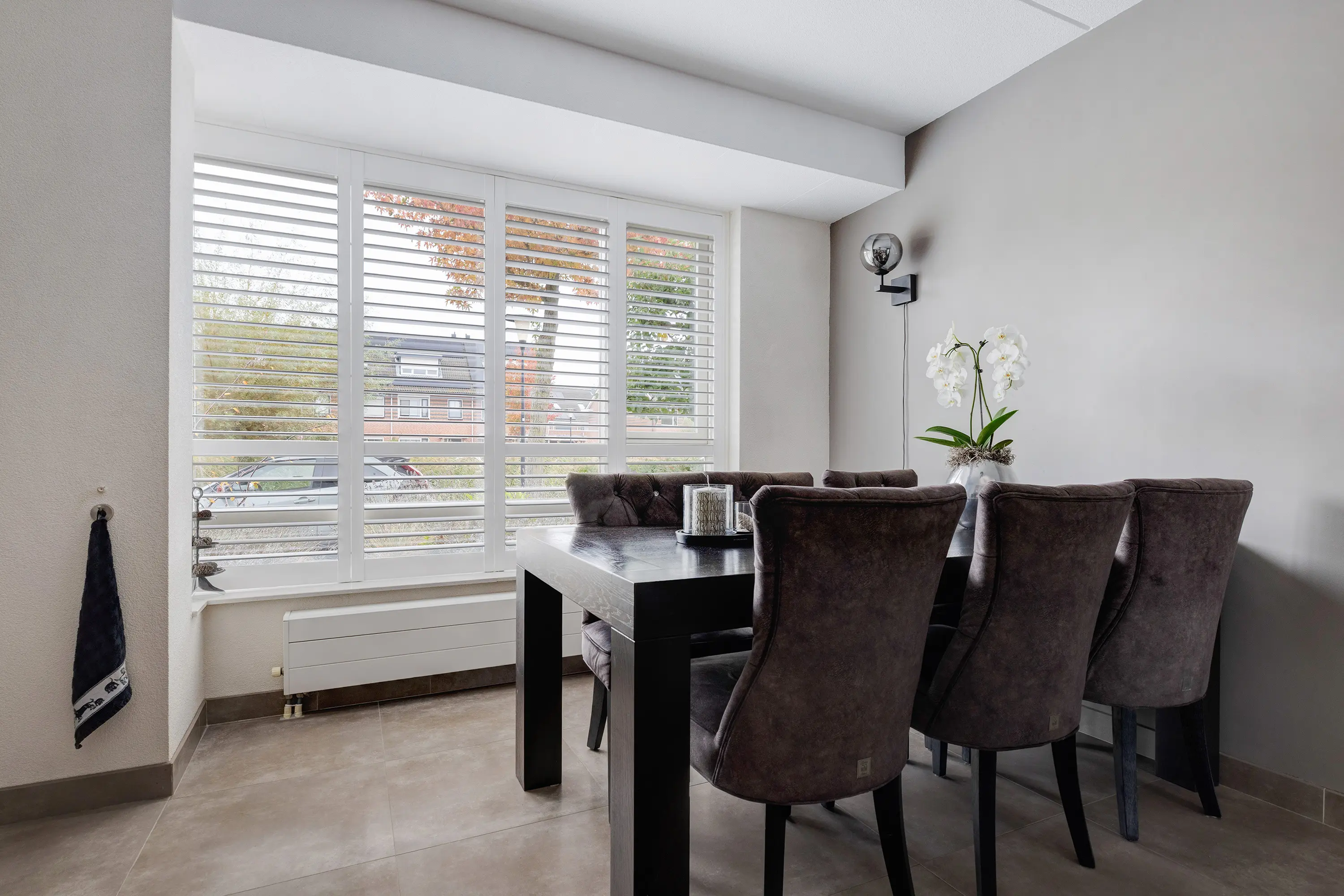 De grote raampartijen met shutters zorgen voor veel licht en een gezellig uitzicht op de voortuin, terwijl er voldoende ruimte is voor een eettafel, ideaal voor lange avonden tafelen met familie en vrienden.