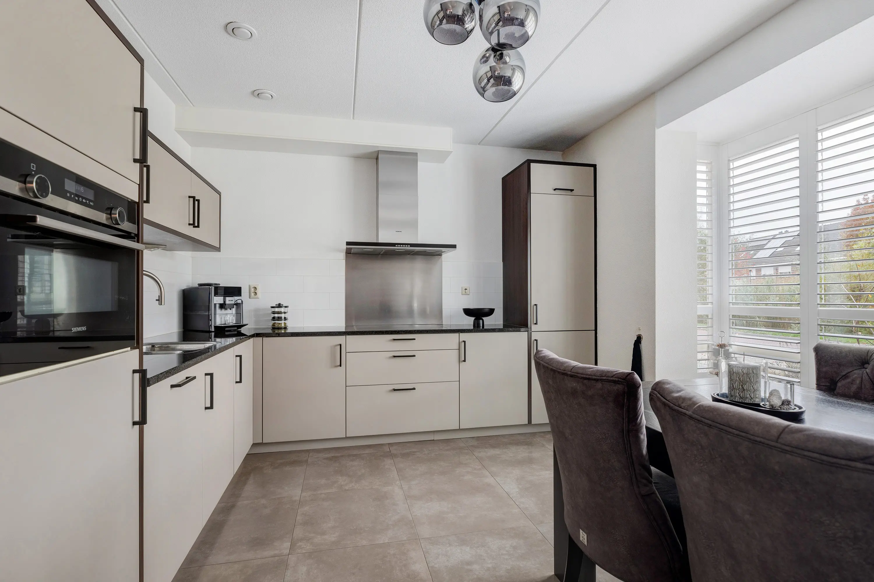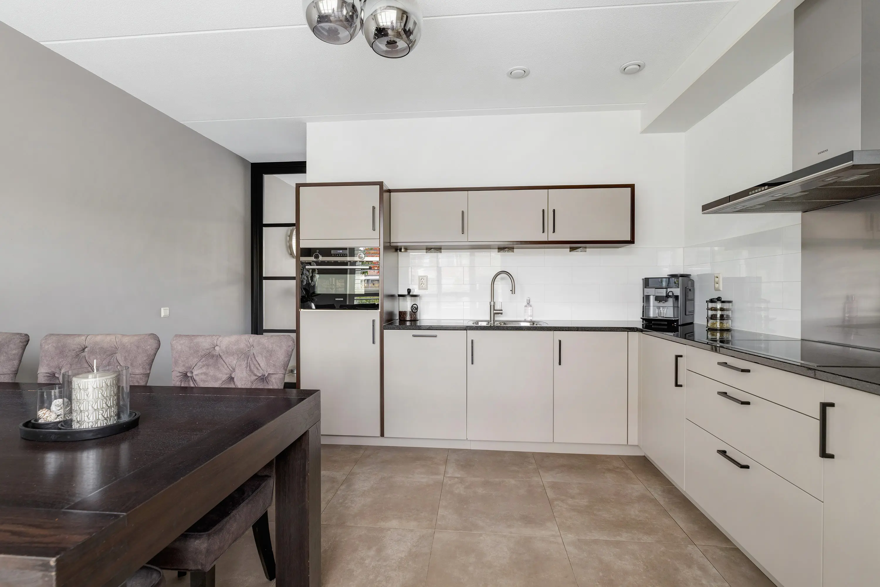 Aan de voorzijde bevindt zich de woonkeuken, afsluitbaar met een tweede zwarte glazen paneeldeur. De keuken is uitgevoerd in een chique taupe kleurstelling met een donker natuurstenen werkblad en voorzien van diverse inbouwapparatuur zoals een koel-/vriescombinatie, combi-oven, 4-pits inductiekookplaat met RVS-afzuigkap, vaatwasser en een Quooker Flex-kraan