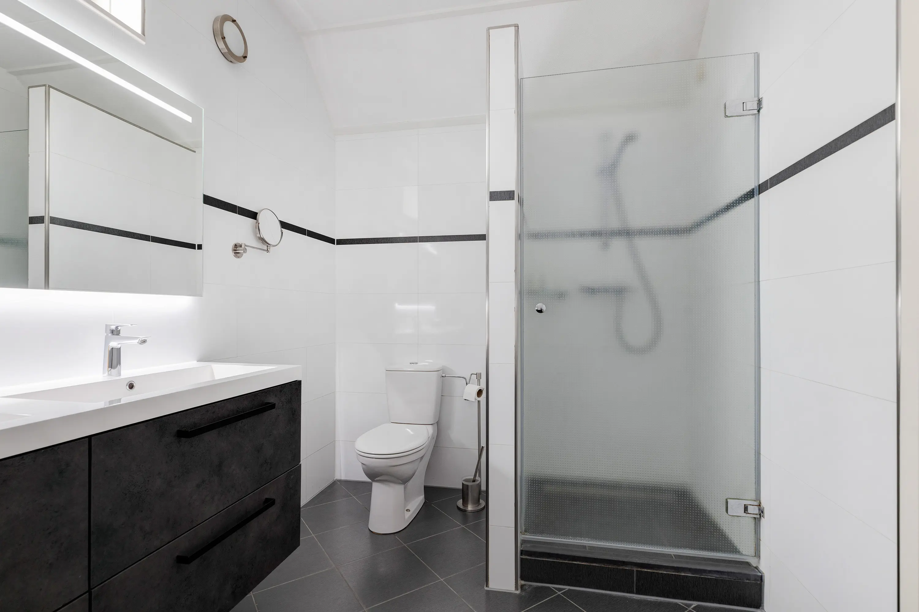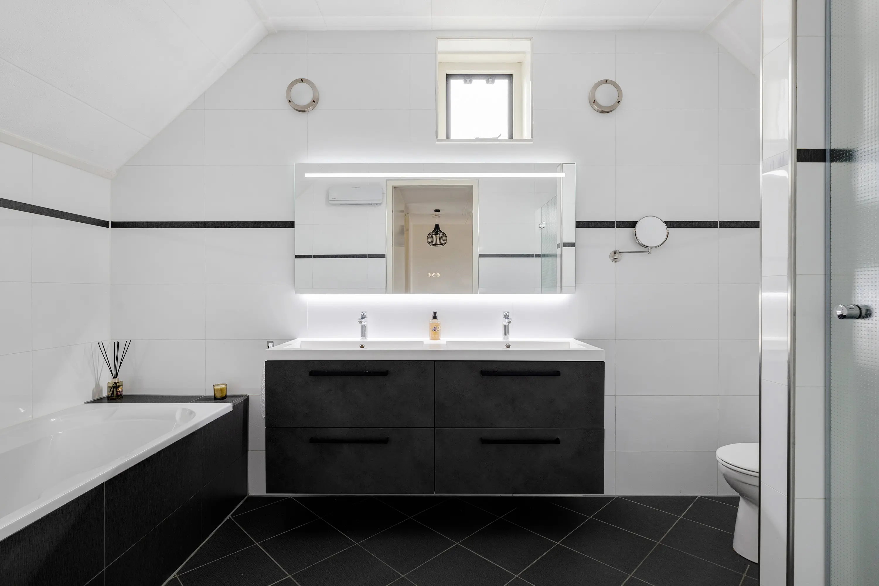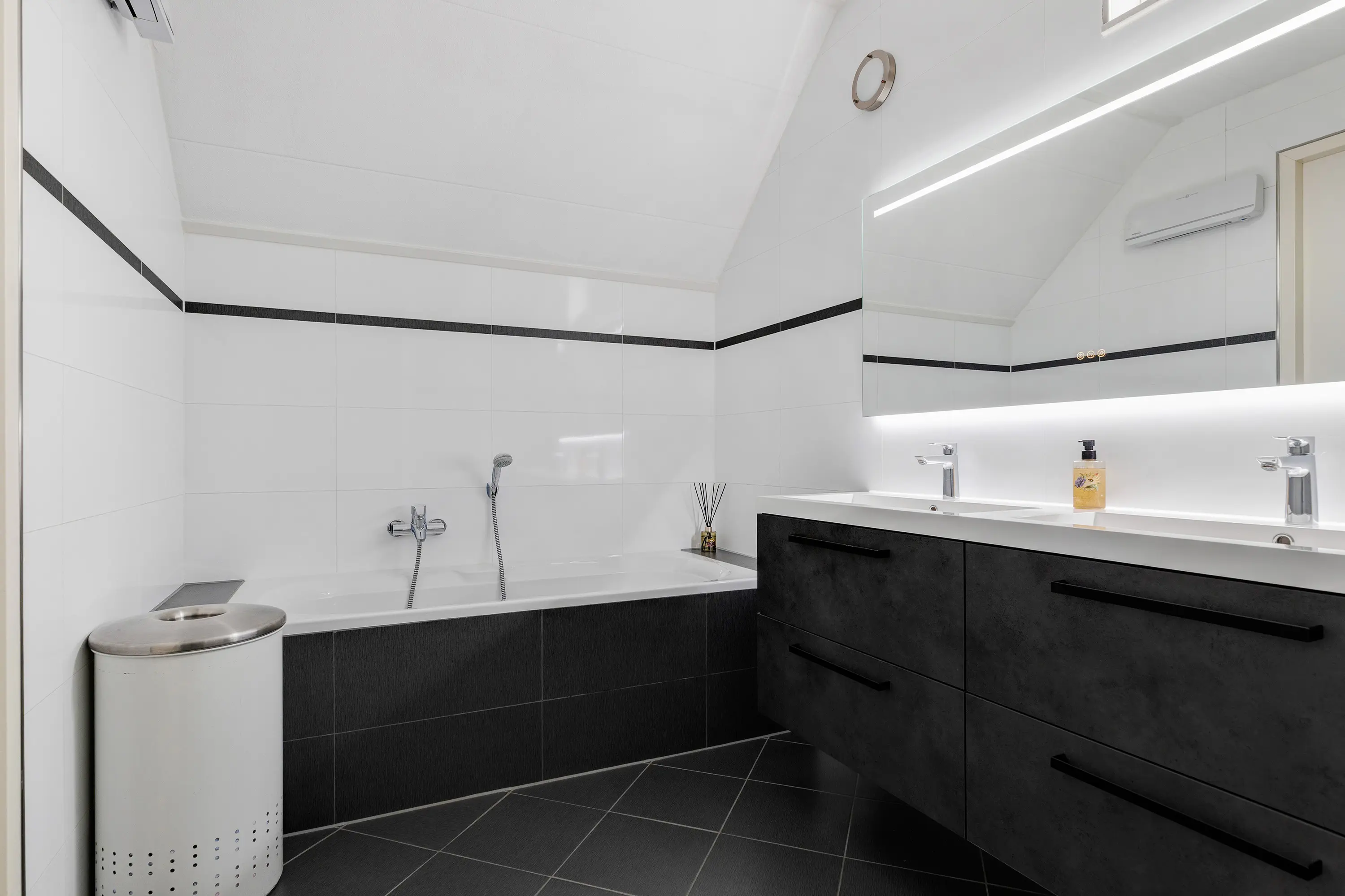 De badkamer is ruim en luxe uitgevoerd met een ligbad, aparte inloopdouche met glazen douchewand, tweede toilet, en een dubbel wastafelmeubel met verwarmde spiegel en verlichting. De vloer is voorzien van vloerverwarming en de afwerking in wit-grijze tinten geeft de ruimte een moderne, frisse uitstraling.